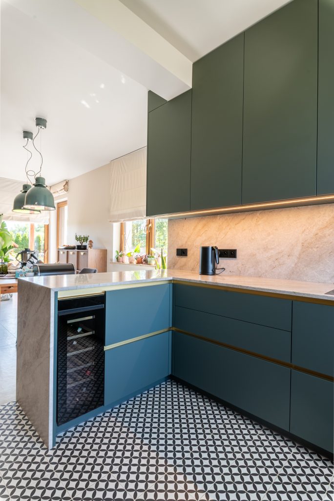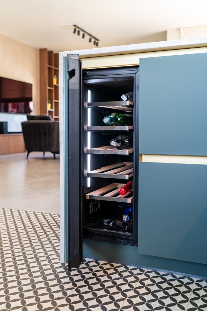 - z winiarką – elegancki i funkcjonalny dodatek, idealny dla miłośników dobrego wina. Zabudowana w wyspie winiarka nie tylko świetnie się prezentuje, ale też ułatwia dostęp do ulubionych trunków podczas spotkań z gośćmi lub kolacji we dwoje.