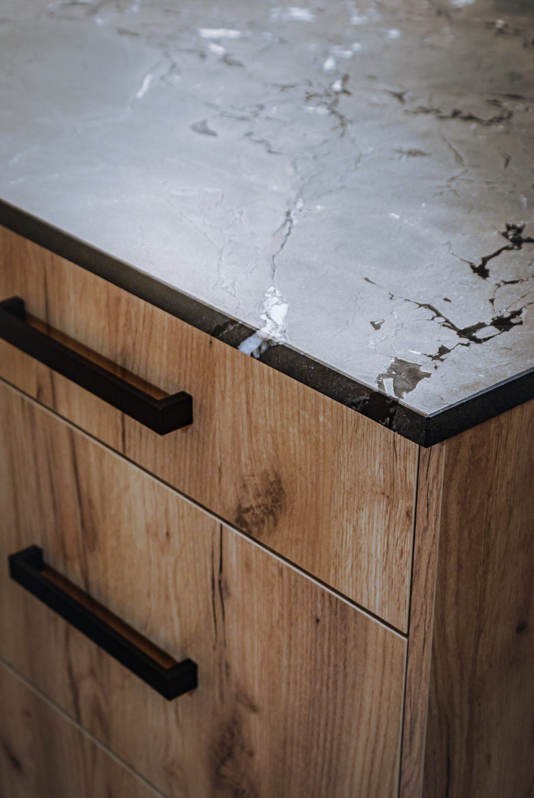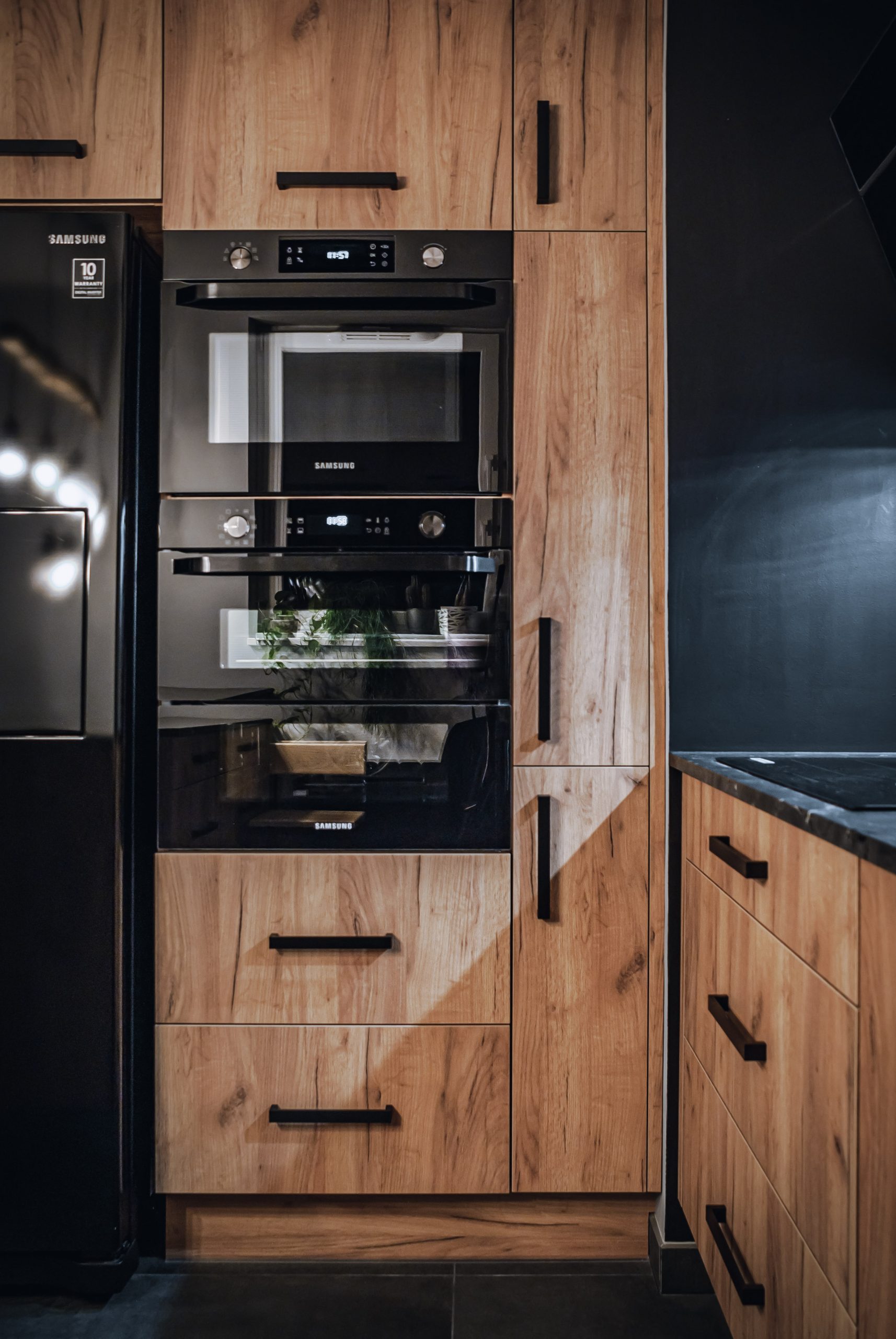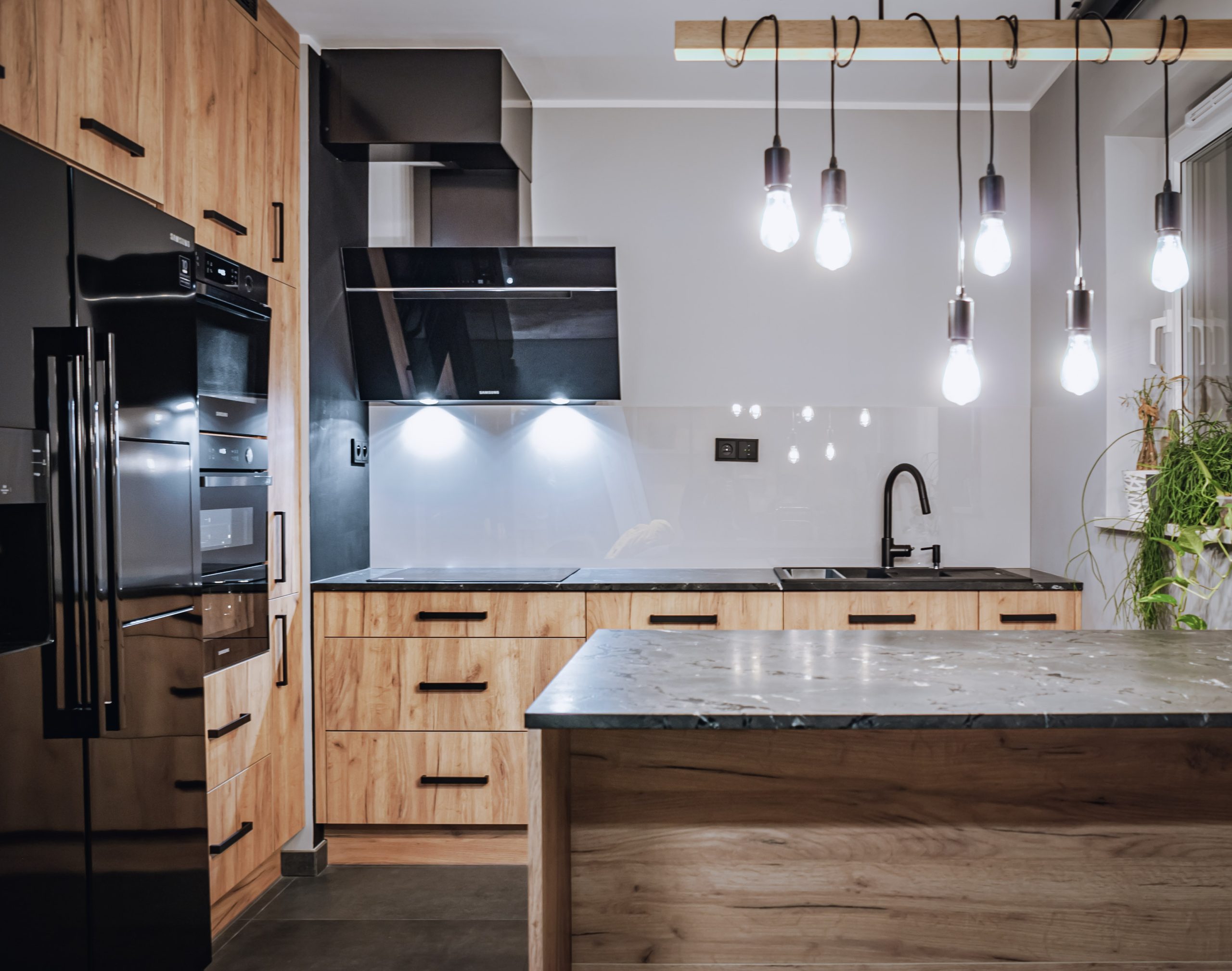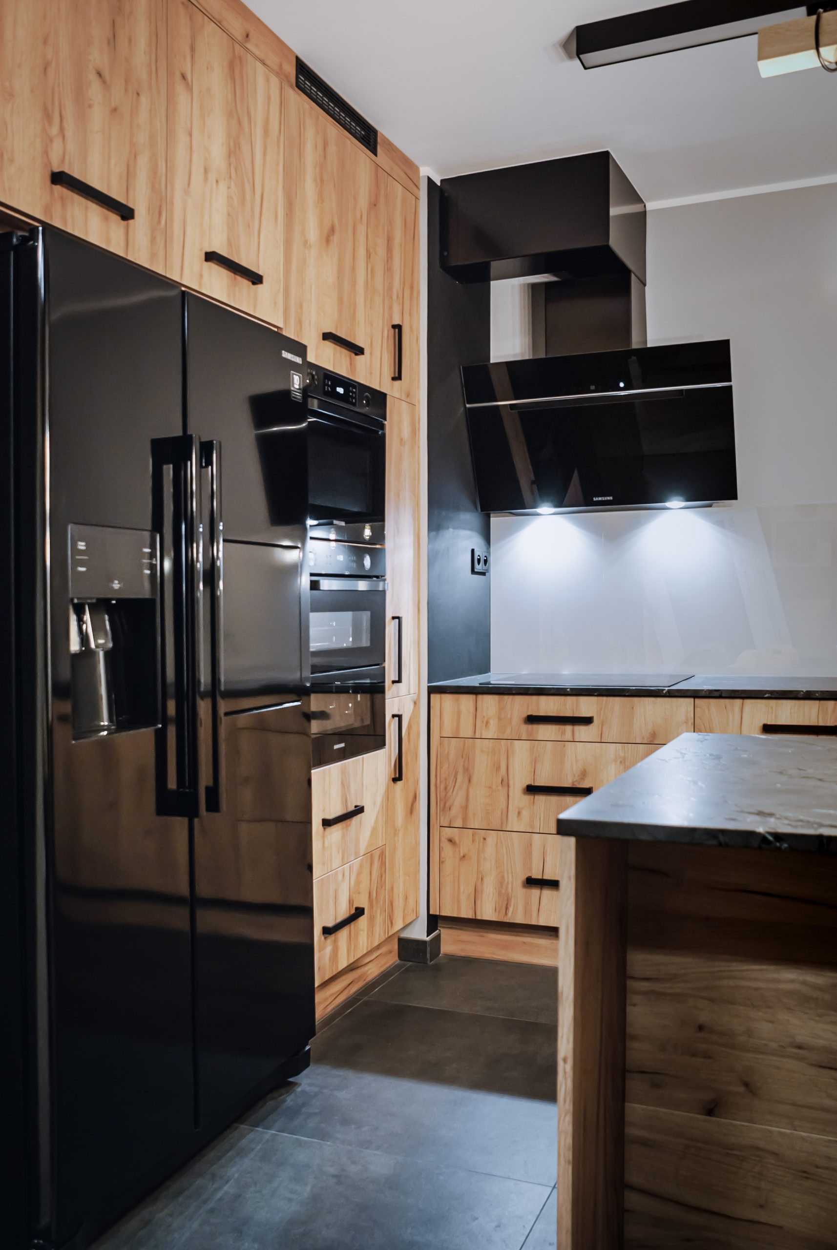 Projekt mieszkania dla osoby, która lubi mocne czarne dodatki. W kuchni oprócz klasycznego drewnianego dekoru szafek, królują ciemne elementy wykończenia dodające meblom kuchennym industrialnego stylu. Masywne, szerokie uchwyty szafek zapewniają komfort użytkowania. Loftowa wisząca lampa nad kuchennym półwyspem podkreśla styl kuchni.