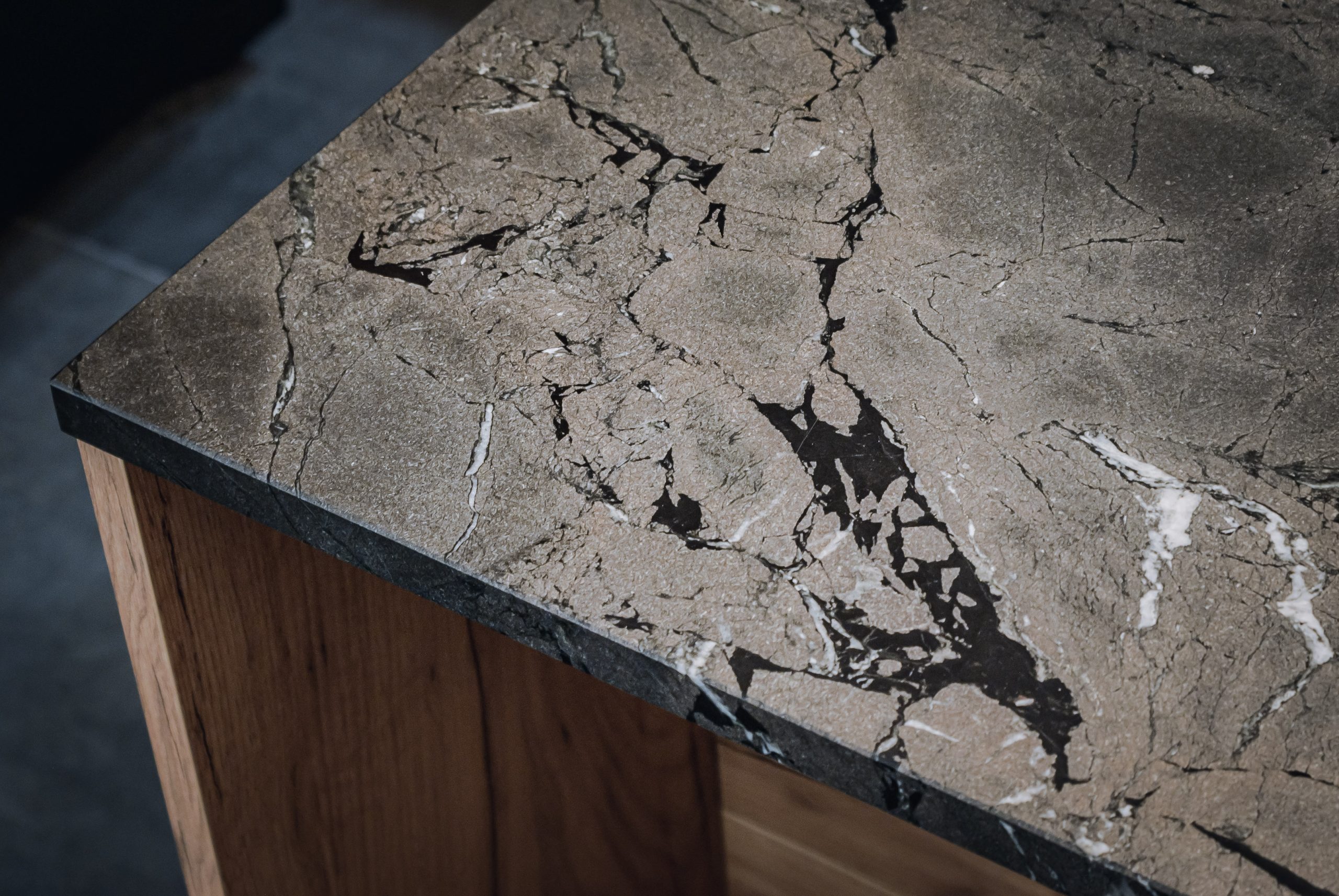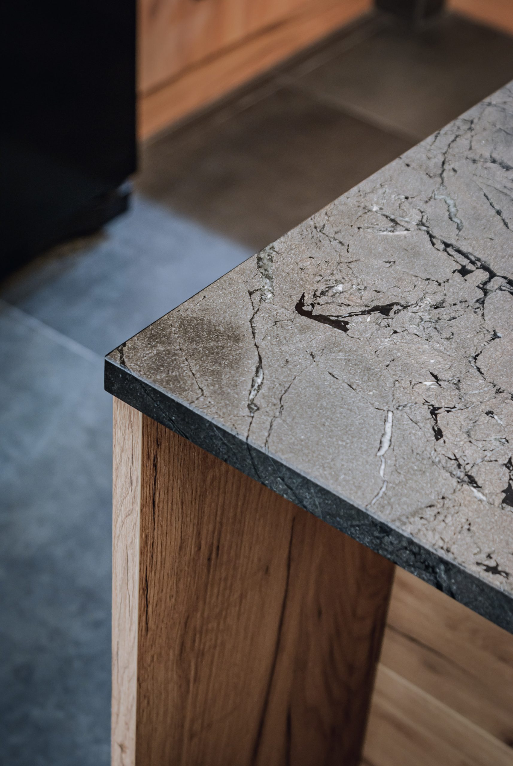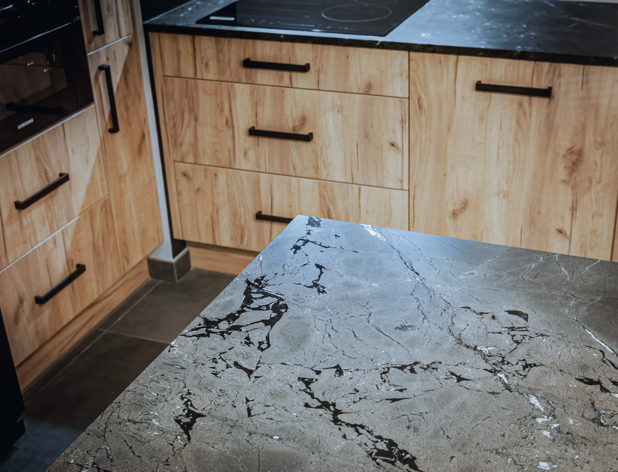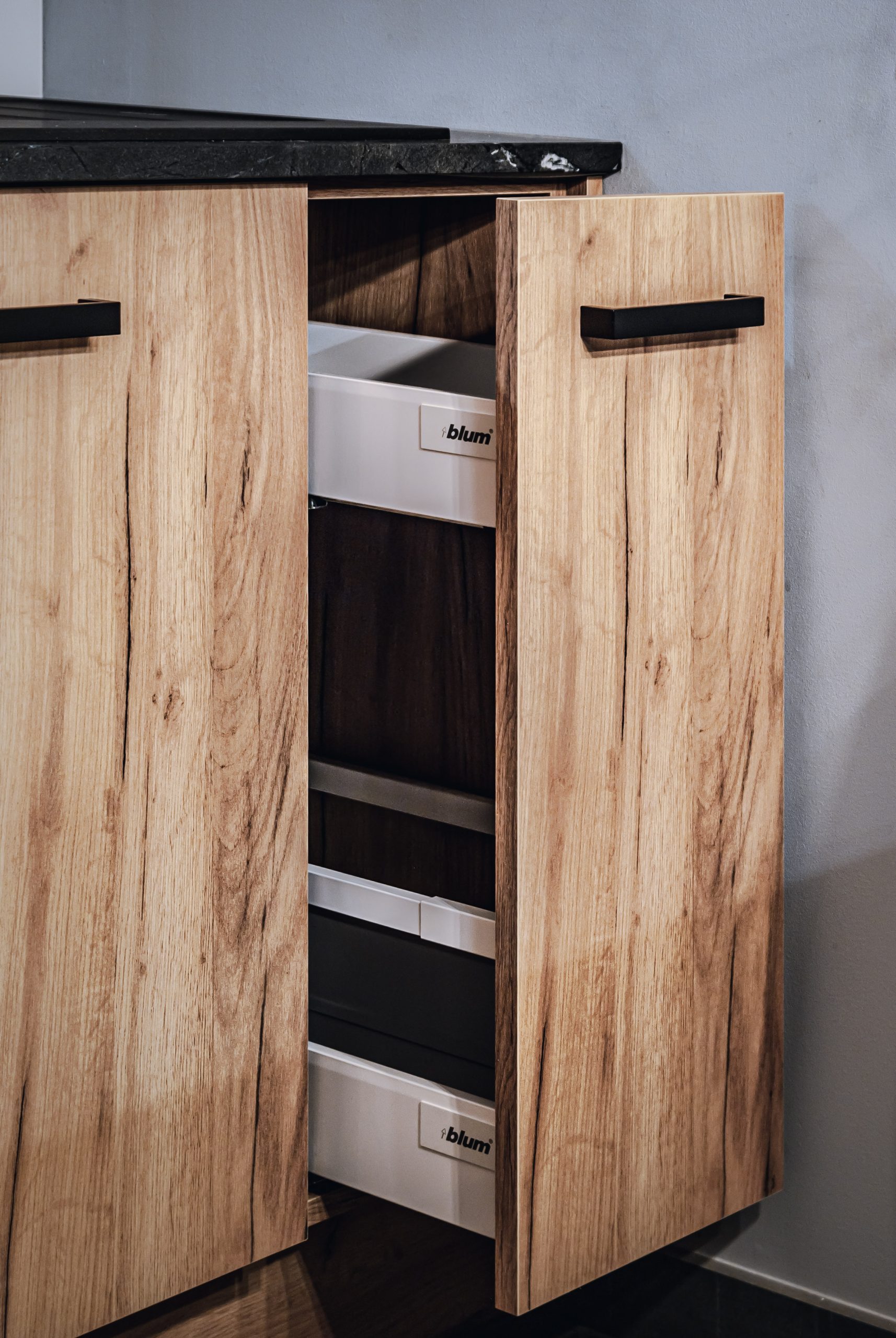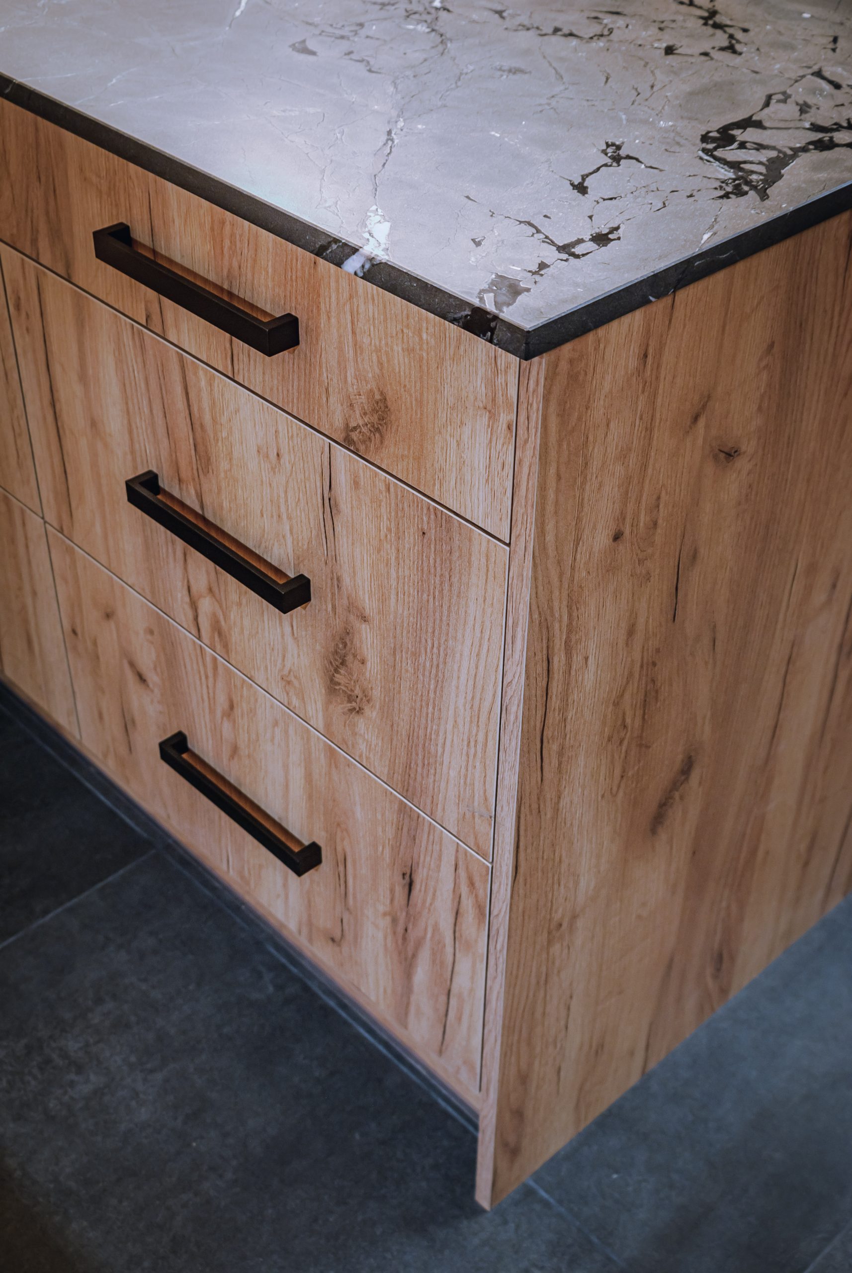 Projekt mieszkania dla osoby, która lubi mocne czarne dodatki. W kuchni oprócz klasycznego drewnianego dekoru szafek, królują ciemne elementy wykończenia dodające meblom kuchennym industrialnego stylu. Masywne, szerokie uchwyty szafek zapewniają komfort użytkowania. Loftowa wisząca lampa nad kuchennym półwyspem podkreśla styl kuchni.