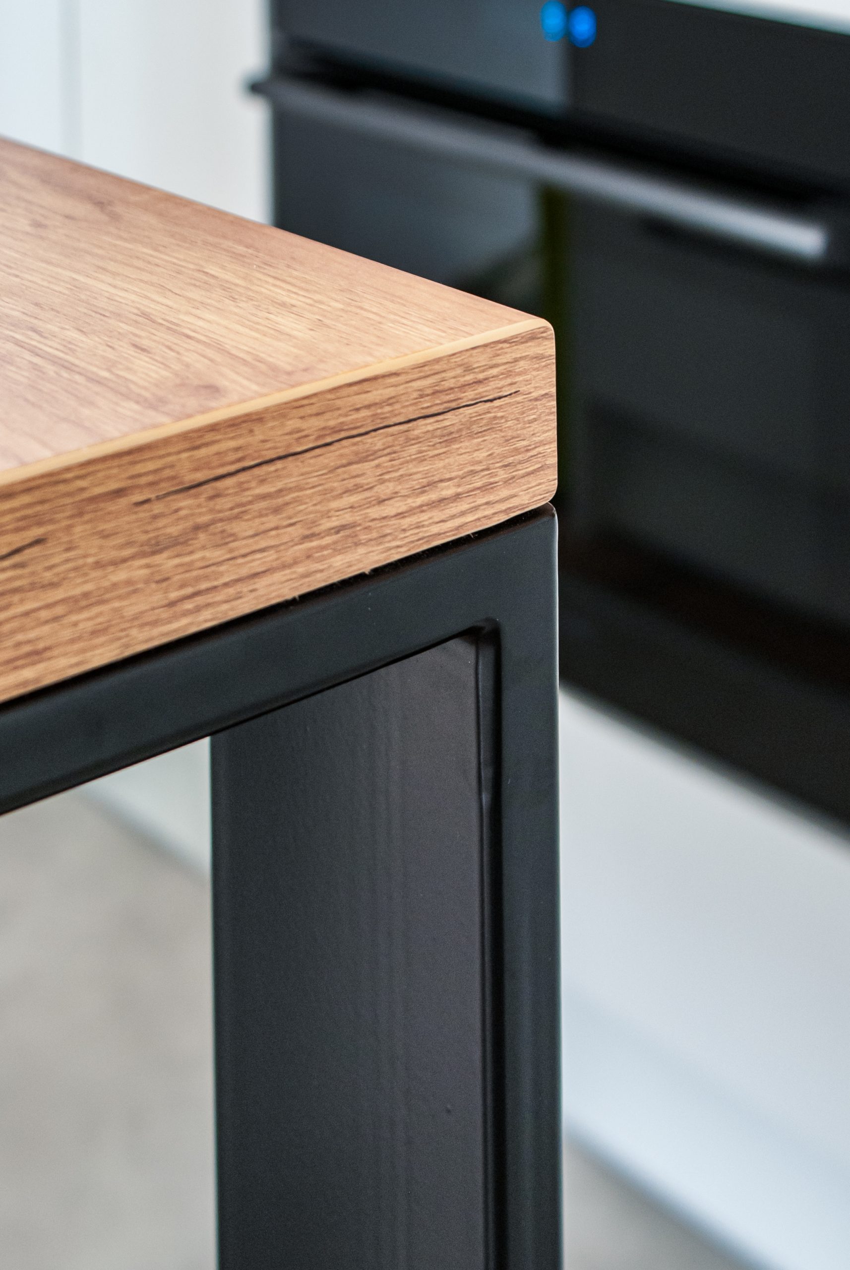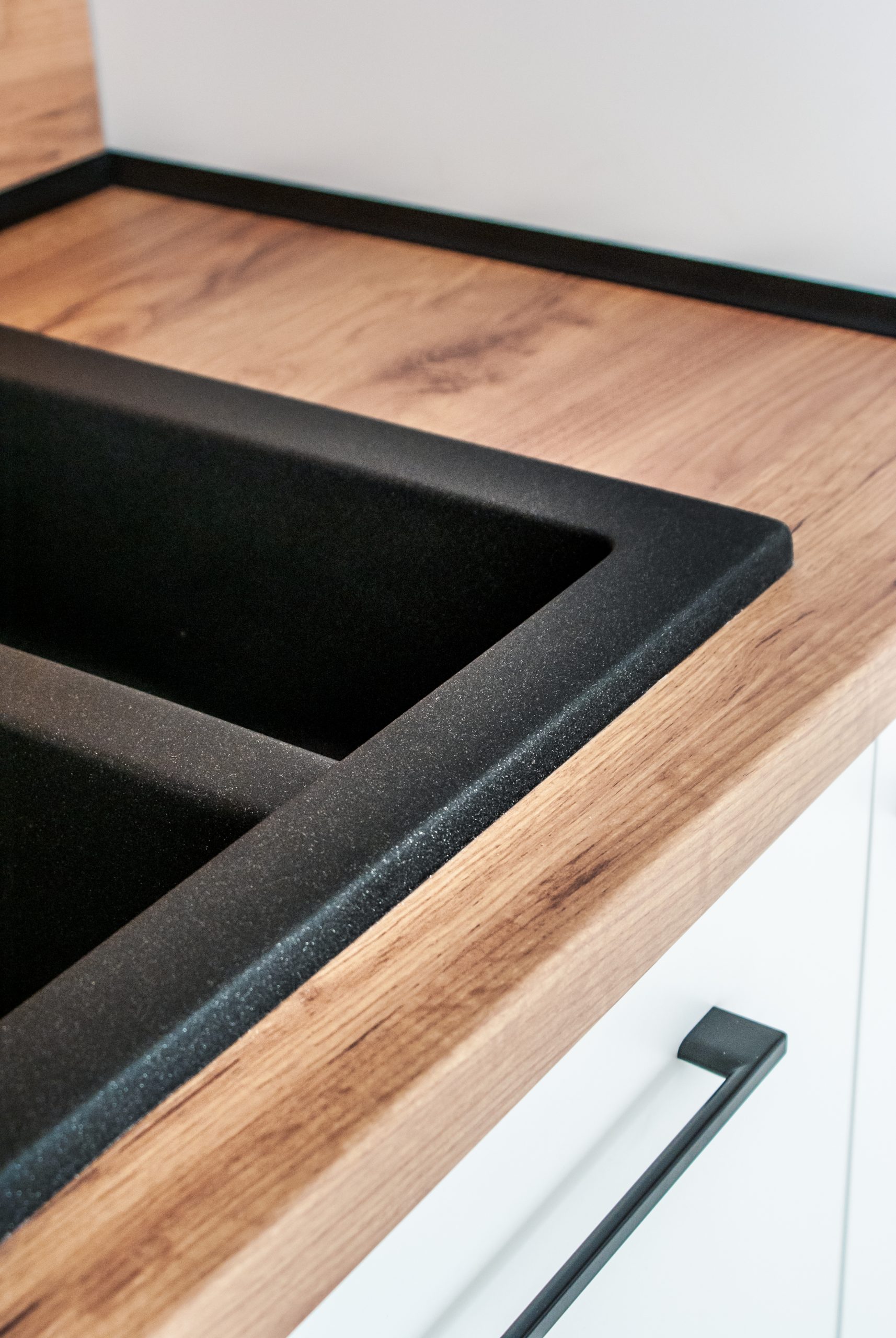 Aranżacja mieszkania z małą, ale perfekcyjnie rozplanowaną zabudową kuchenną. Zestawienie białych frontów z ciepłym dekorem drewna pozwoliło uzyskać wyjątkowo przytulną przestrzeń. Uzupełnienie mebli kuchennych o czarne dodatki nadaje jej niepowtarzalnego charakteru. Niebanalny pomysł na połączenie wyspy kuchennej z czarnym stołem jadalnianym otworzyło kuchnię na salon tworząc spójną całość.