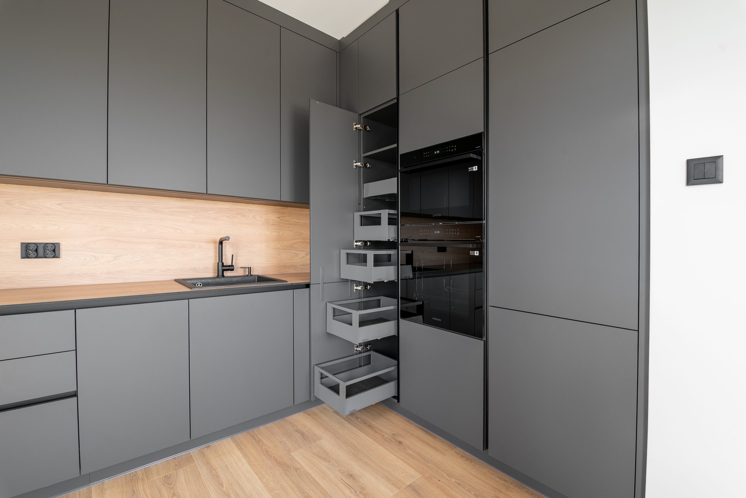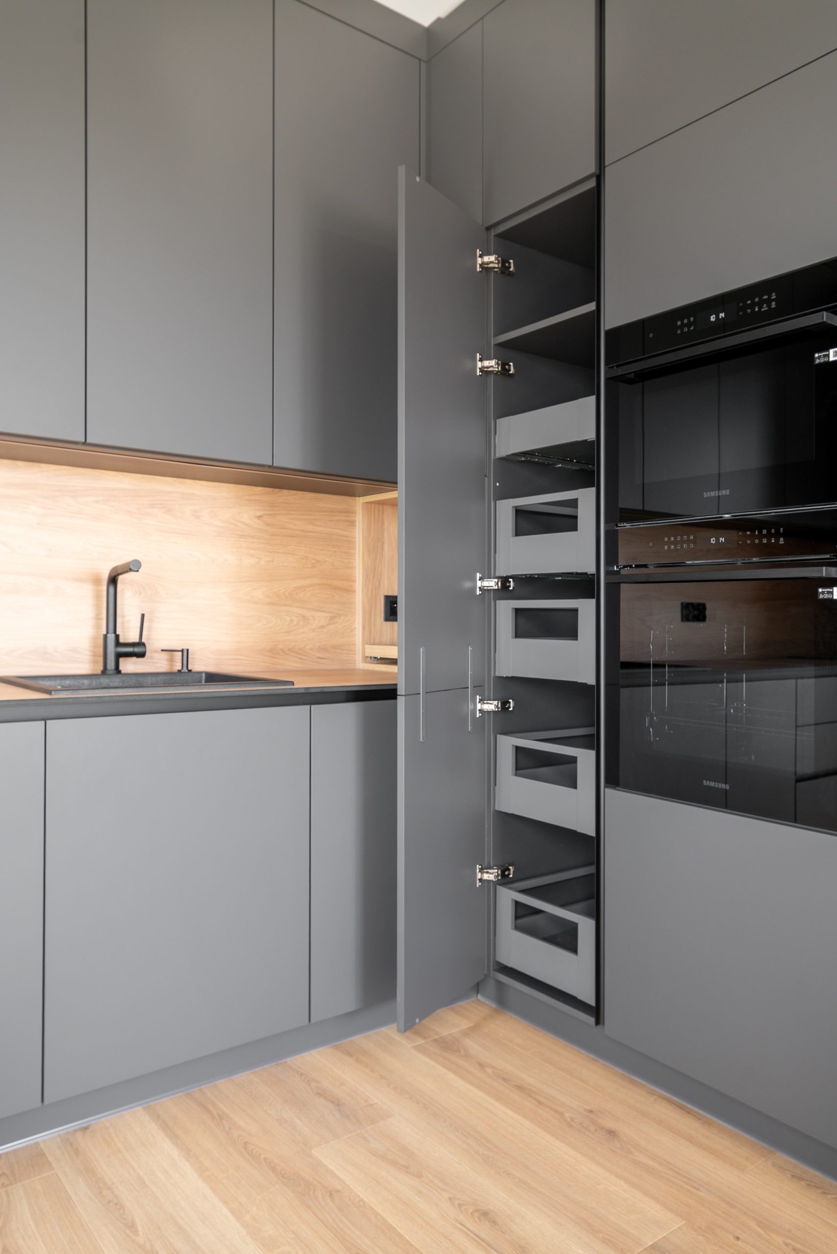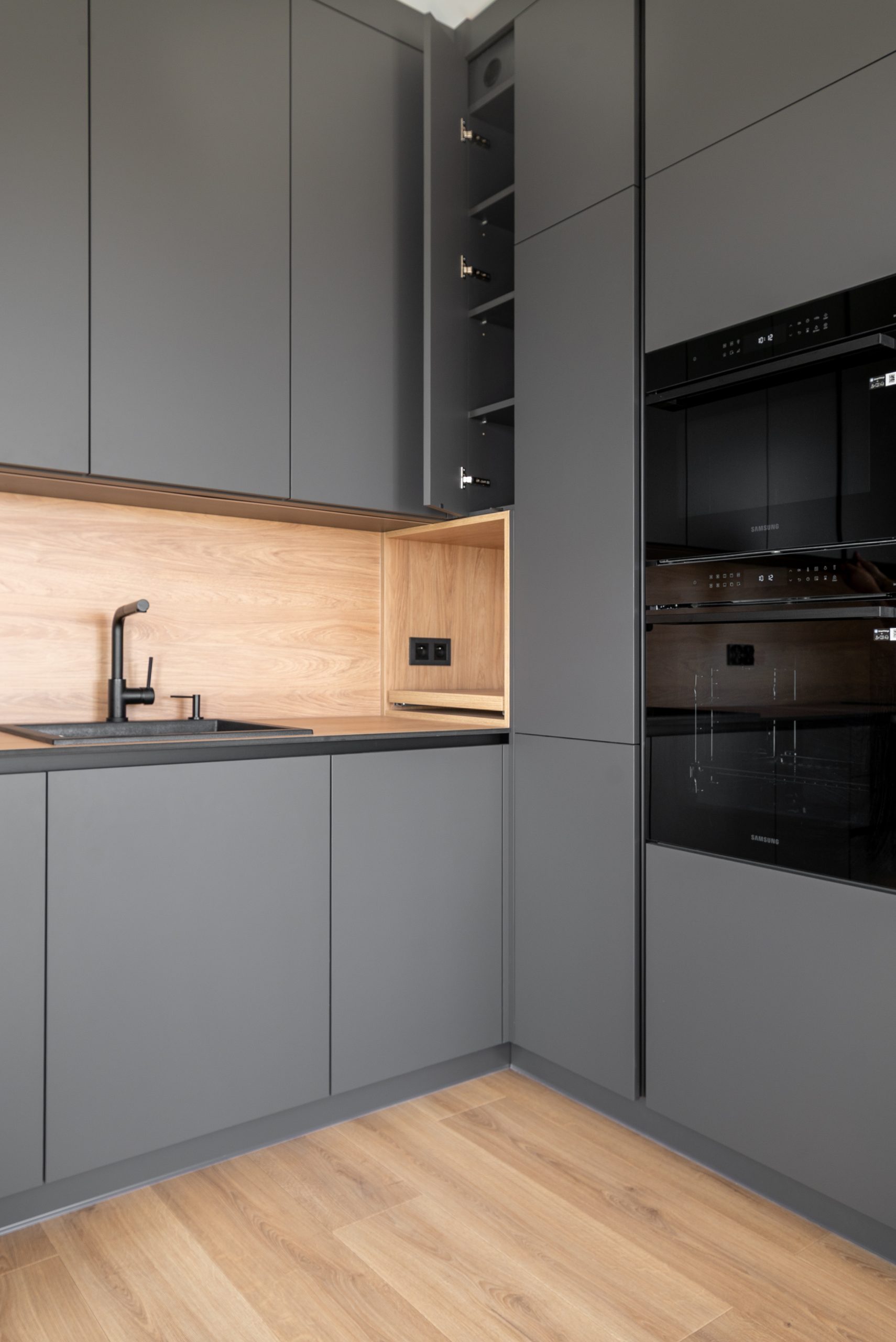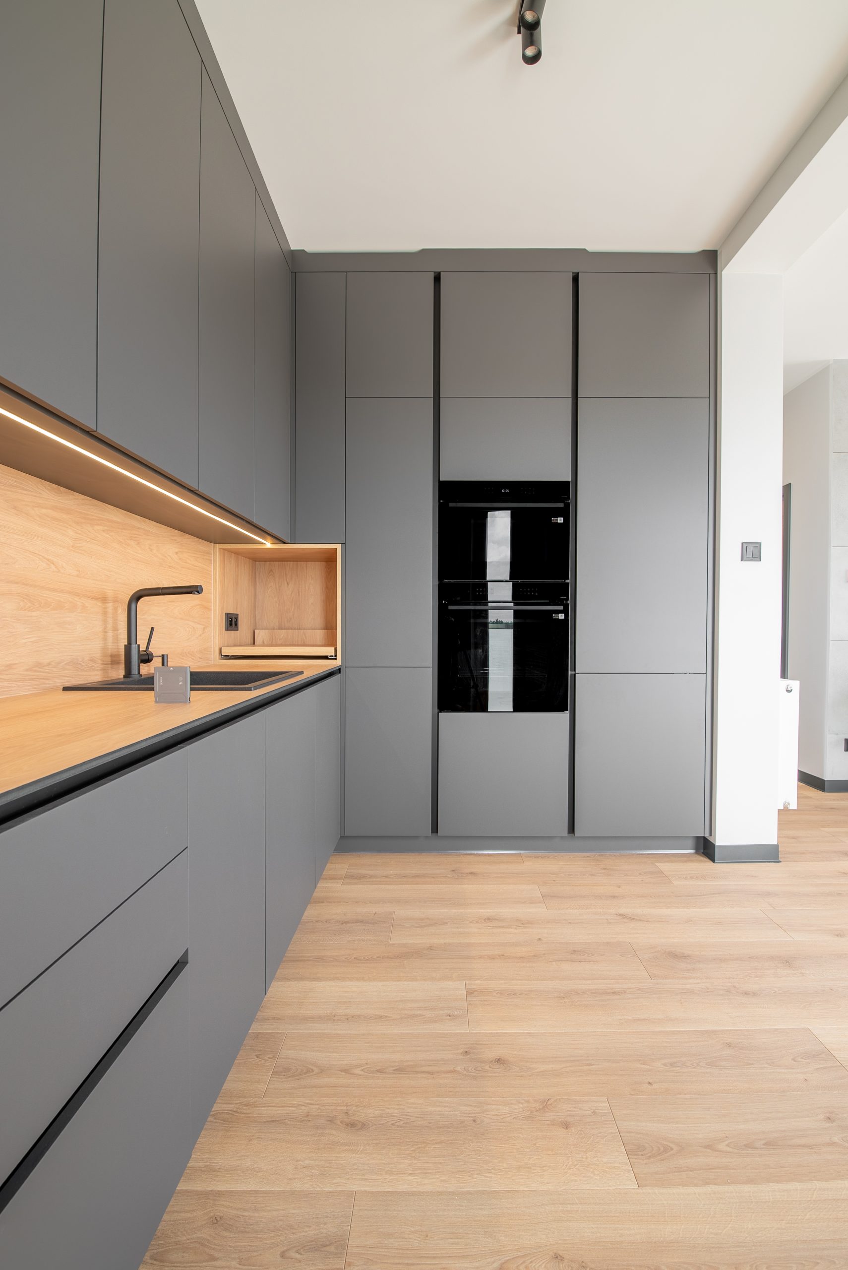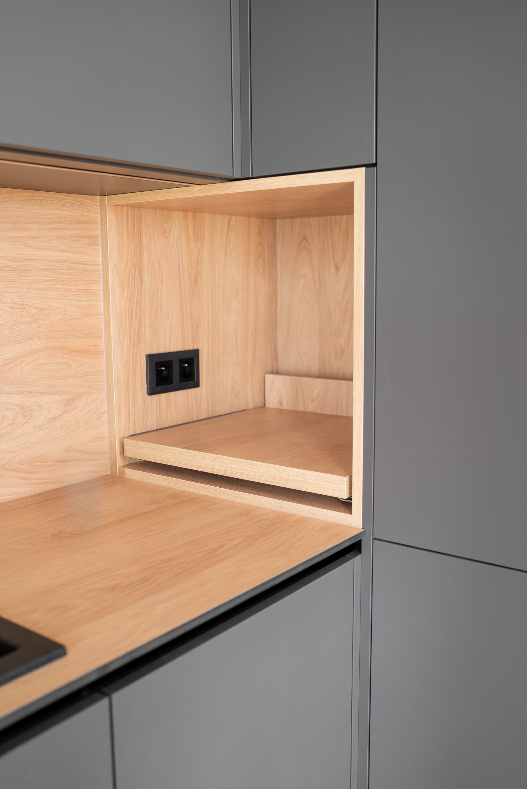 Nowoczesna kuchnia w ponadczasowym połączeniu matowej szarości zabudowy z jasnym dekorem drewna i czarnymi dodatkami, w której postawiliśmy na maksymalną funkcjonalność. Zabudowa pod sufit oferuje dużą ilość miejsca do przechowywania, a wysokie słupki mieszczą piekarnik i mikrofale na ergonomicznej wysokości. Otwarta wnęka z wysuwaną półką to praktyczne rozwiązanie na ekspres do kawy lub inne sprzęty codziennego użytku. Całość tworzy minimalistyczną, elegancką przestrzeń dopracowaną w każdym detalu.