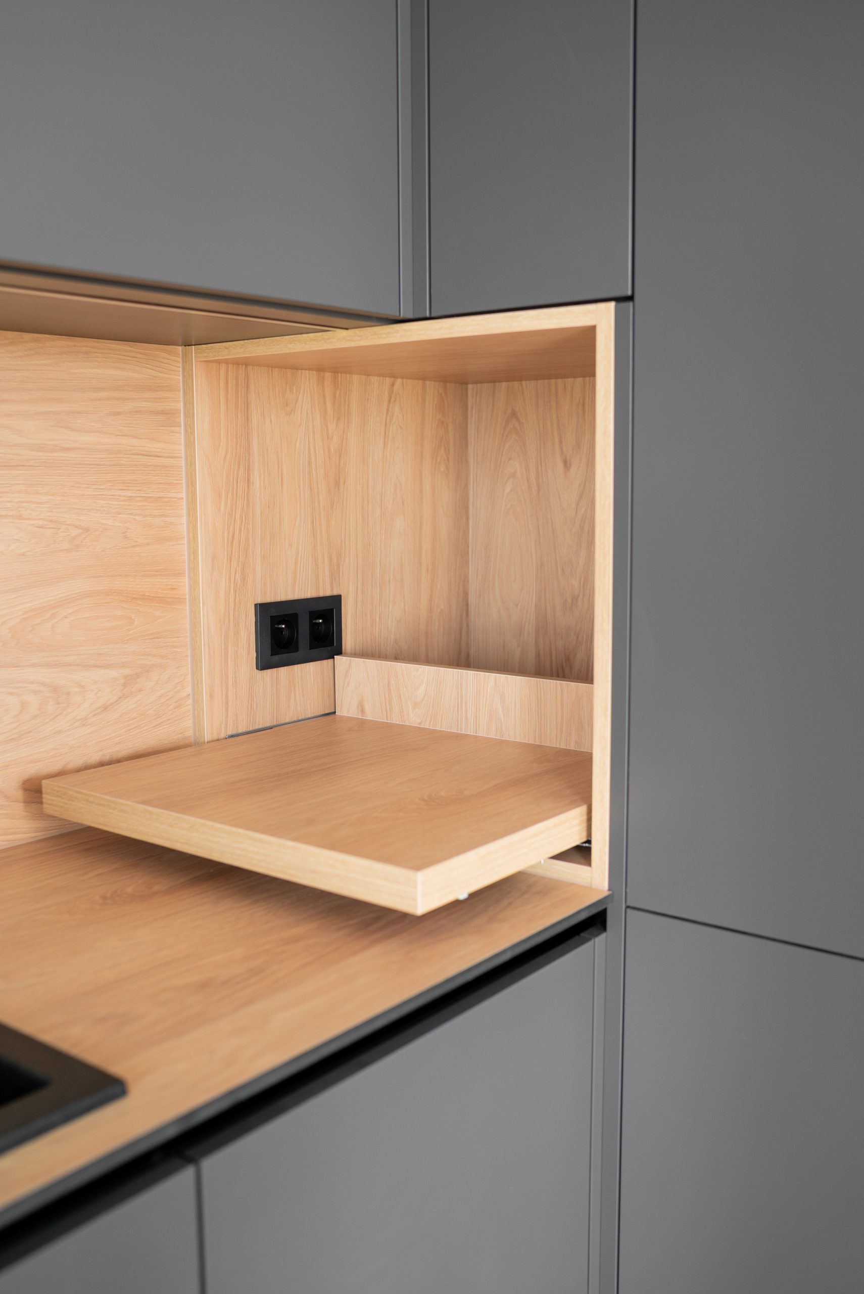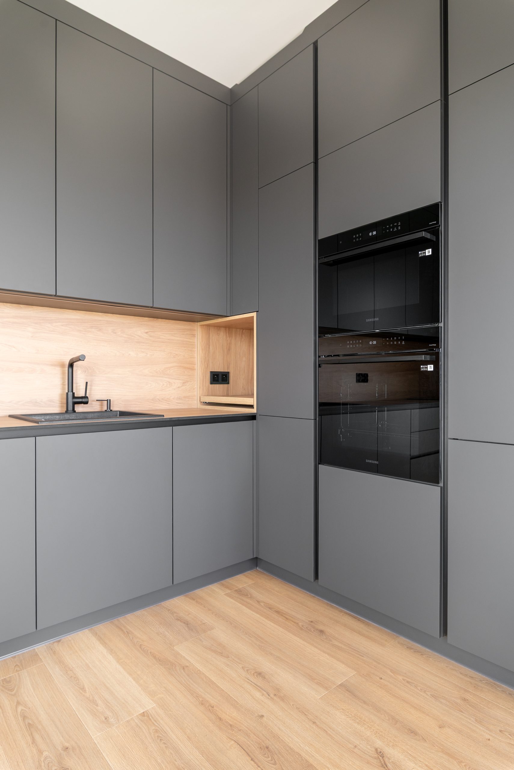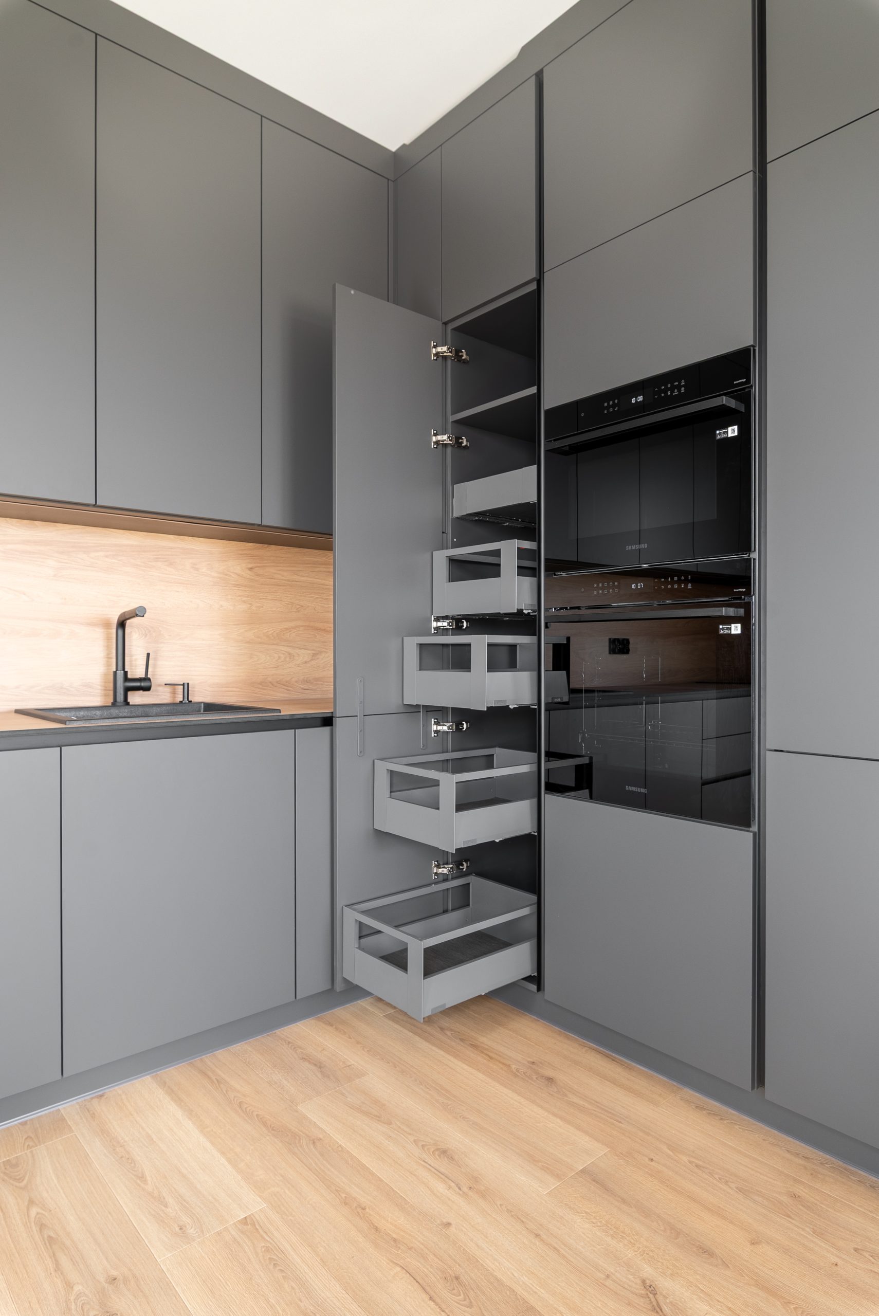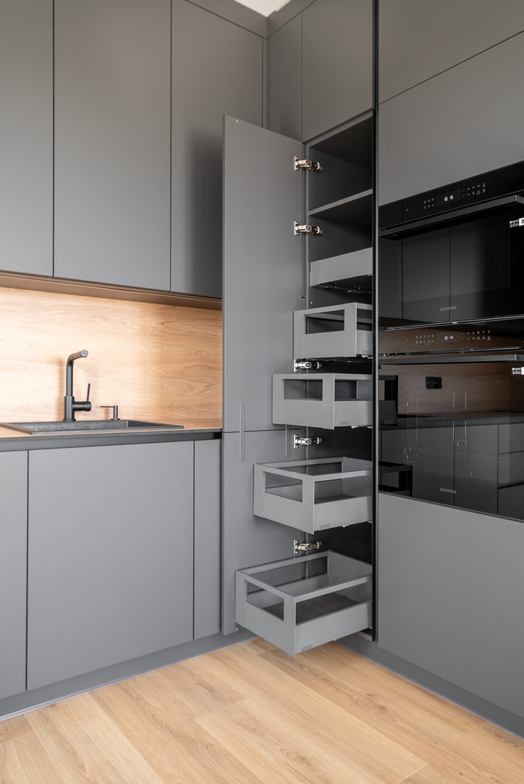 Nowoczesna kuchnia w ponadczasowym połączeniu matowej szarości zabudowy z jasnym dekorem drewna i czarnymi dodatkami, w której postawiliśmy na maksymalną funkcjonalność. Zabudowa pod sufit oferuje dużą ilość miejsca do przechowywania, a wysokie słupki mieszczą piekarnik i mikrofale na ergonomicznej wysokości. Otwarta wnęka z wysuwaną półką to praktyczne rozwiązanie na ekspres do kawy lub inne sprzęty codziennego użytku. Całość tworzy minimalistyczną, elegancką przestrzeń dopracowaną w każdym detalu.