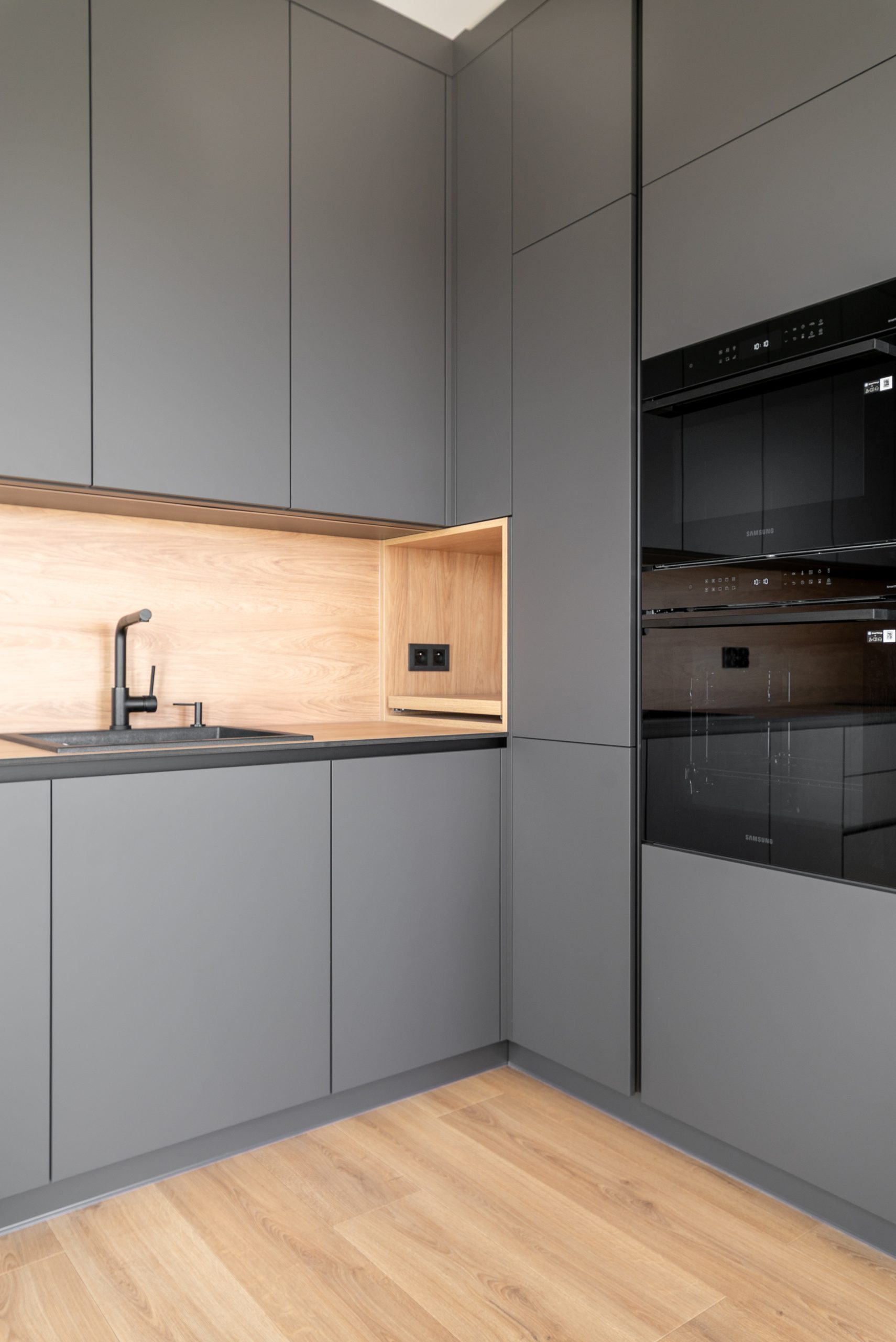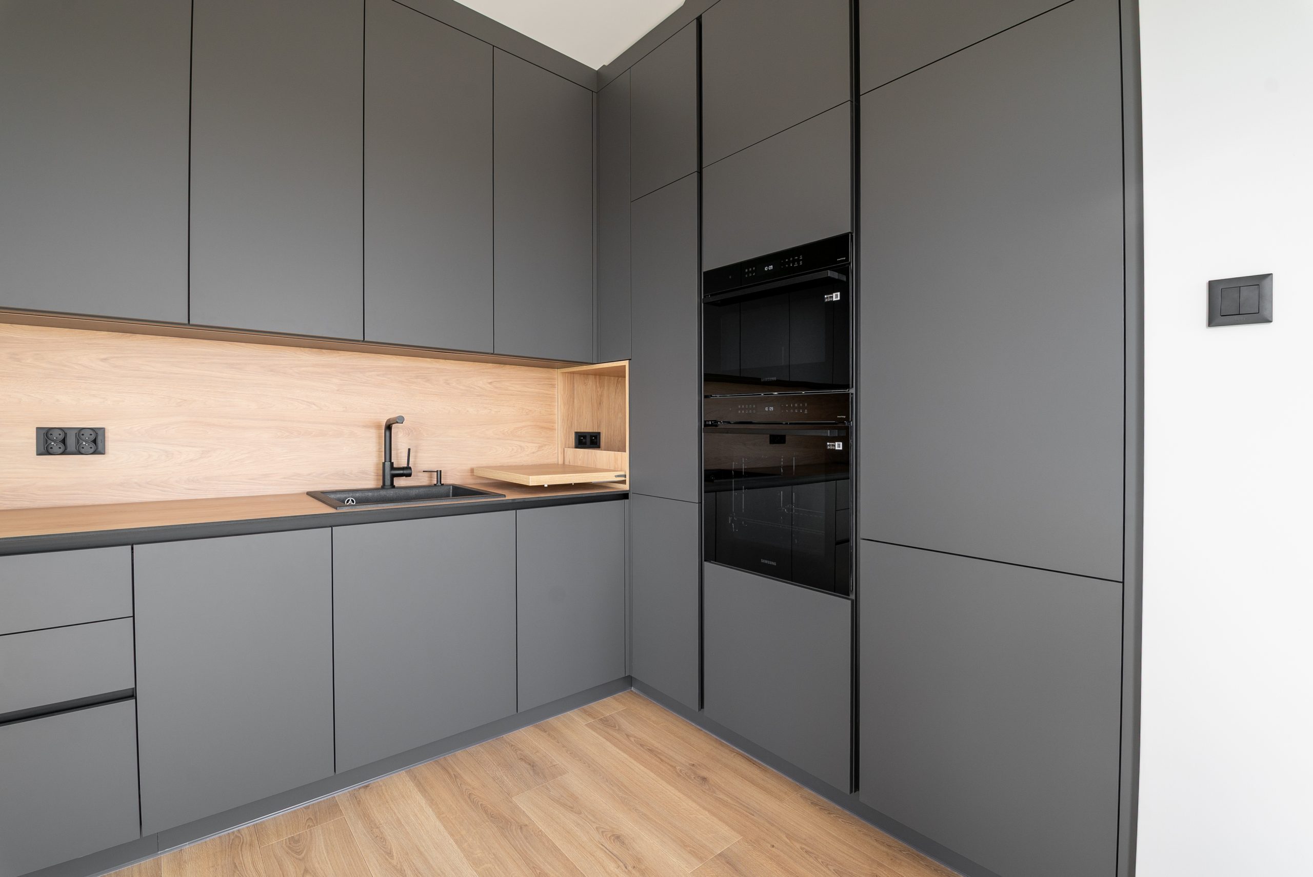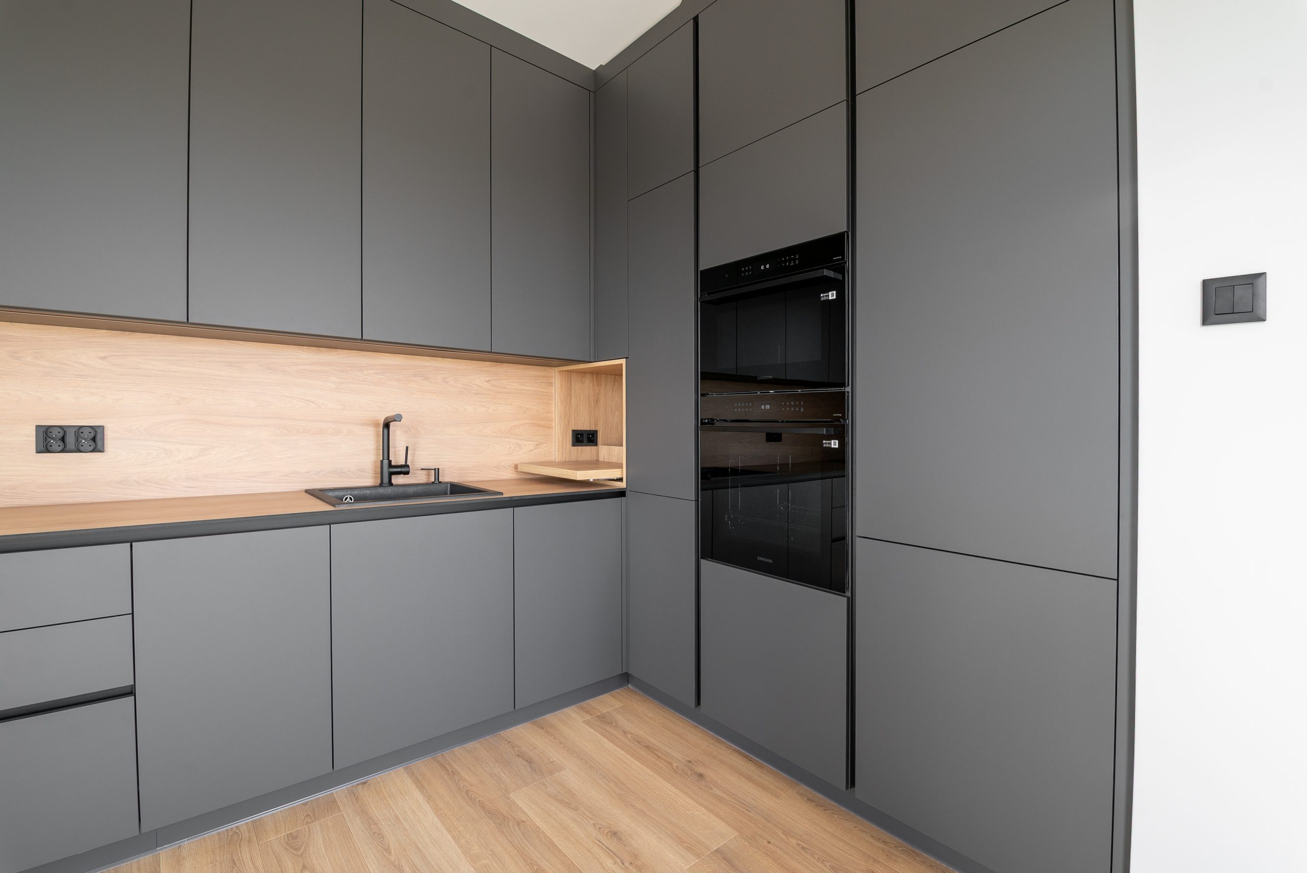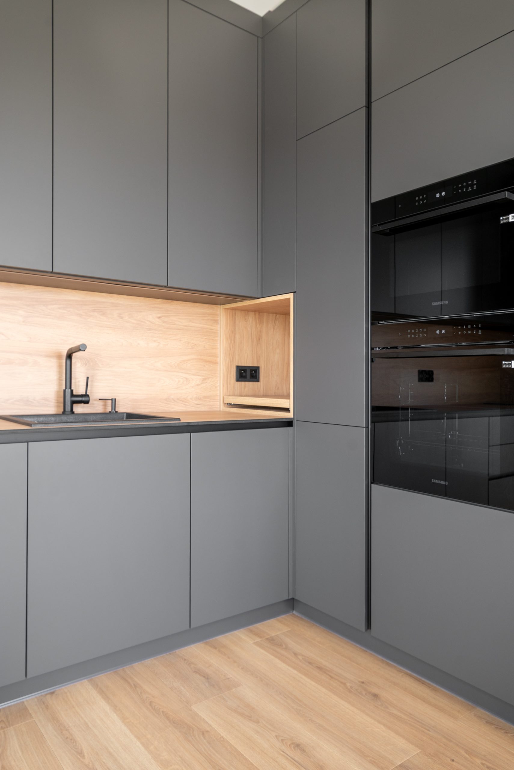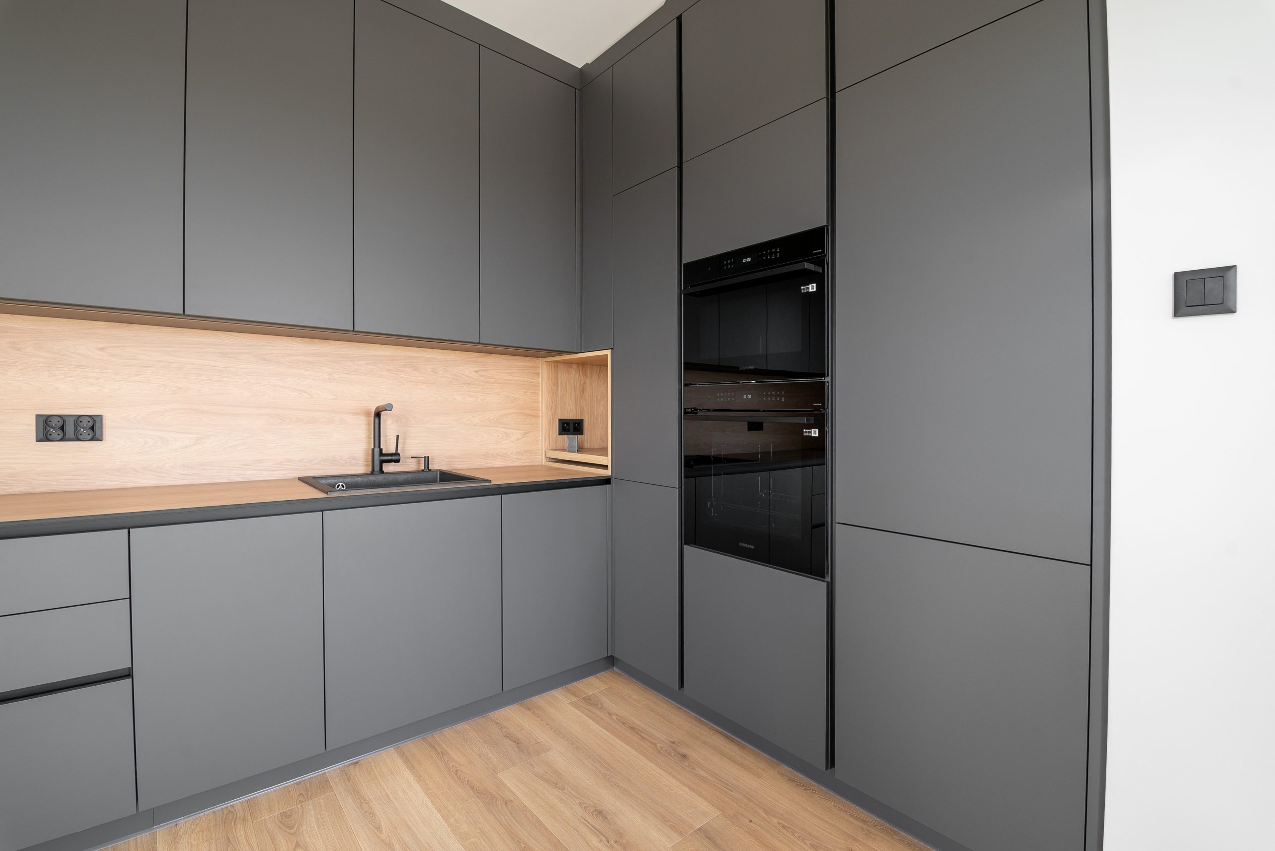 Nowoczesna kuchnia w ponadczasowym połączeniu matowej szarości zabudowy z jasnym dekorem drewna i czarnymi dodatkami, w której postawiliśmy na maksymalną funkcjonalność. Zabudowa pod sufit oferuje dużą ilość miejsca do przechowywania, a wysokie słupki mieszczą piekarnik i mikrofale na ergonomicznej wysokości. Otwarta wnęka z wysuwaną półką to praktyczne rozwiązanie na ekspres do kawy lub inne sprzęty codziennego użytku. Całość tworzy minimalistyczną, elegancką przestrzeń dopracowaną w każdym detalu.