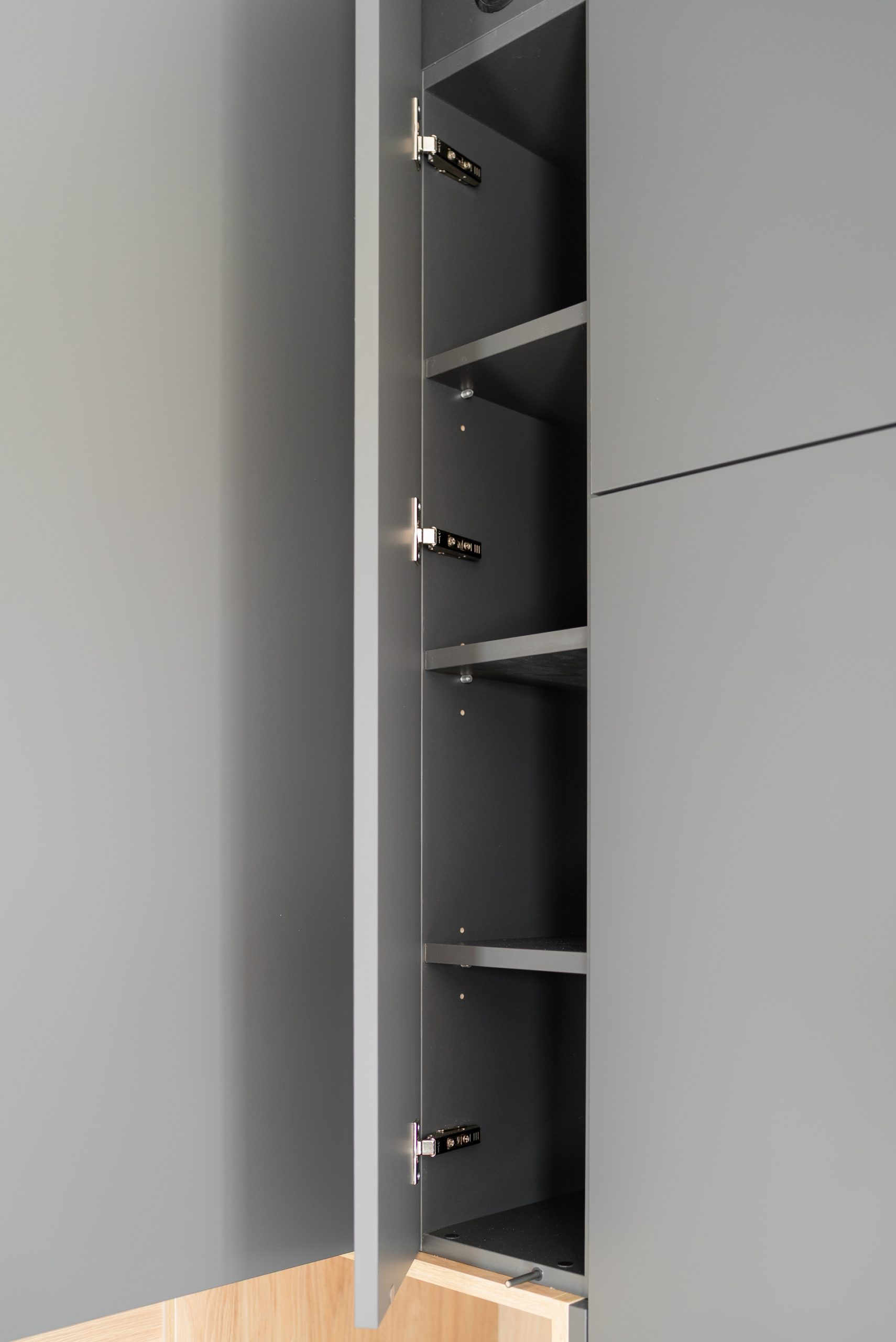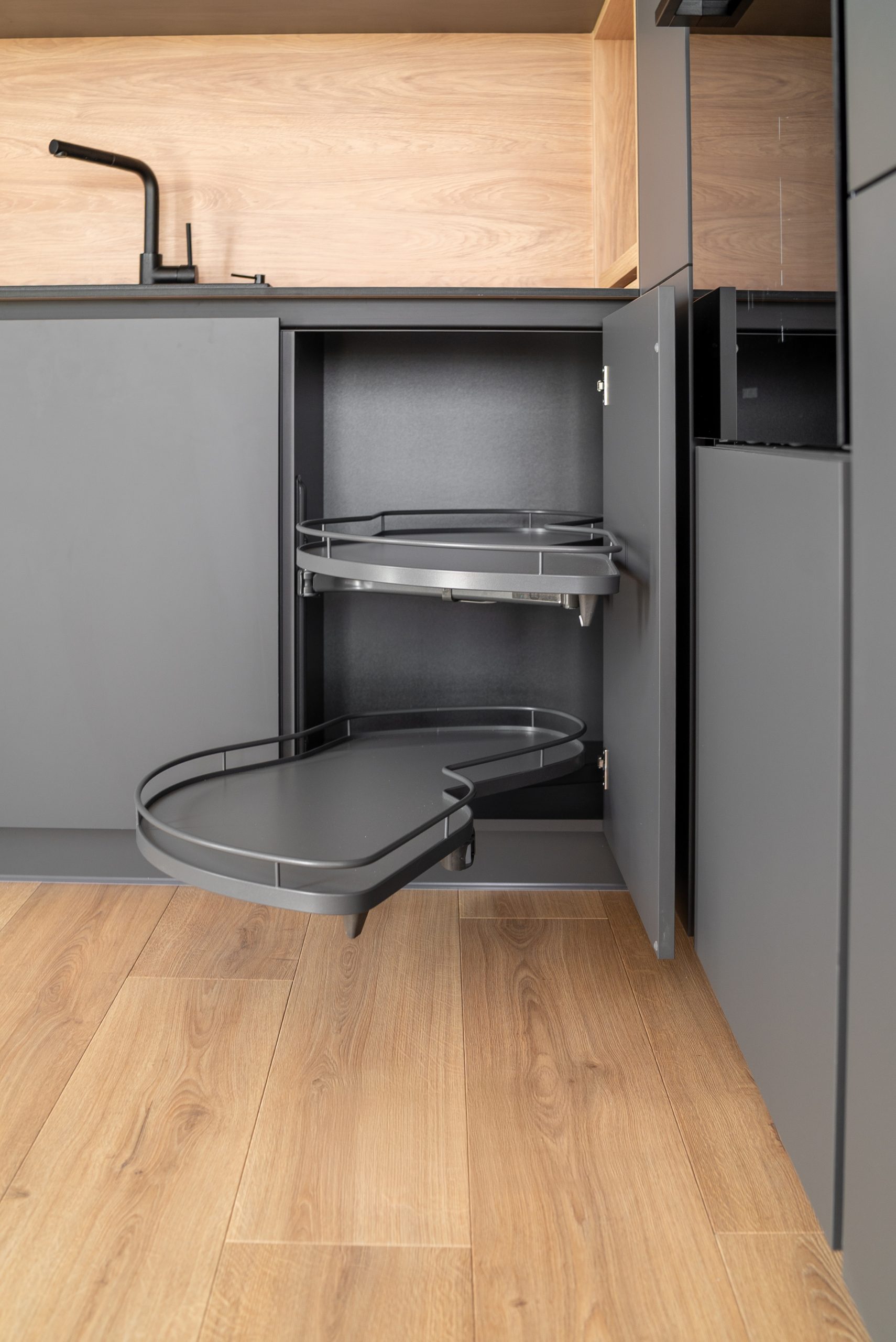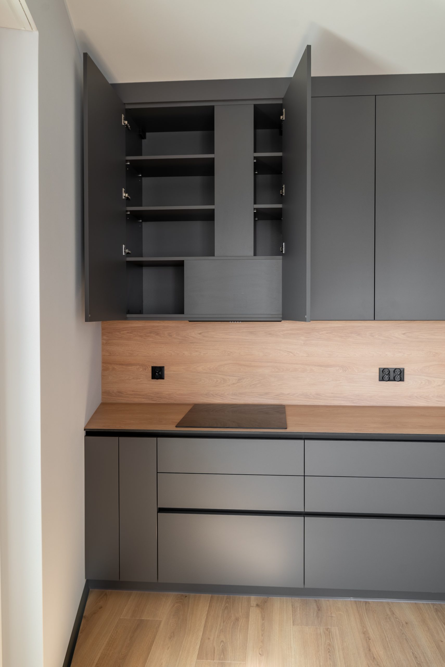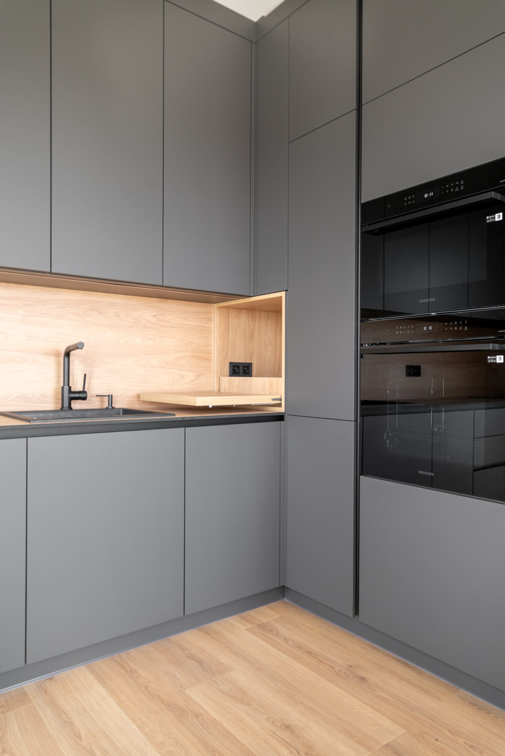 Nowoczesna kuchnia w ponadczasowym połączeniu matowej szarości zabudowy z jasnym dekorem drewna i czarnymi dodatkami, w której postawiliśmy na maksymalną funkcjonalność. Zabudowa pod sufit oferuje dużą ilość miejsca do przechowywania, a wysokie słupki mieszczą piekarnik i mikrofale na ergonomicznej wysokości. Otwarta wnęka z wysuwaną półką to praktyczne rozwiązanie na ekspres do kawy lub inne sprzęty codziennego użytku. Całość tworzy minimalistyczną, elegancką przestrzeń dopracowaną w każdym detalu.