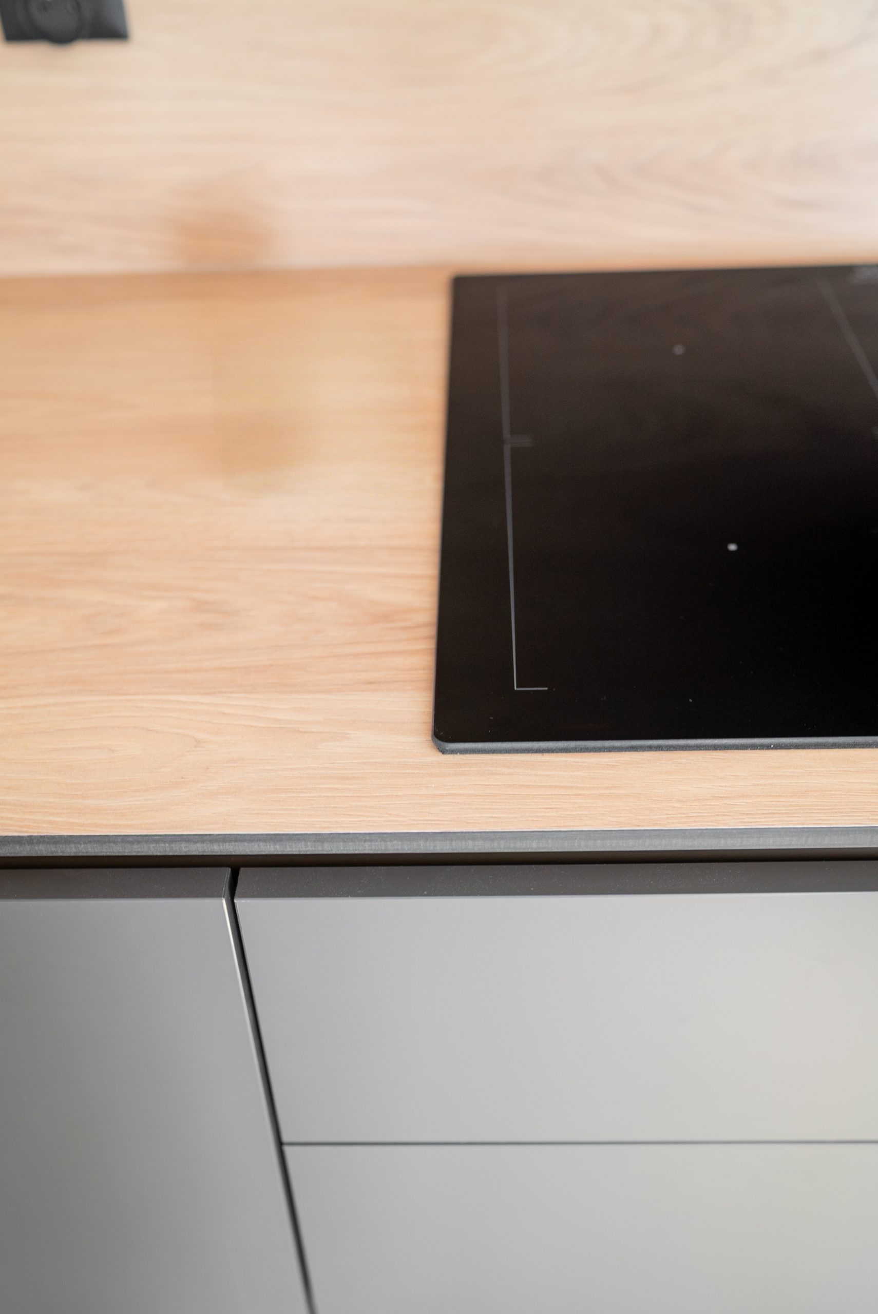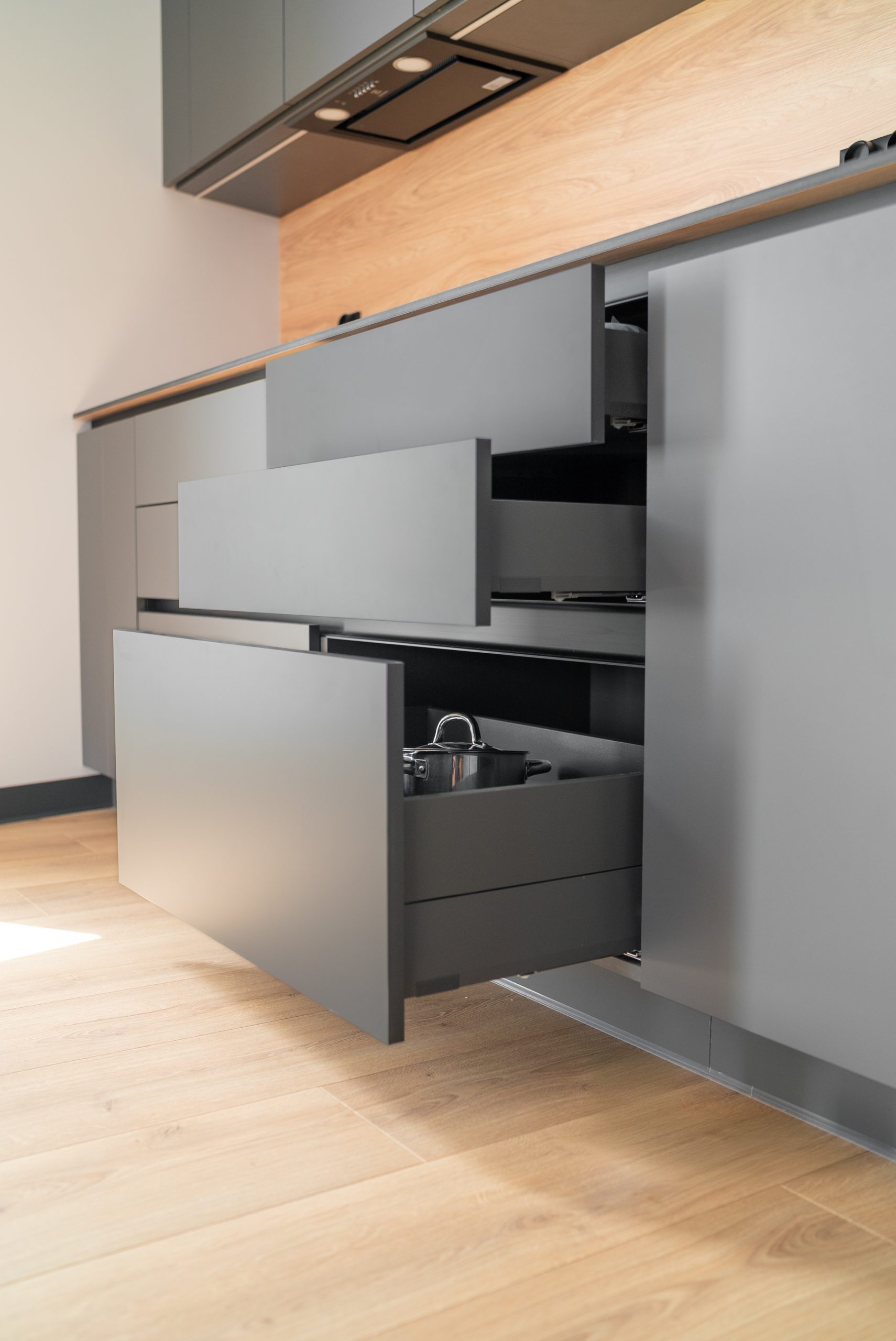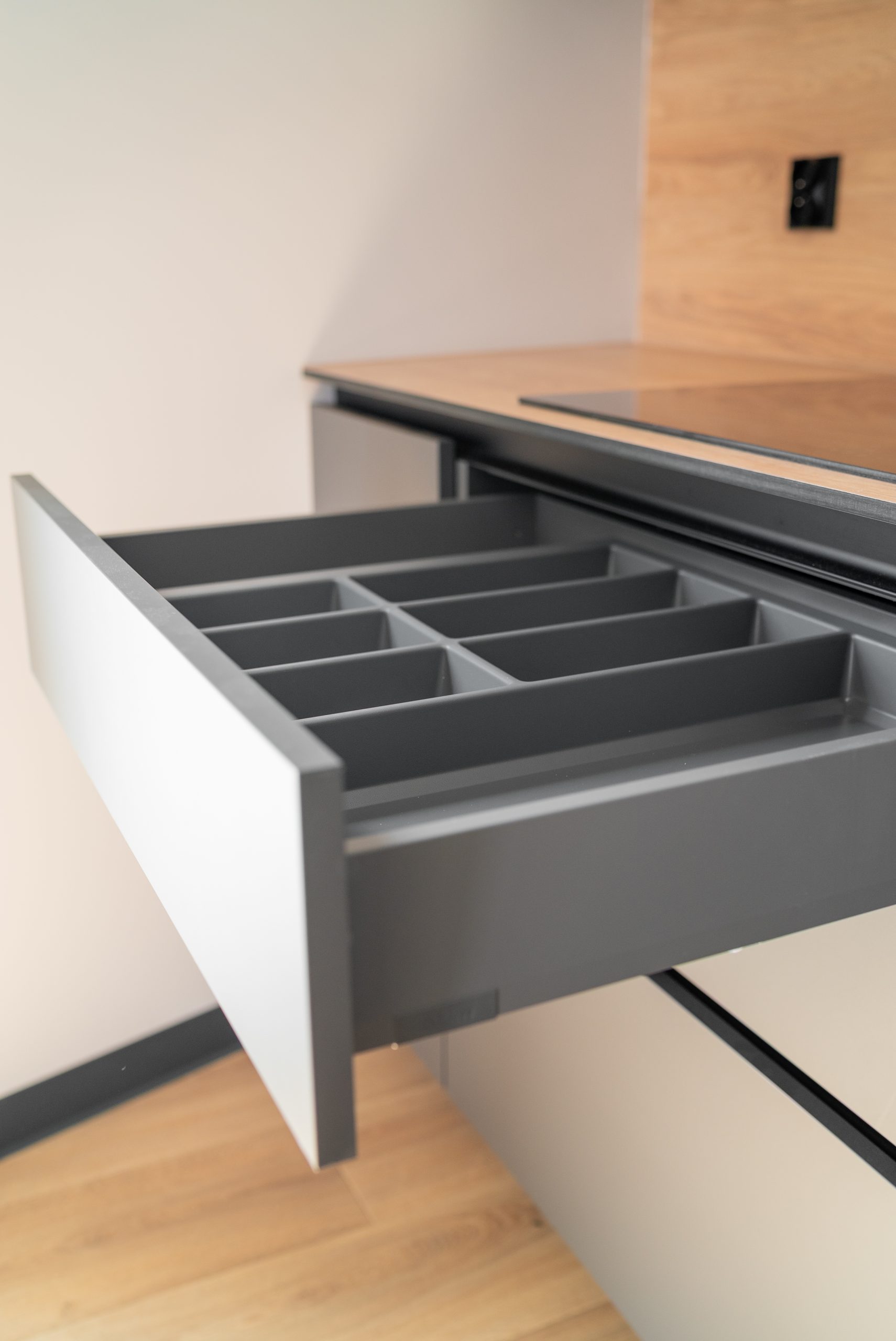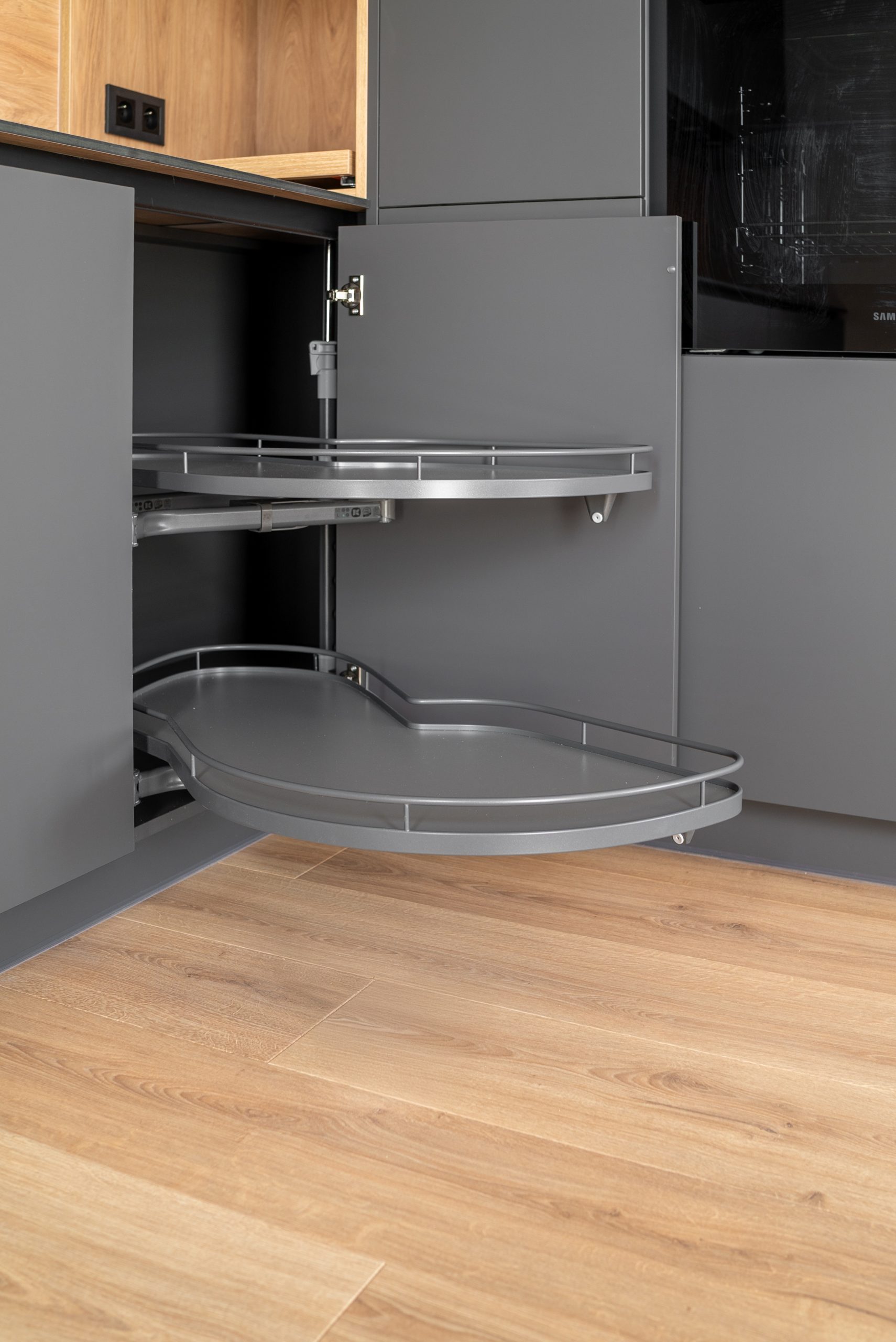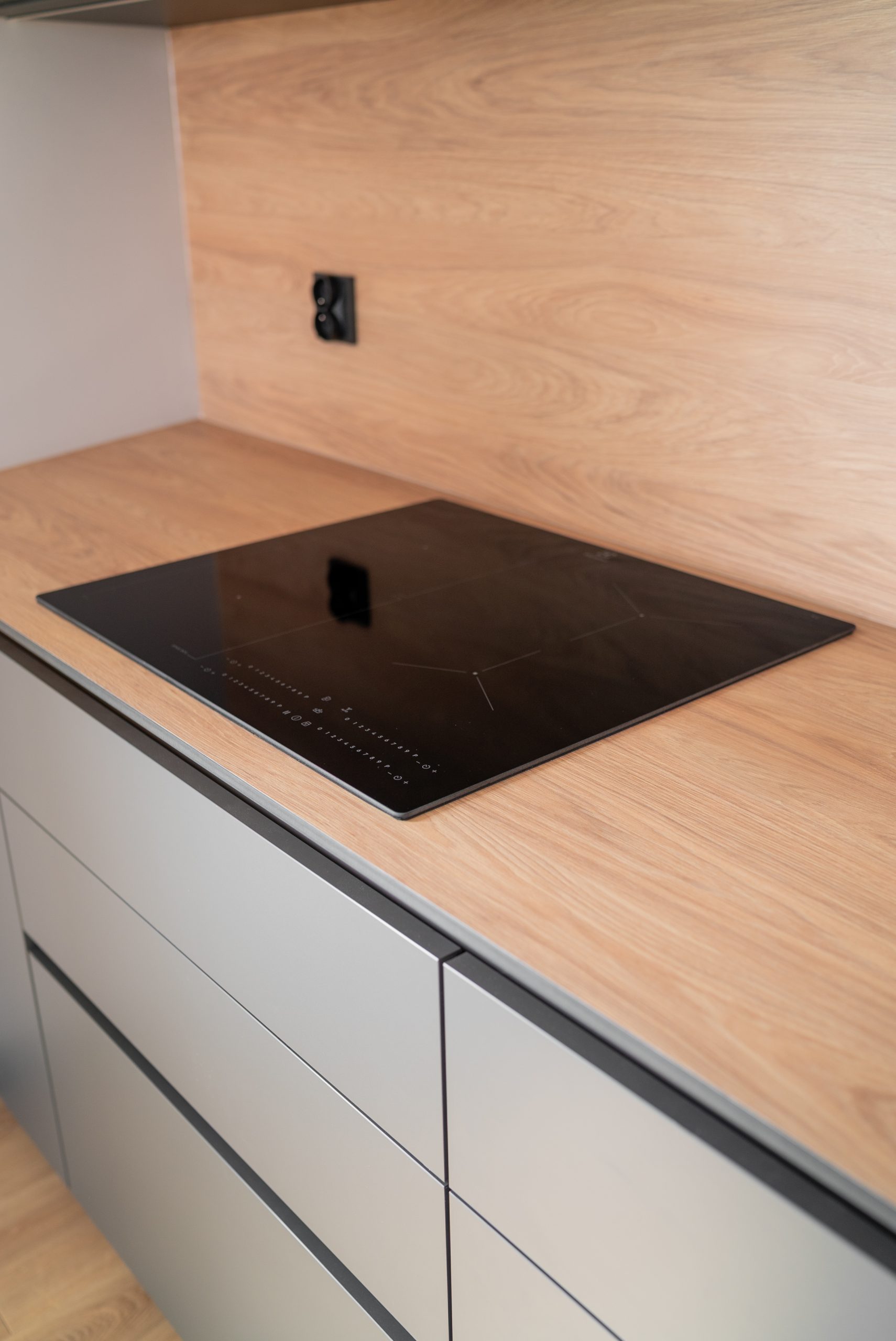 Nowoczesna kuchnia w ponadczasowym połączeniu matowej szarości zabudowy z jasnym dekorem drewna i czarnymi dodatkami, w której postawiliśmy na maksymalną funkcjonalność. Zabudowa pod sufit oferuje dużą ilość miejsca do przechowywania, a wysokie słupki mieszczą piekarnik i mikrofale na ergonomicznej wysokości. Otwarta wnęka z wysuwaną półką to praktyczne rozwiązanie na ekspres do kawy lub inne sprzęty codziennego użytku. Całość tworzy minimalistyczną, elegancką przestrzeń dopracowaną w każdym detalu.