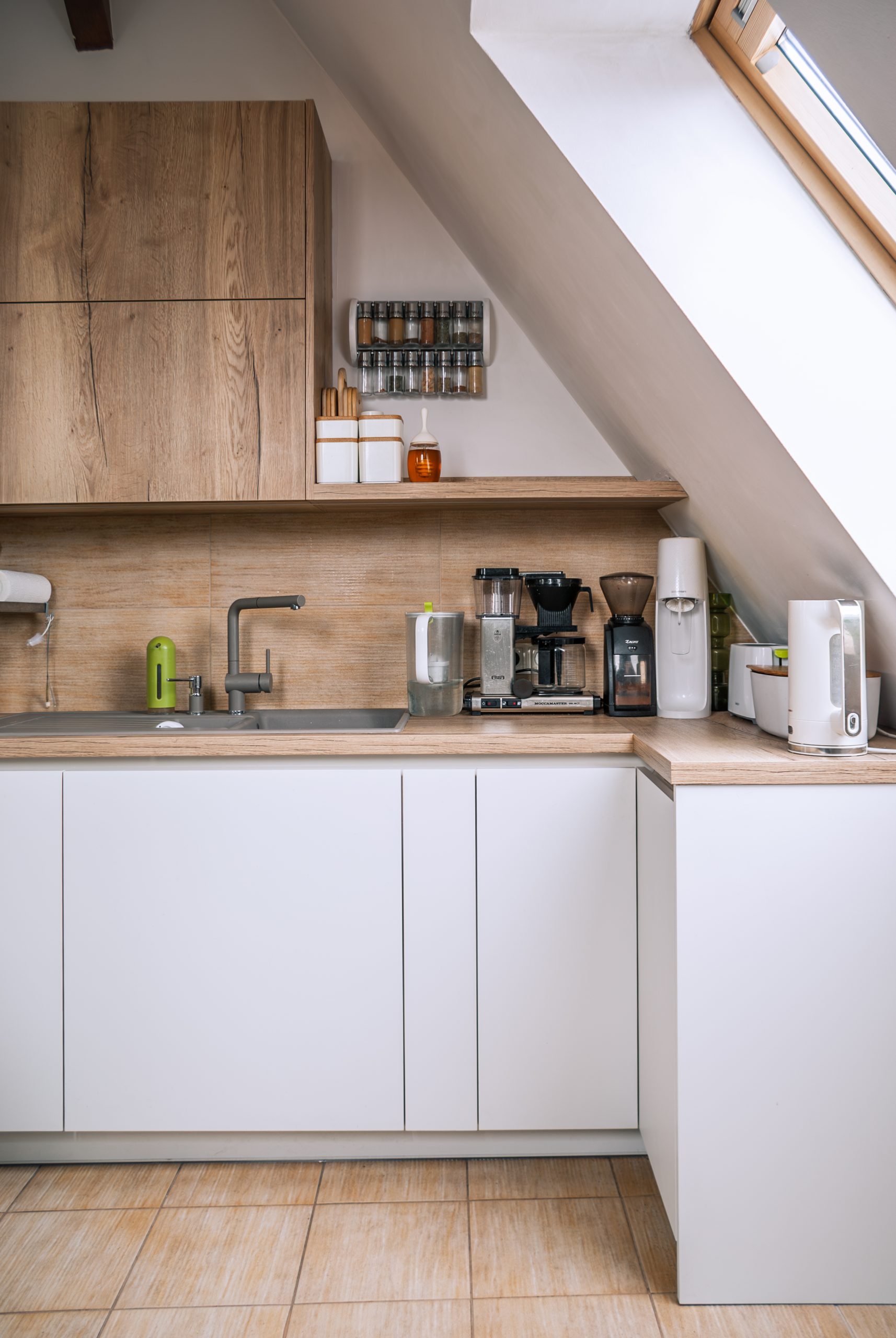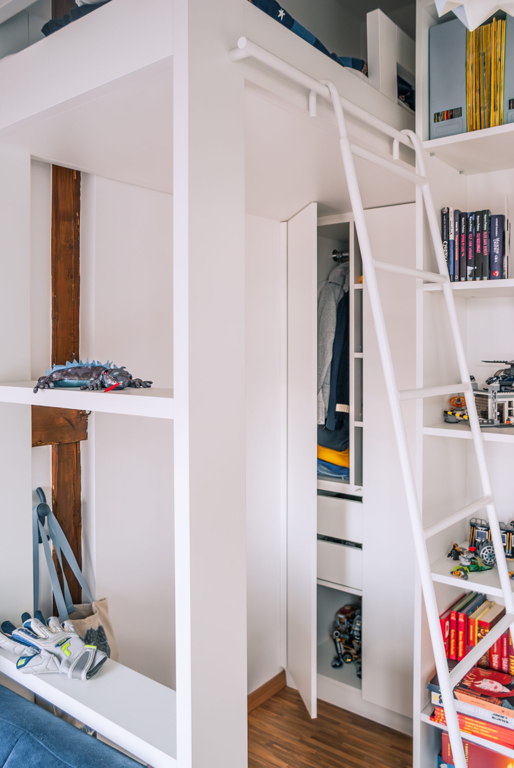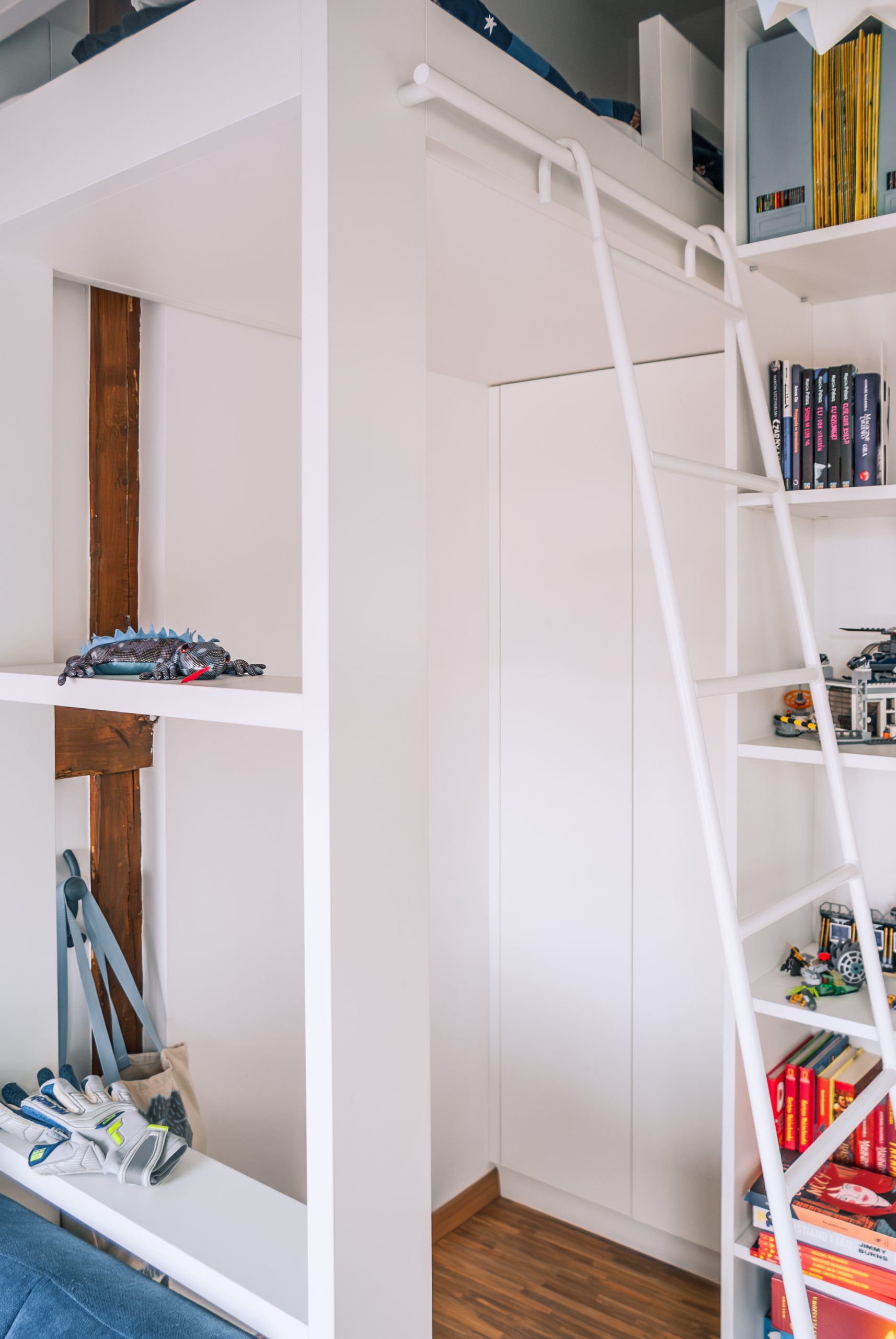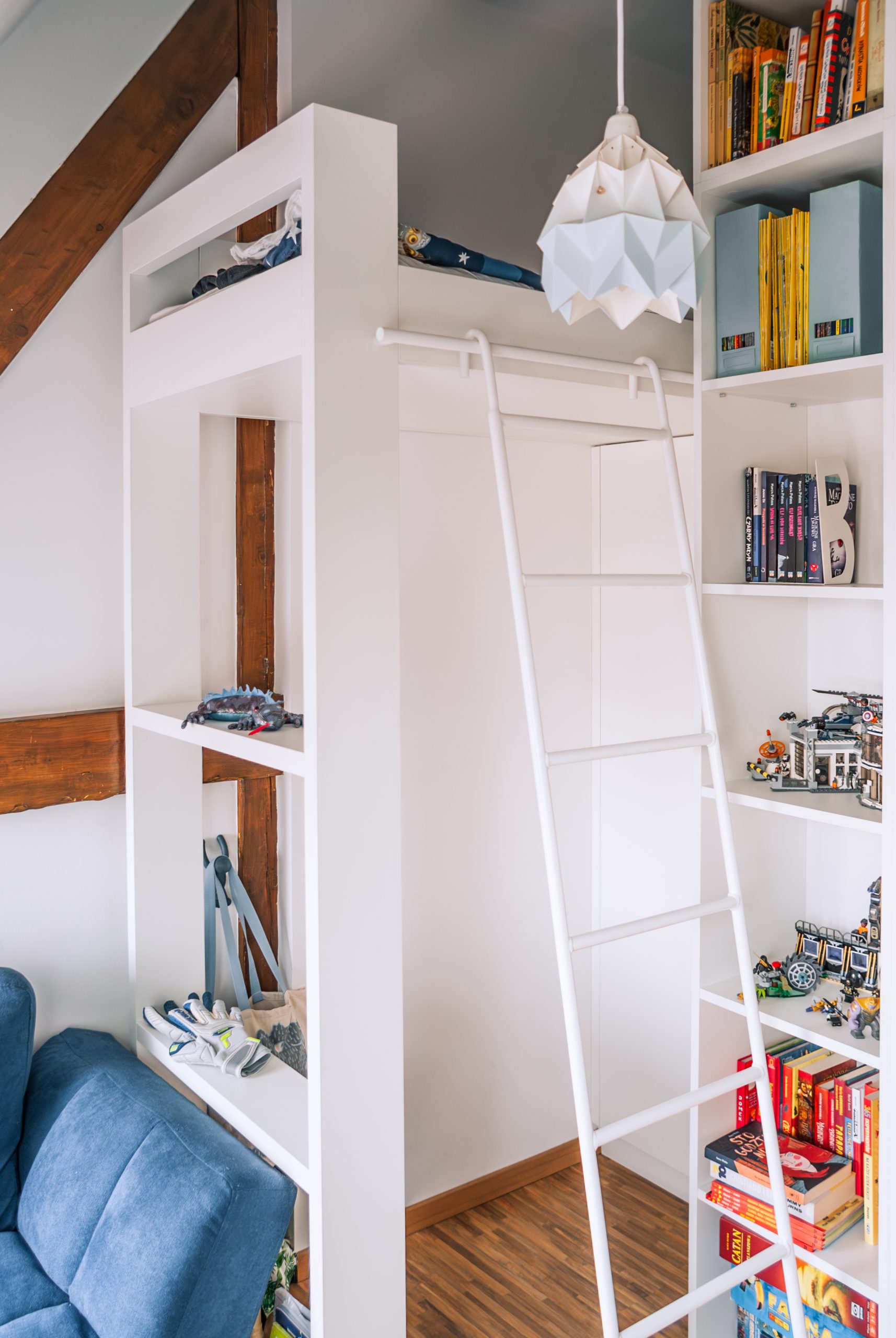 Projekt małego mieszkania na poddaszu, w którym każdy kąt ma swoją duszę. Biel połączona z drewnem wprowadza do wnętrza harmonię. Zagospodarowane przestrzenie pod skosami potęgują przytulność tego wnętrza. Zabudowa łóżka na antresoli pozwoliła na funkcjonalne zagospodarowanie szafy oraz regału w przestronnym salonie.