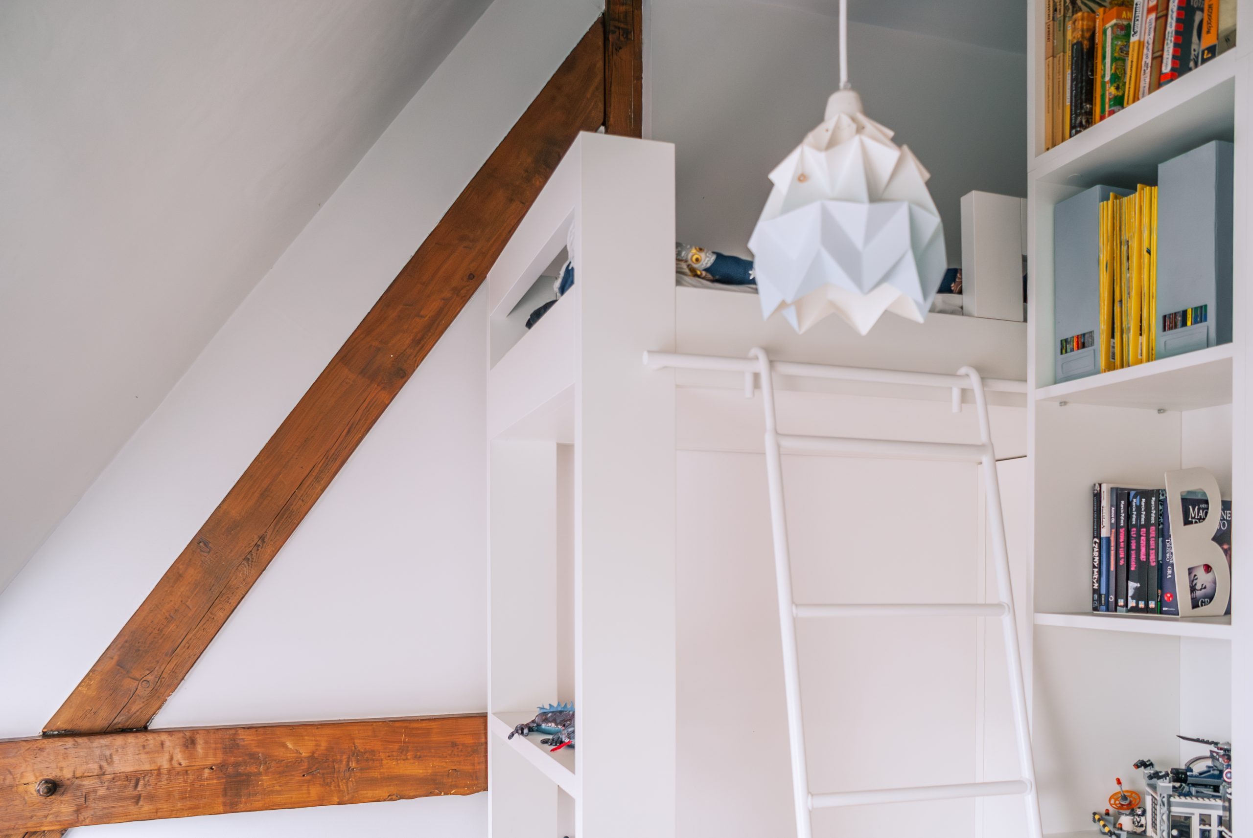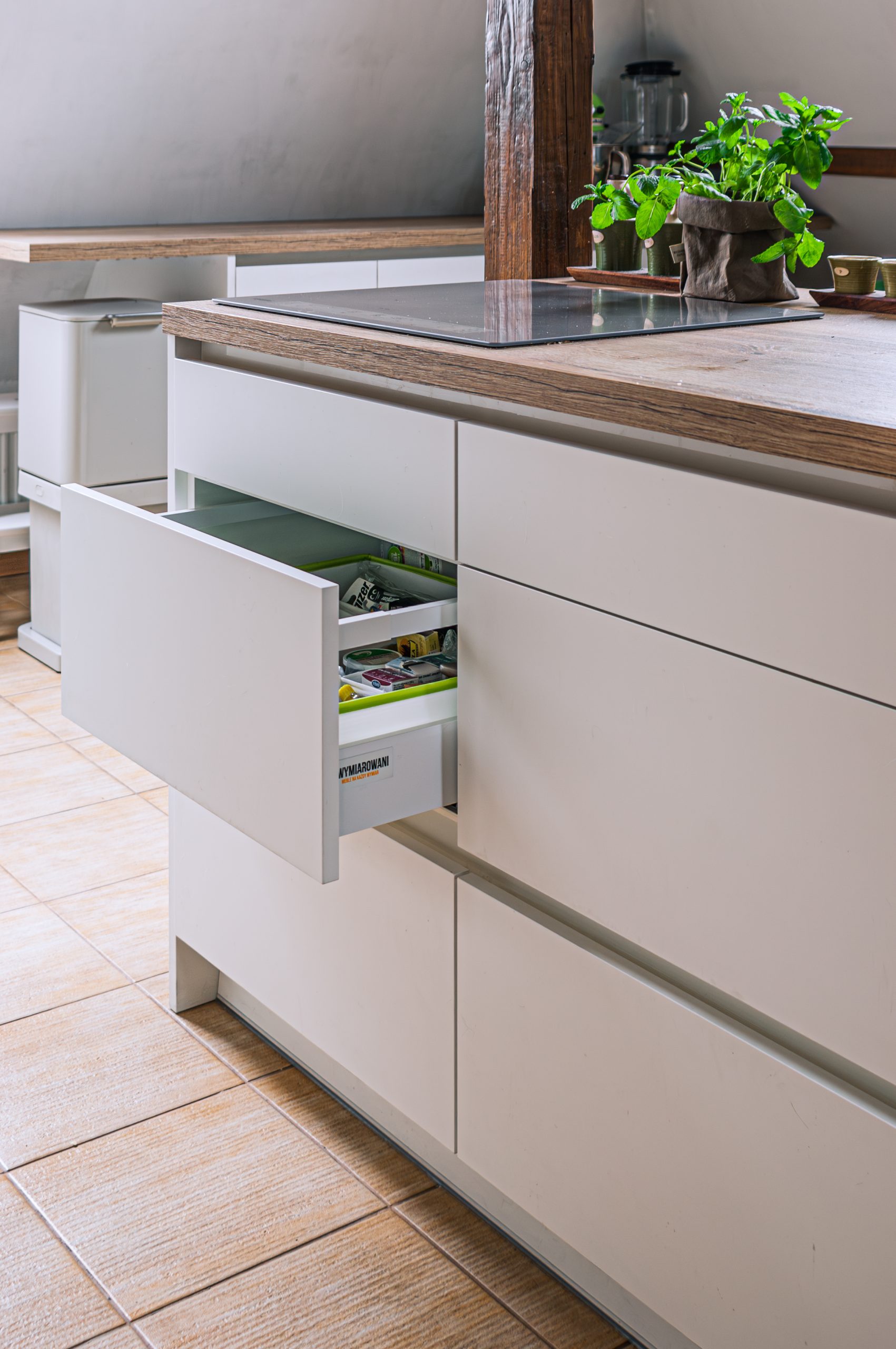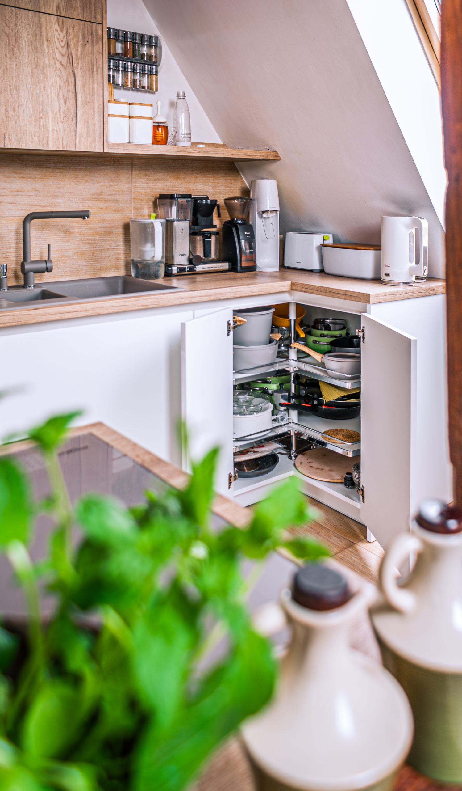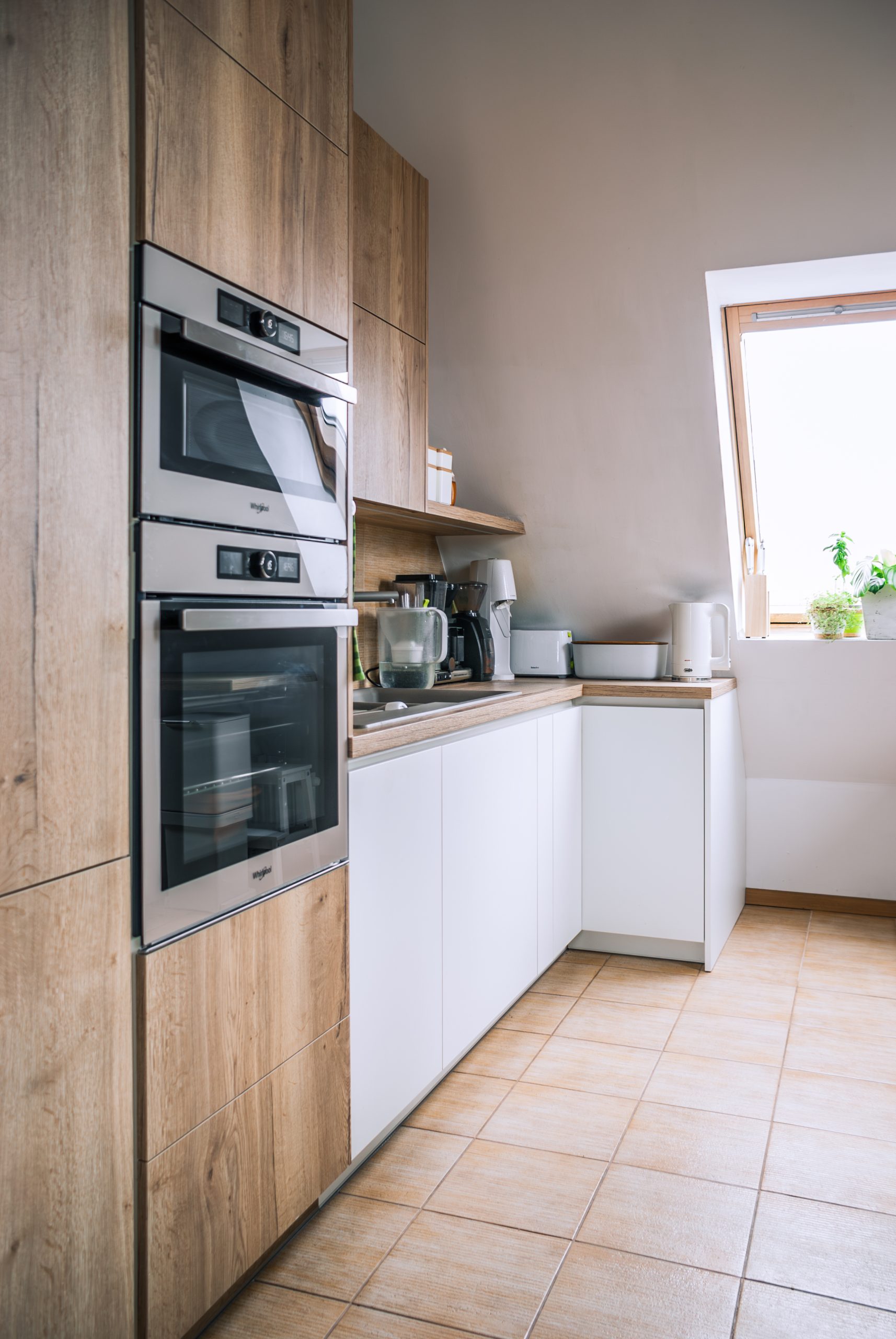 Projekt małego mieszkania na poddaszu, w którym każdy kąt ma swoją duszę. Biel połączona z drewnem wprowadza do wnętrza harmonię. Zagospodarowane przestrzenie pod skosami potęgują przytulność tego wnętrza. Zabudowa łóżka na antresoli pozwoliła na funkcjonalne zagospodarowanie szafy oraz regału w przestronnym salonie.