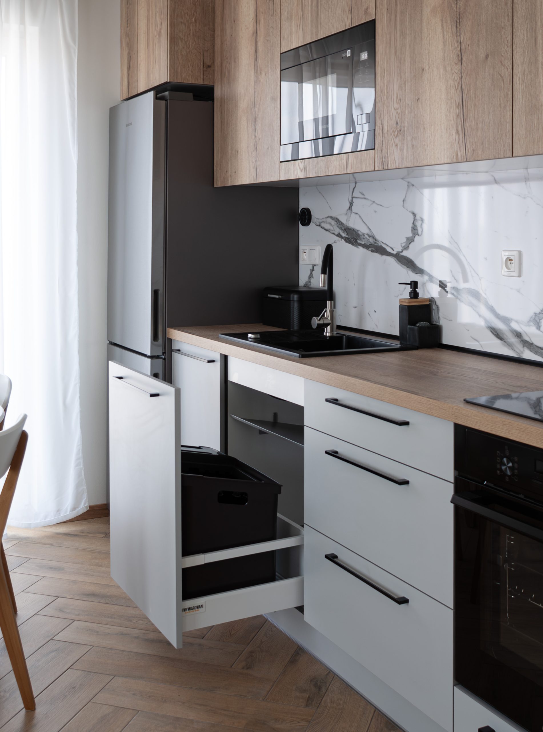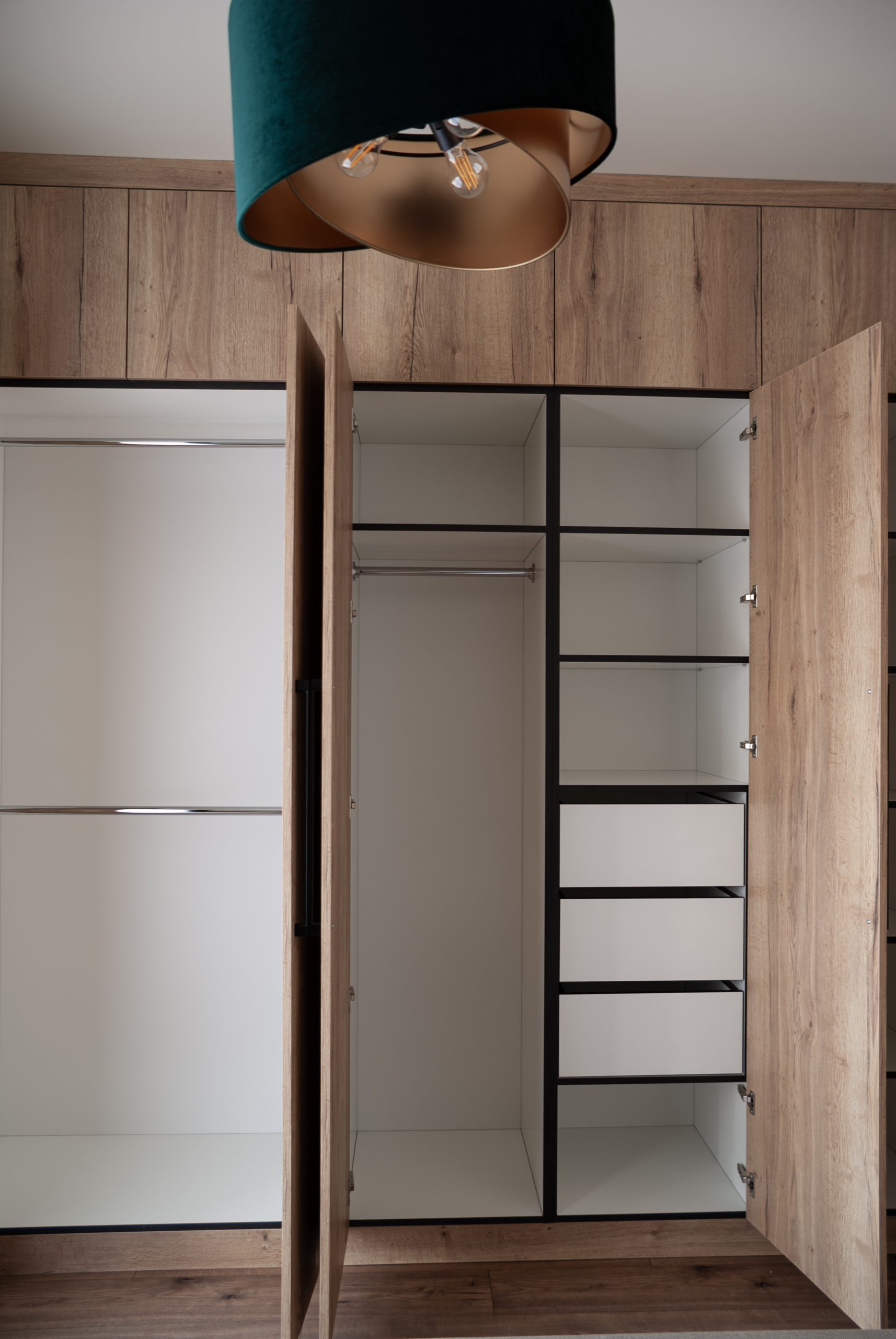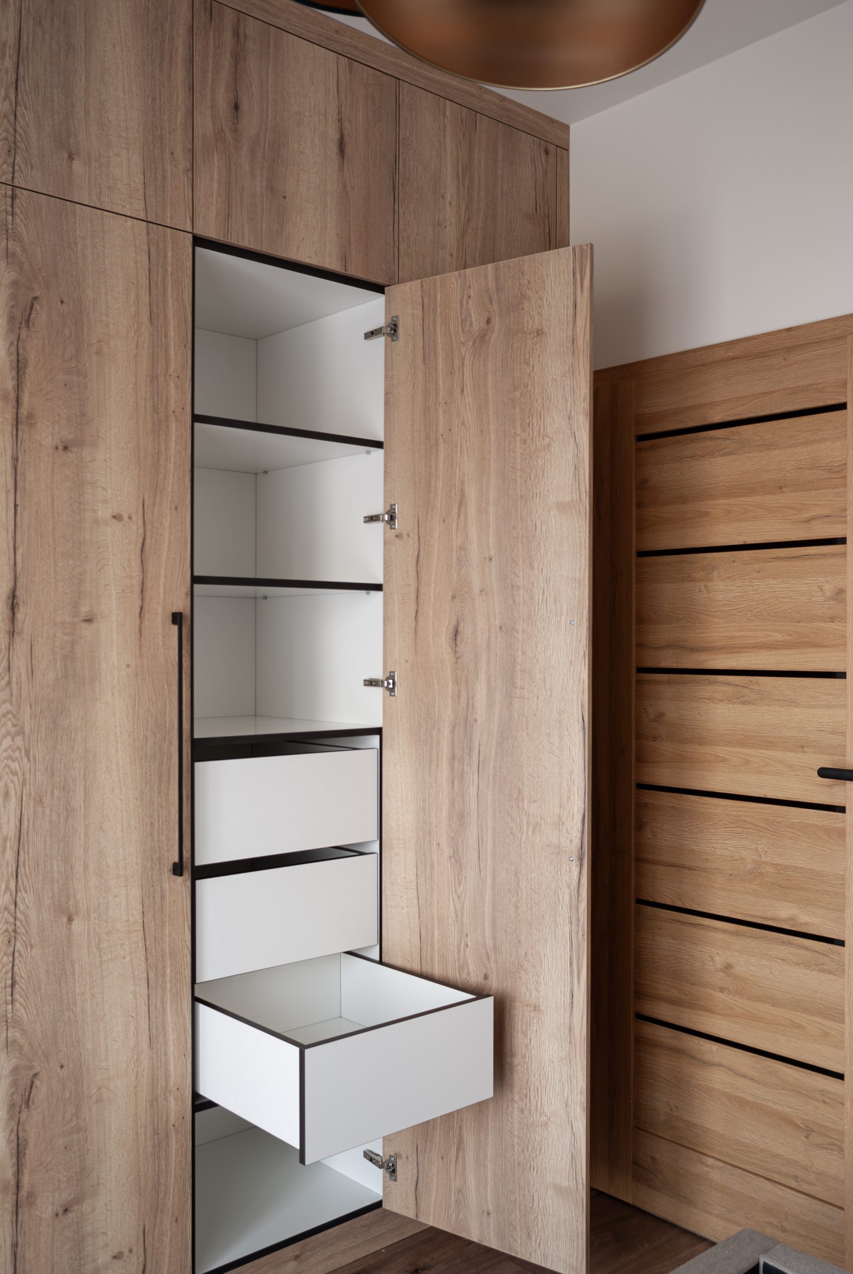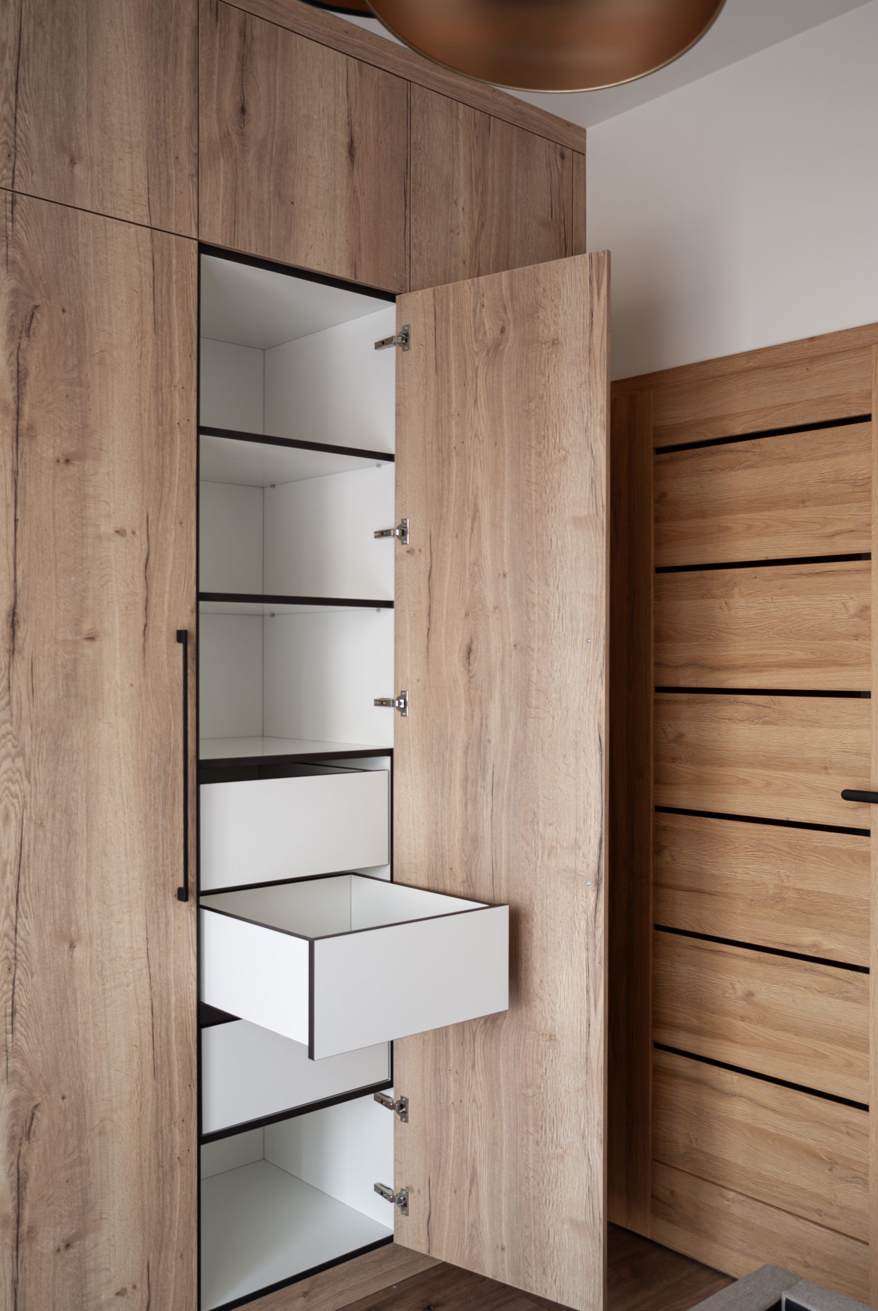 W tym mieszkaniu panuje harmonia stonowanych kolorów – ciepłe odcienie drewna i eleganckie szarości tworzą przytulną atmosferę. Funkcjonalność i estetyka to kluczowe elementy, które wpłynęły na projekt zabudowy meblowej. Czarne wykończenie dodaje charakteru i spójnie łączy kuchnię, łazienkę i sypialnię. Meble na wymiar idealnie dopasowują się do przestrzeni, maksymalizując jej funkcjonalność.