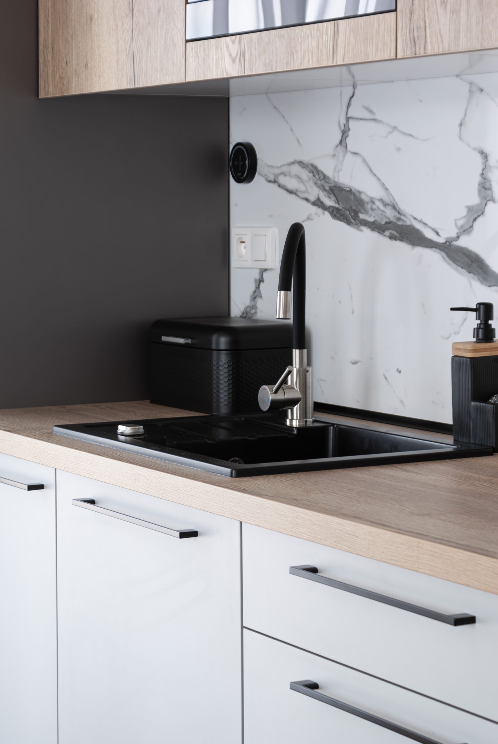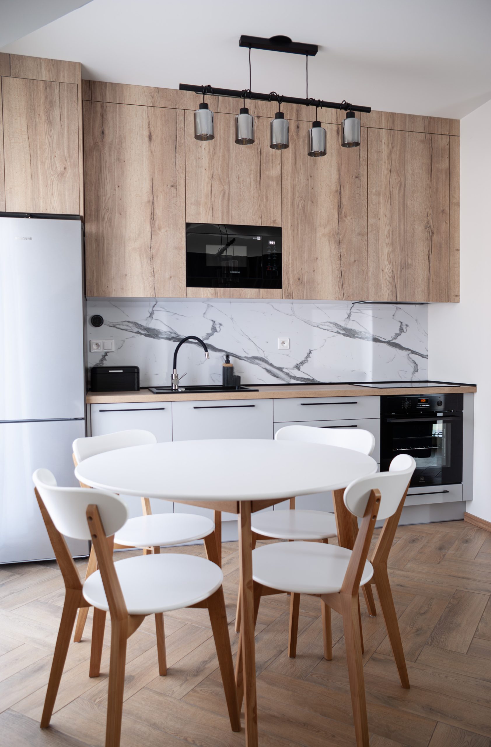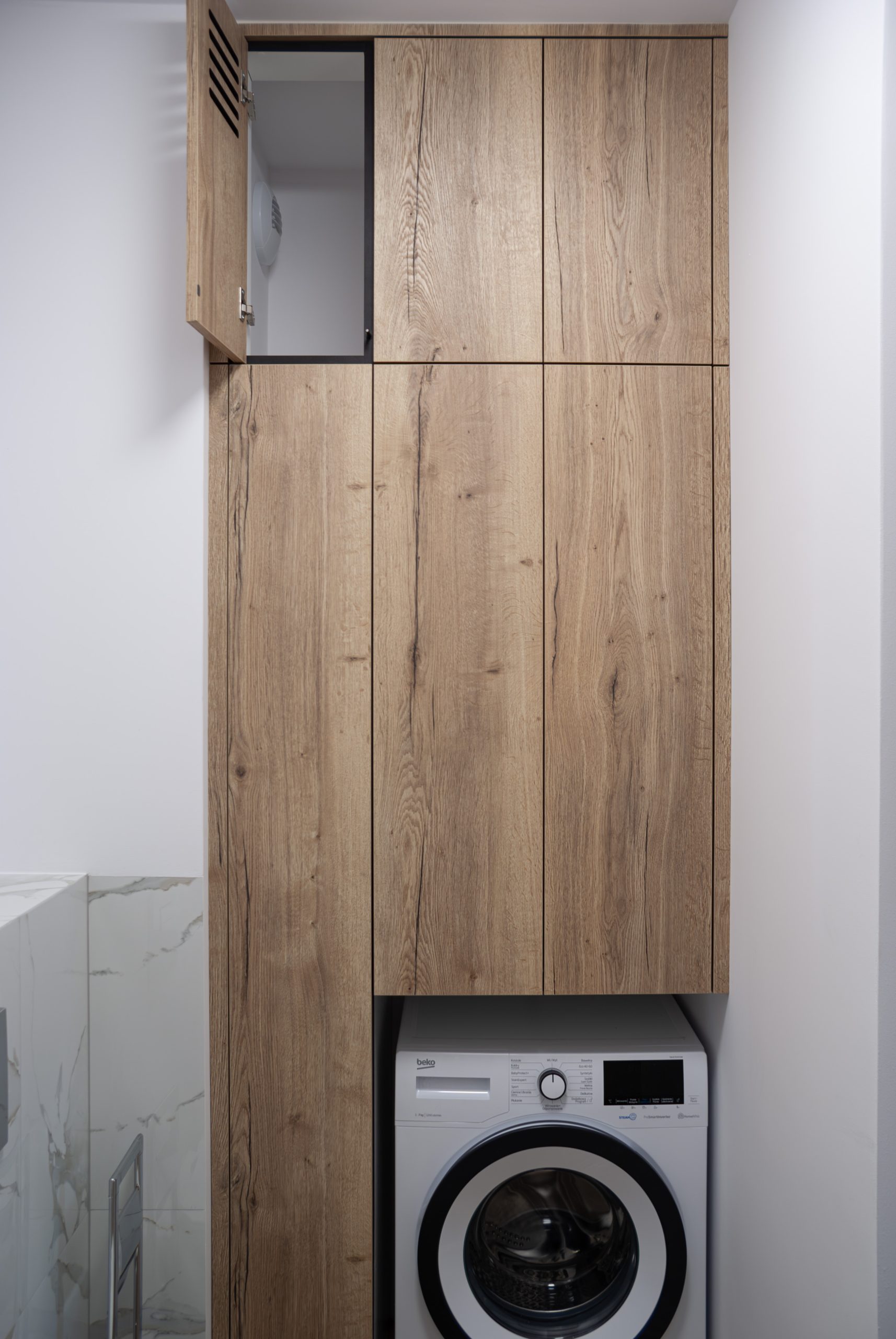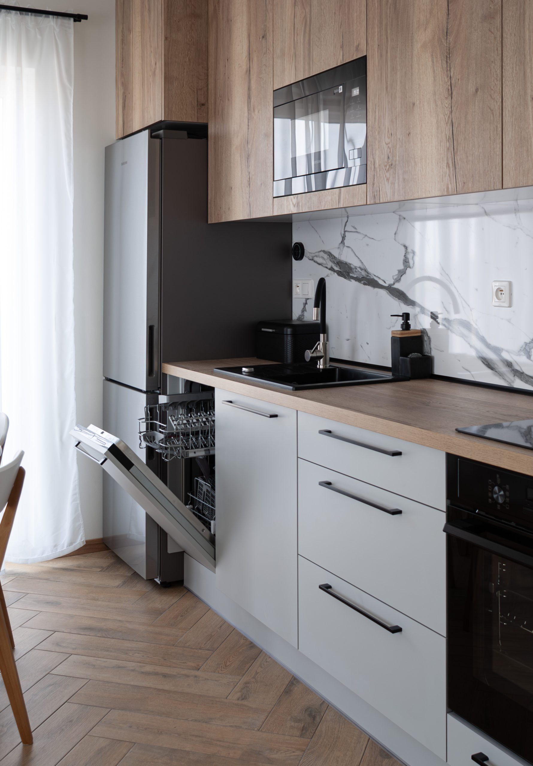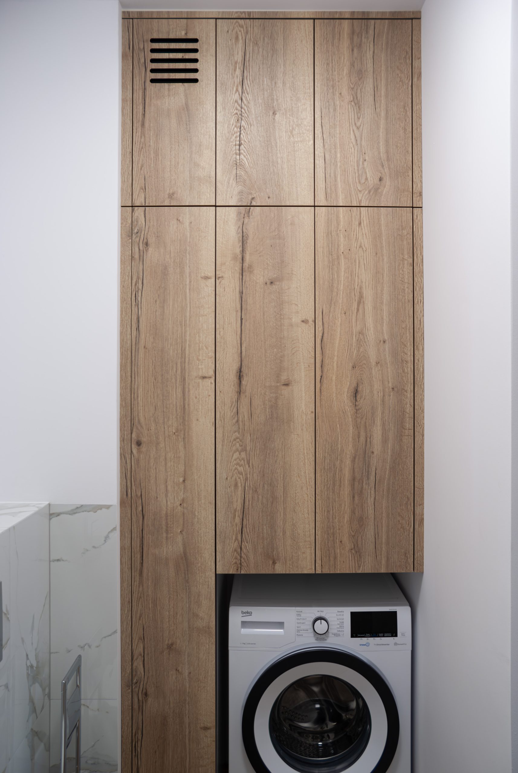 W tym mieszkaniu panuje harmonia stonowanych kolorów – ciepłe odcienie drewna i eleganckie szarości tworzą przytulną atmosferę. Funkcjonalność i estetyka to kluczowe elementy, które wpłynęły na projekt zabudowy meblowej. Czarne wykończenie dodaje charakteru i spójnie łączy kuchnię, łazienkę i sypialnię. Meble na wymiar idealnie dopasowują się do przestrzeni, maksymalizując jej funkcjonalność.