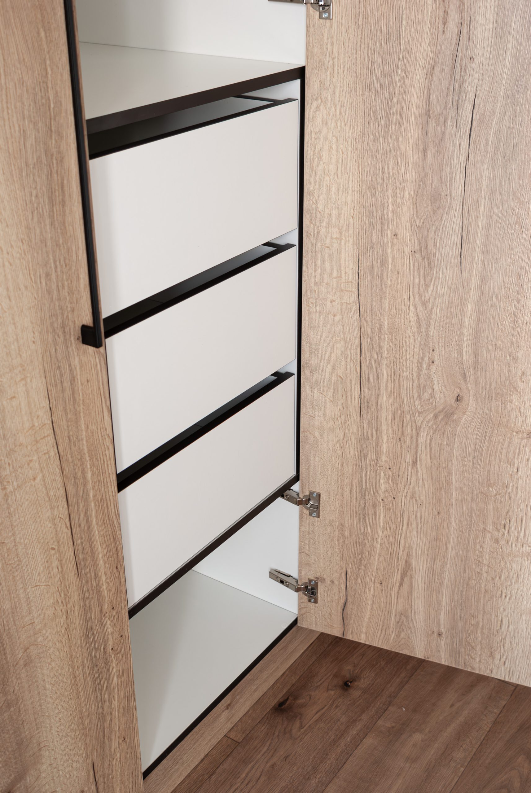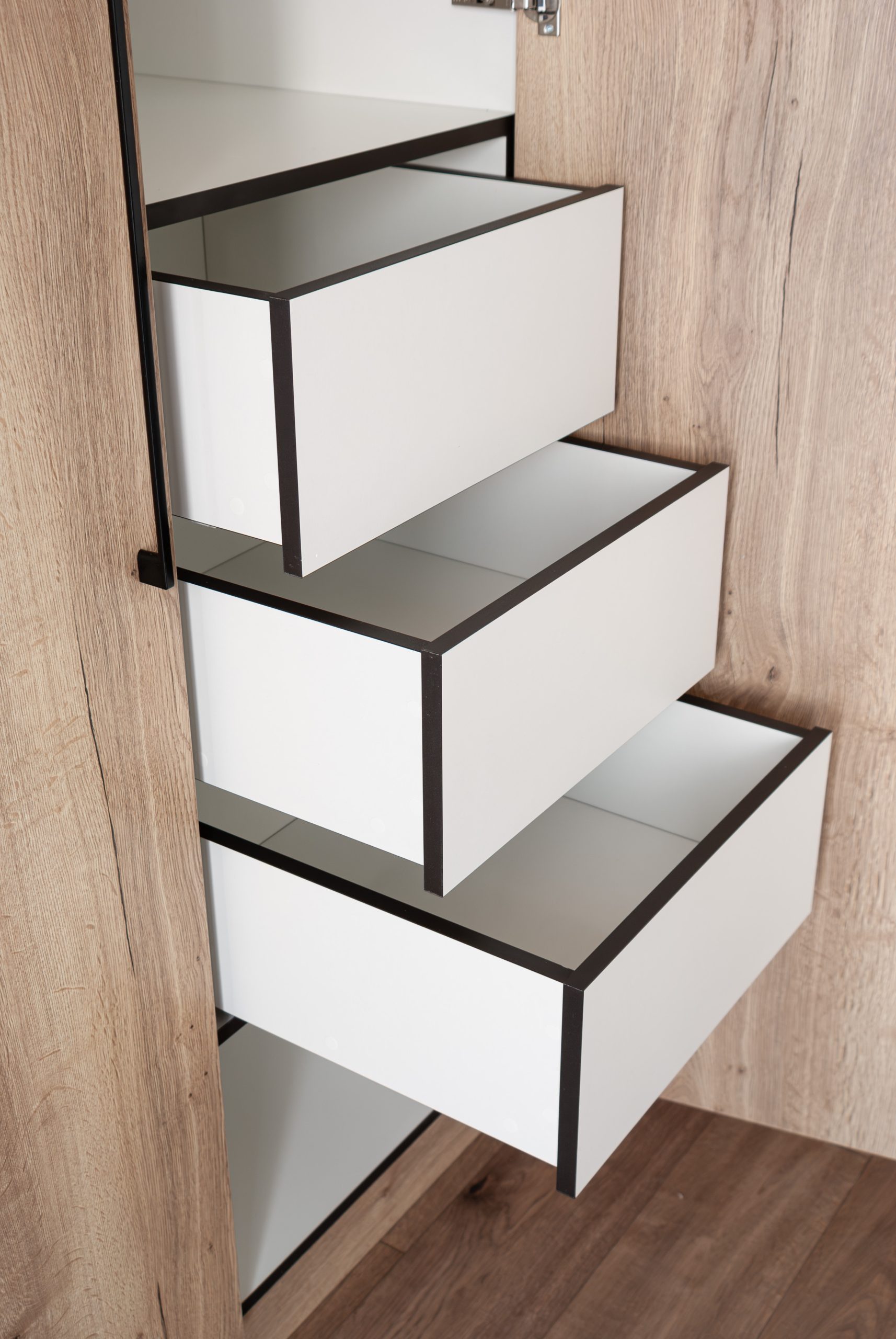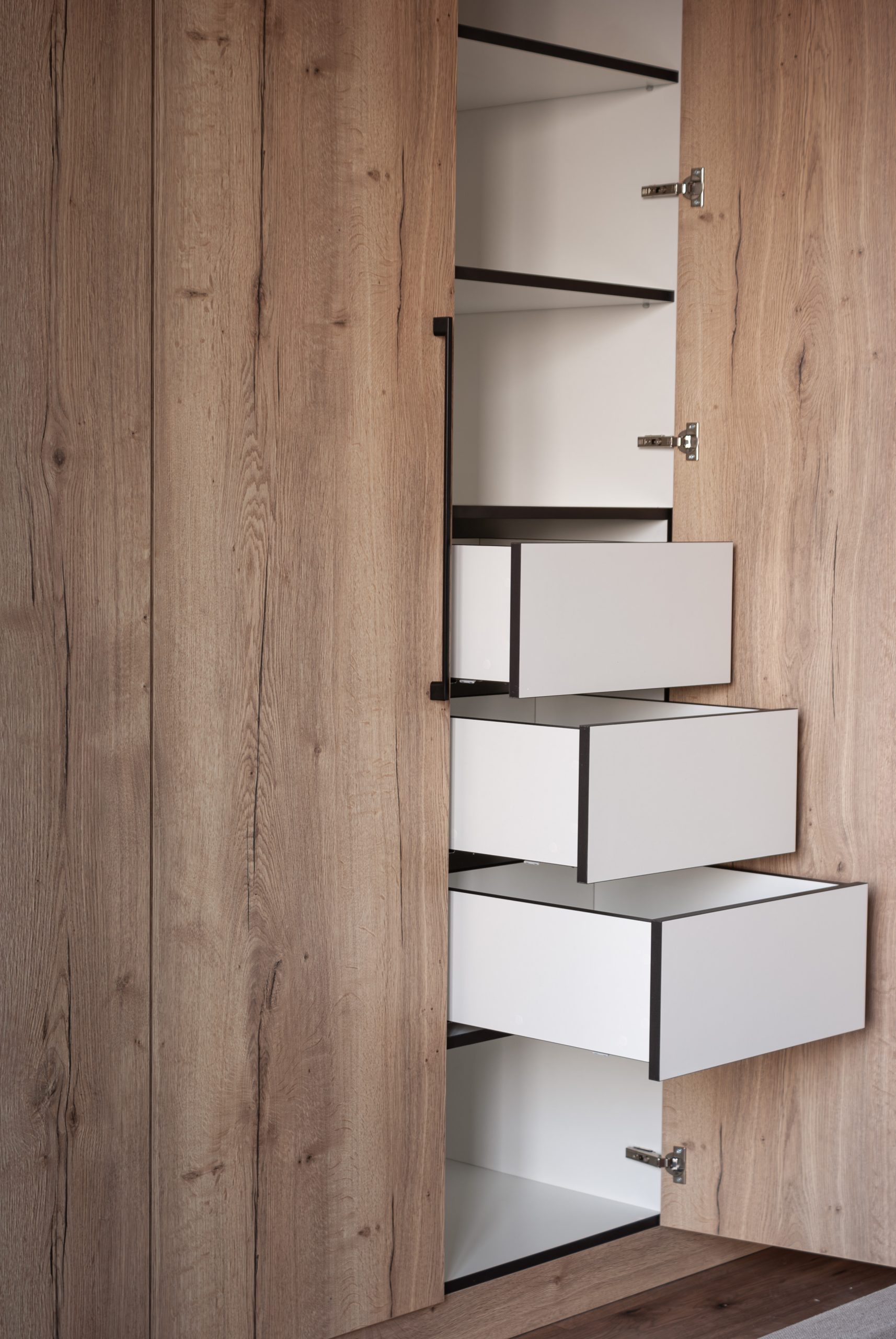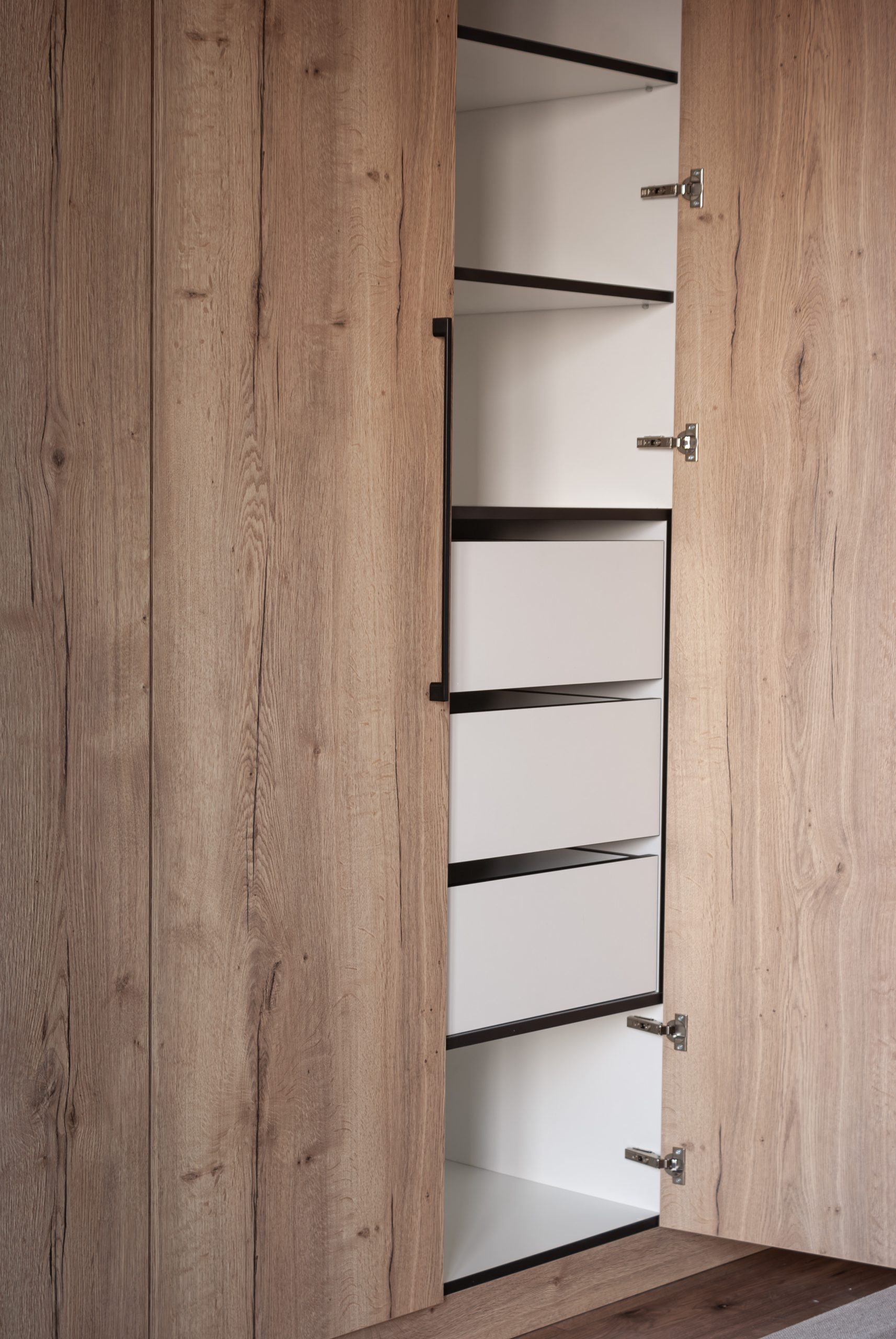 W tym mieszkaniu panuje harmonia stonowanych kolorów – ciepłe odcienie drewna i eleganckie szarości tworzą przytulną atmosferę. Funkcjonalność i estetyka to kluczowe elementy, które wpłynęły na projekt zabudowy meblowej. Czarne wykończenie dodaje charakteru i spójnie łączy kuchnię, łazienkę i sypialnię. Meble na wymiar idealnie dopasowują się do przestrzeni, maksymalizując jej funkcjonalność.