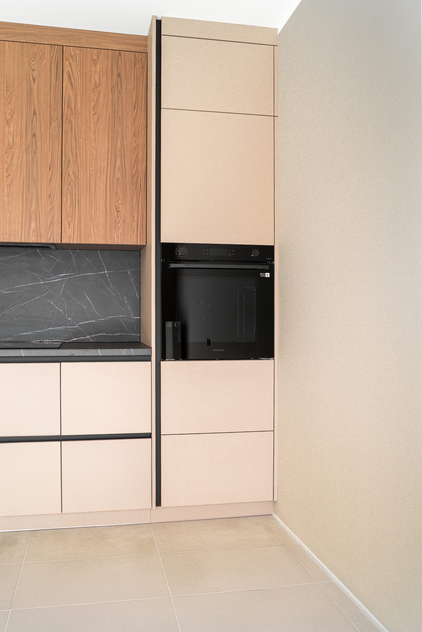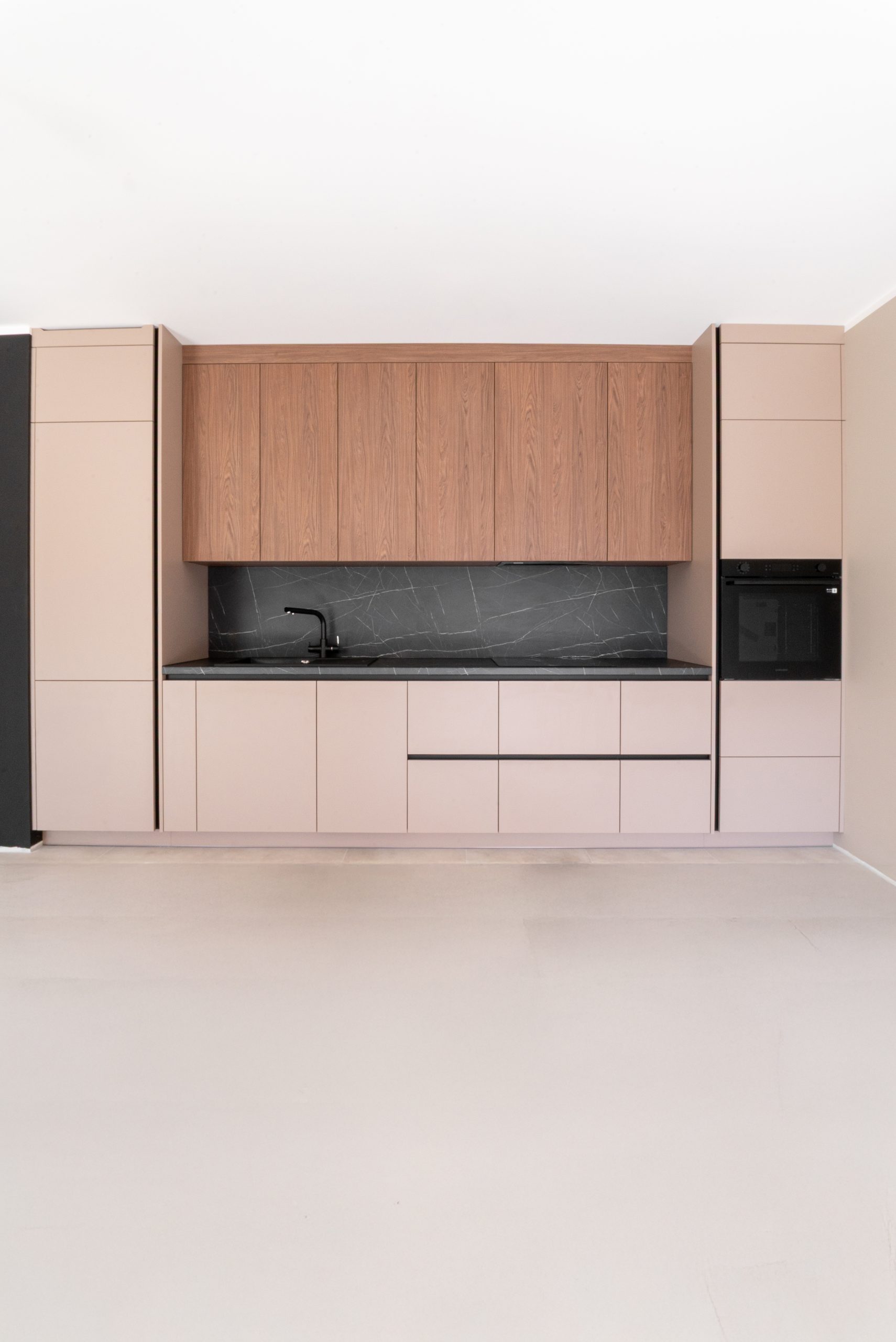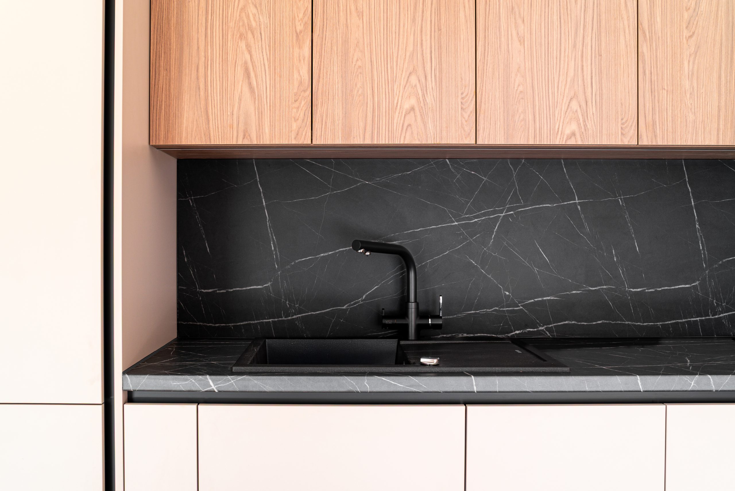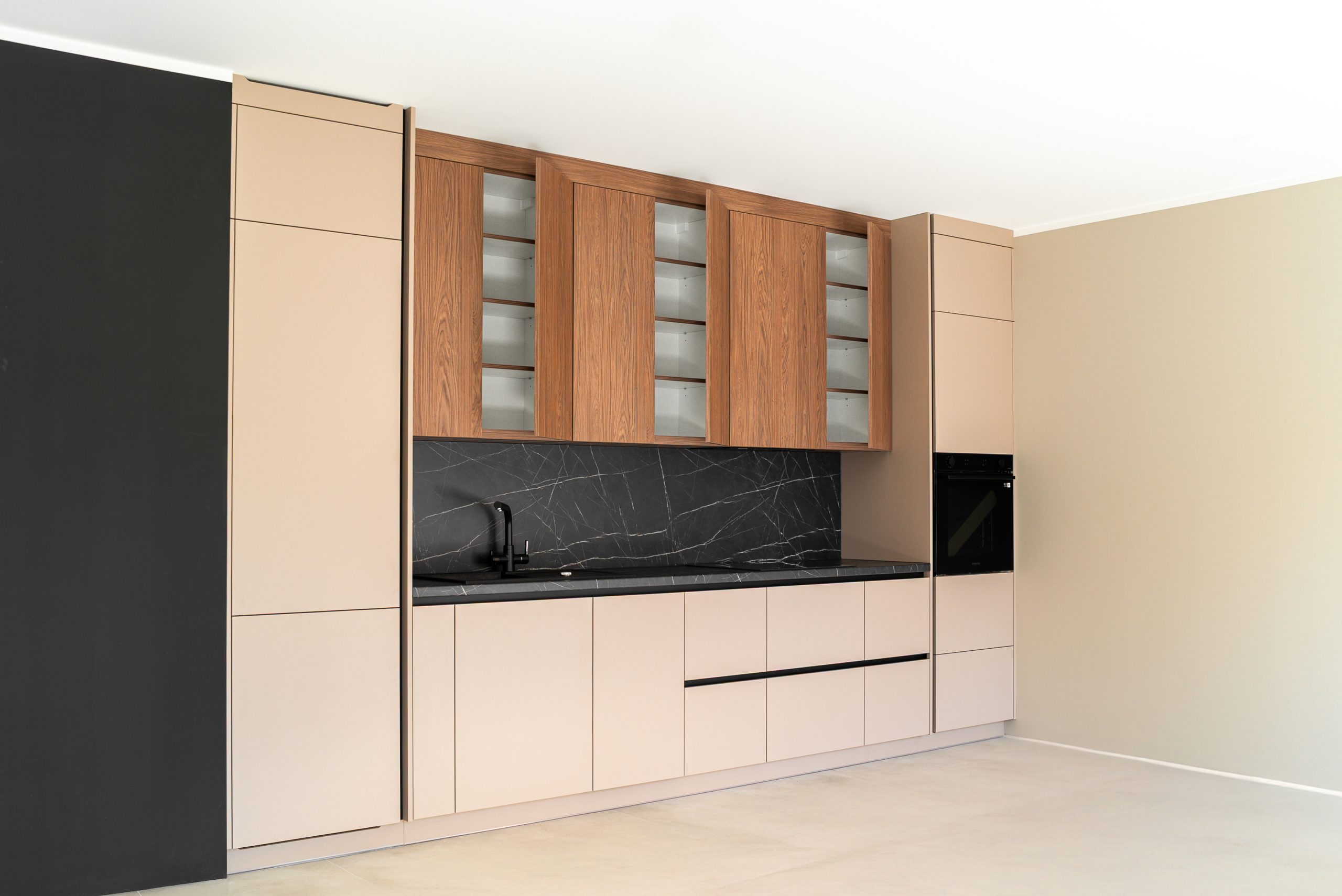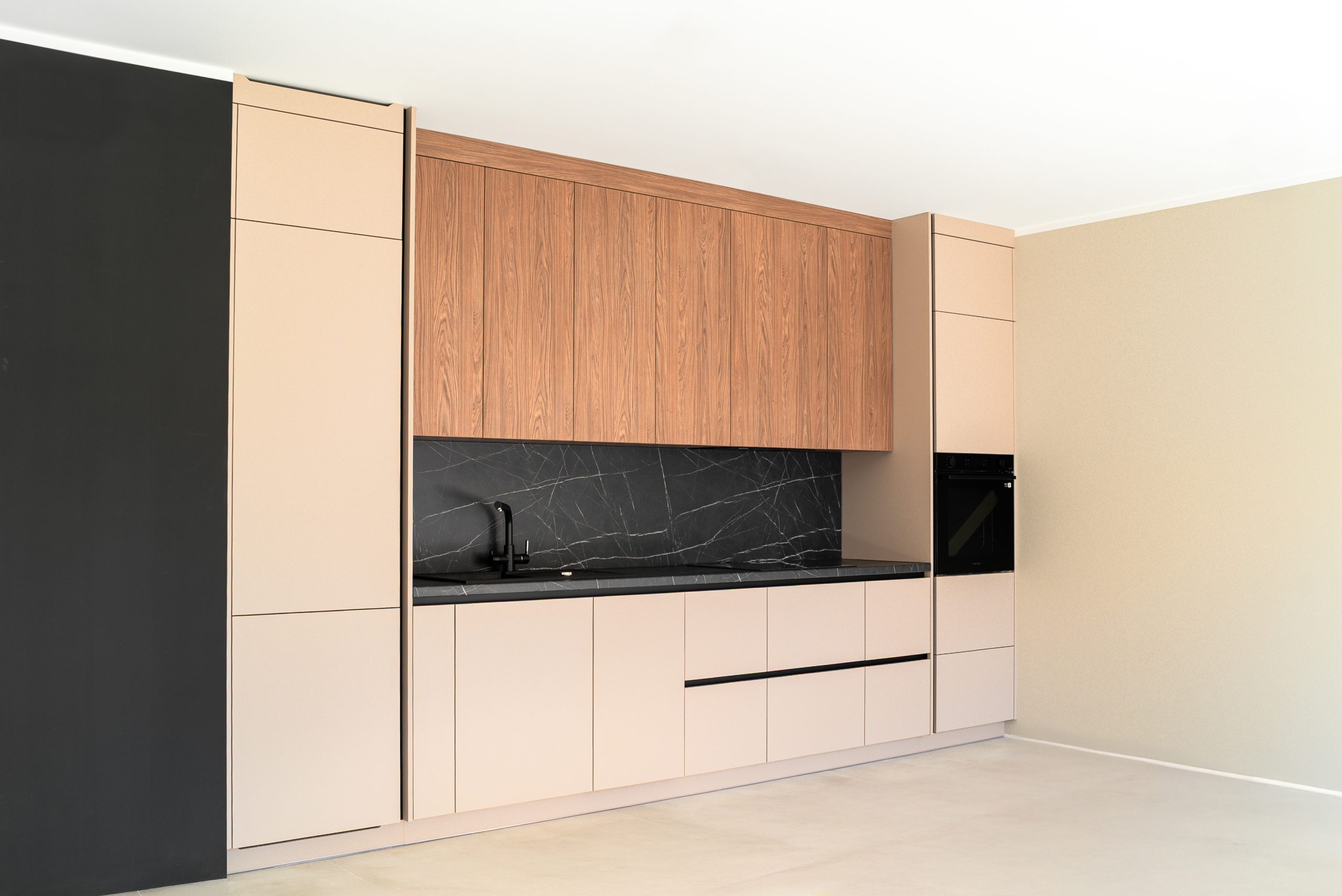 W tym mieszkaniu wykonaliśmy kompleksową zabudowę kuchni, łazienki oraz szafy w korytarzu– wszystko w spójnym, nowoczesnym stylu. Matowe fronty w odcieniu beżu i dębowe dekory w kuchni świetnie komponują się z ciemnym, imitującym kamień blatem i fartuchem kuchennym. W łazience postawiliśmy na elegancką czerń z ryflowanym wykończeniem, która podkreśla minimalistyczny charakter wnętrza. Pojemna szafa z wysokim lustrem w korytarzu maksymalnie wykorzystuje przestrzeń, jednocześnie wtapiając się w architekturę wnętrza.