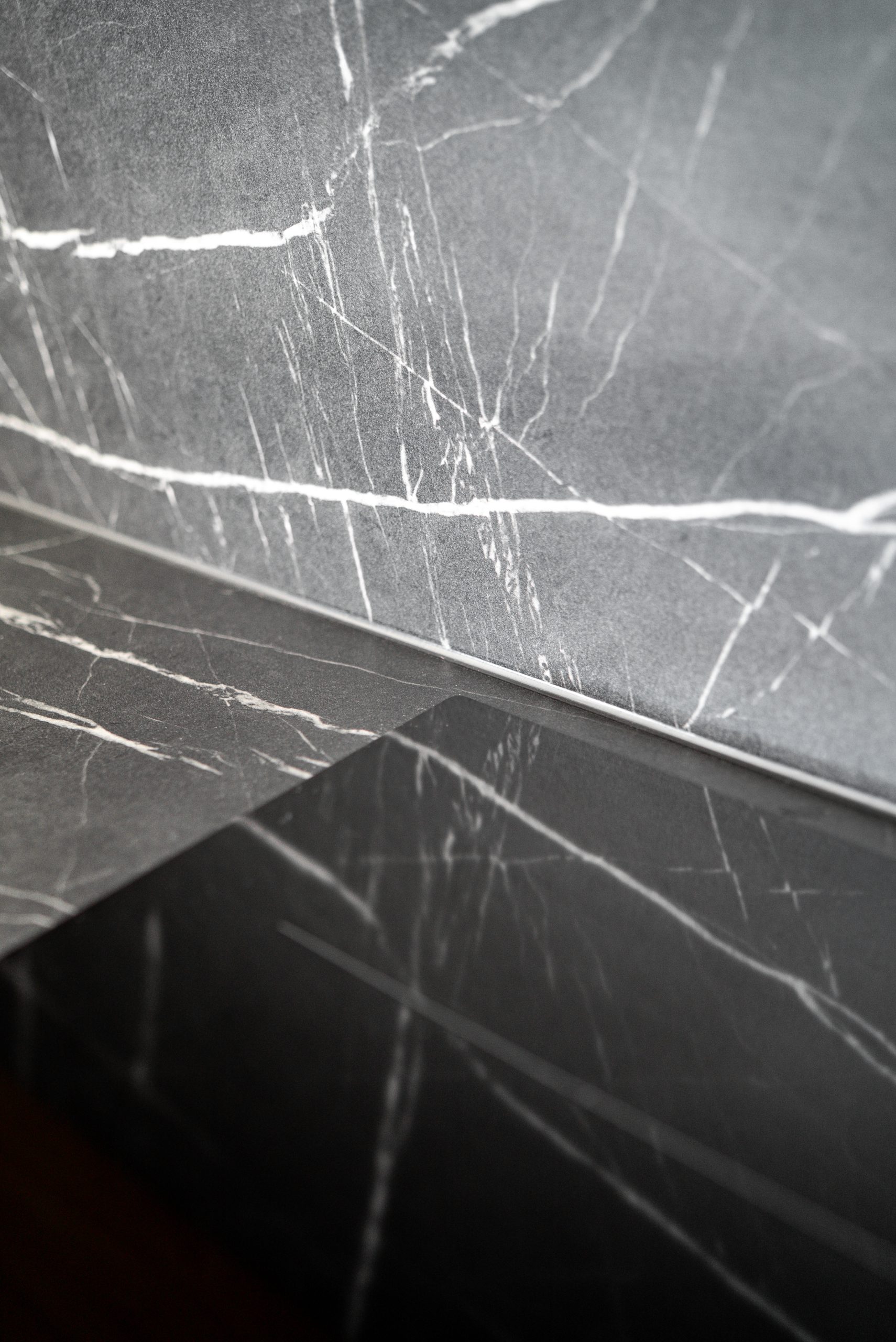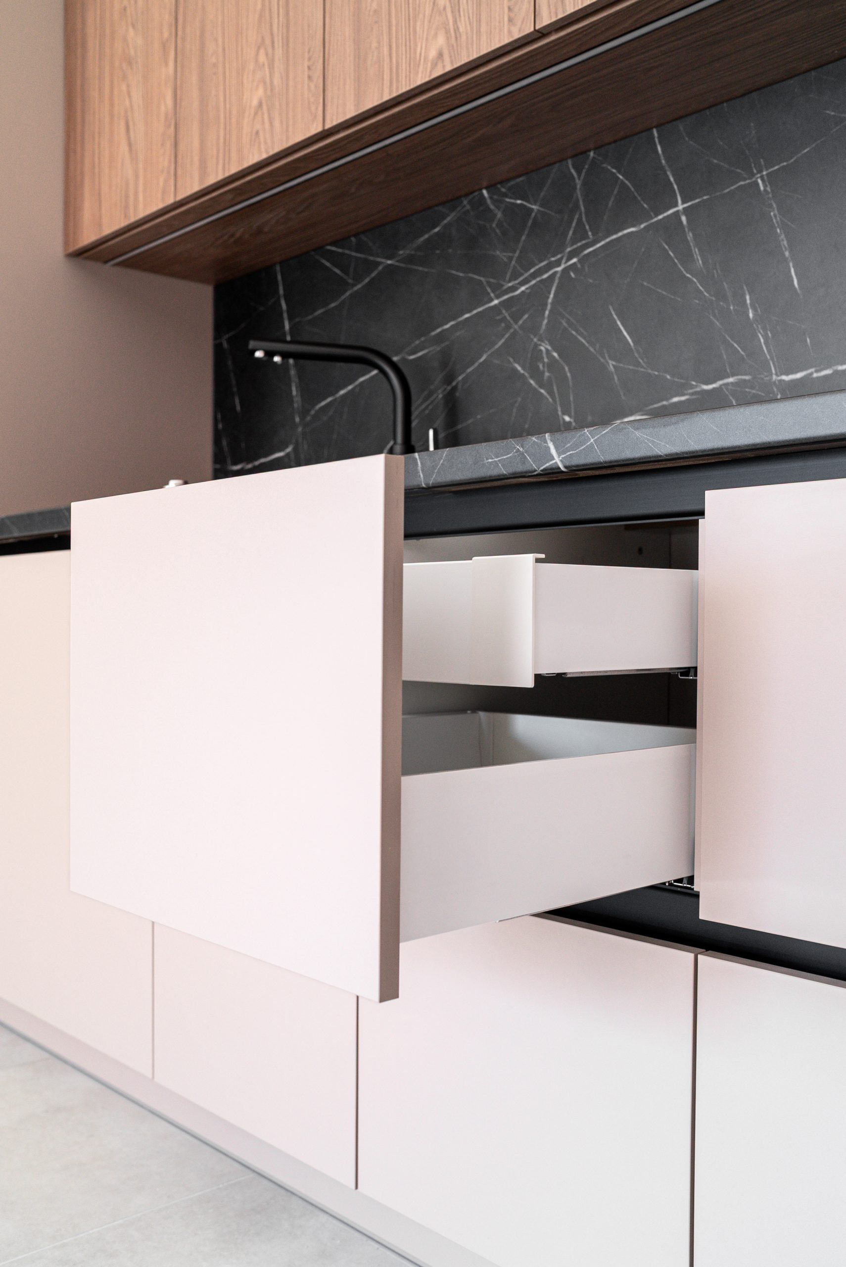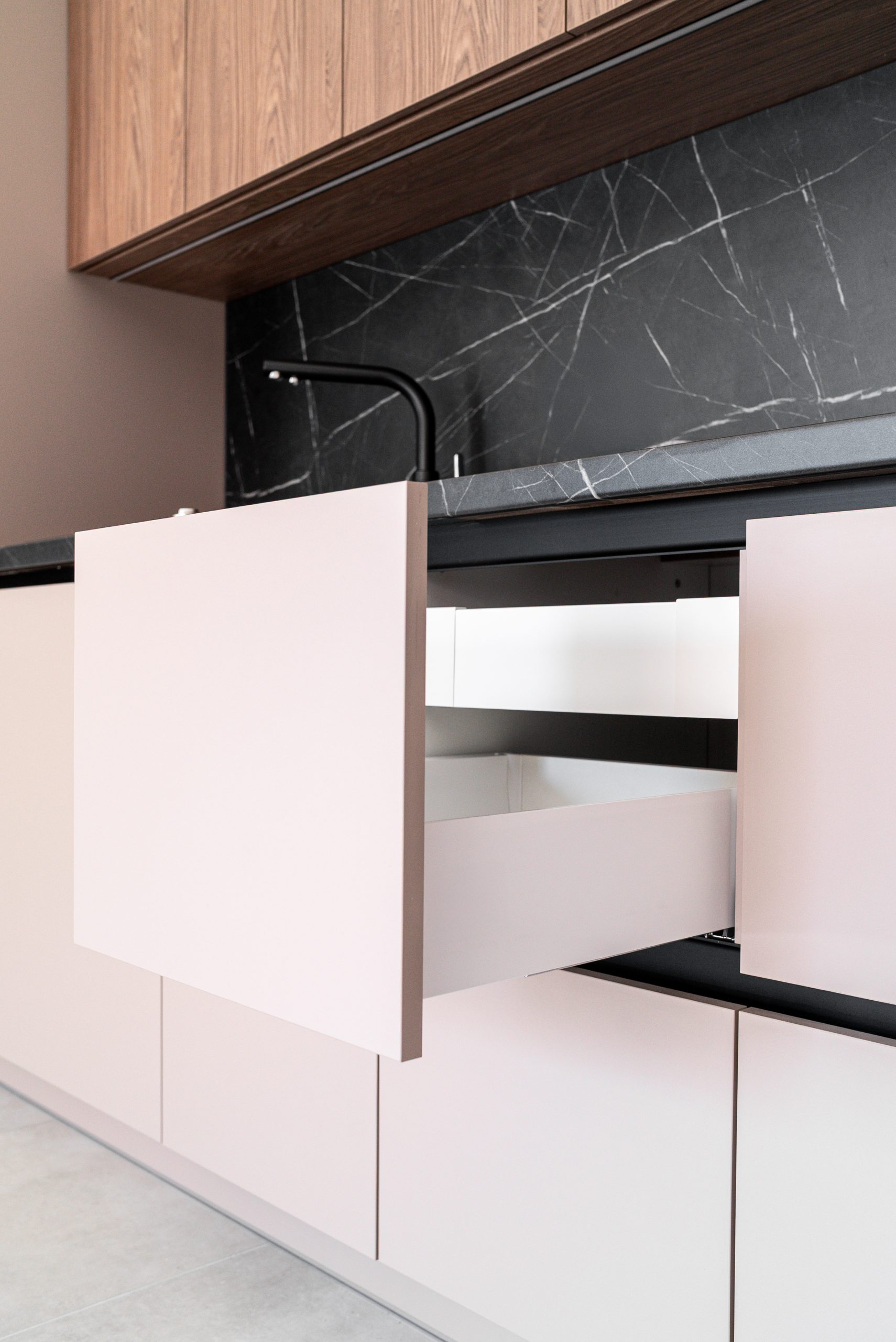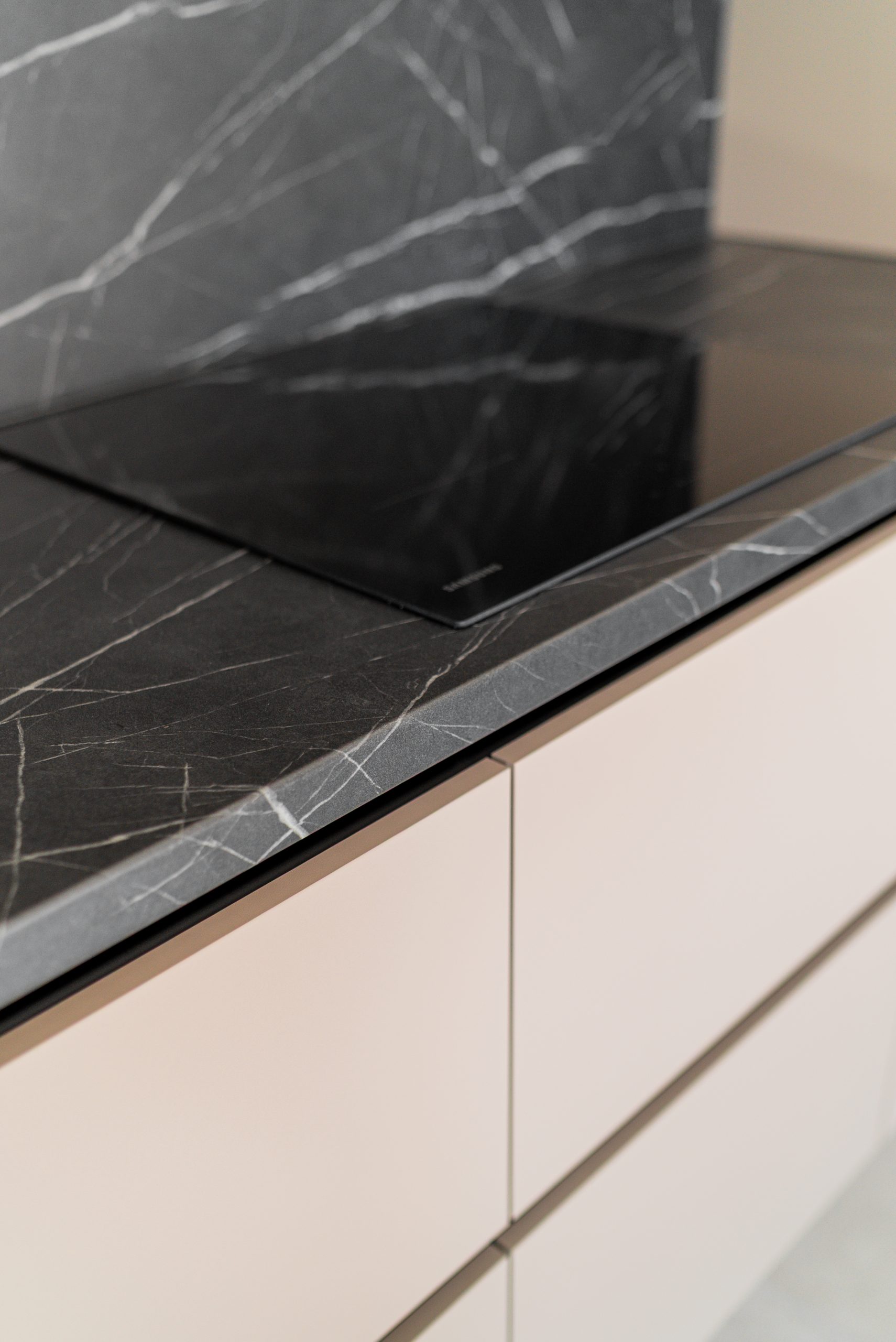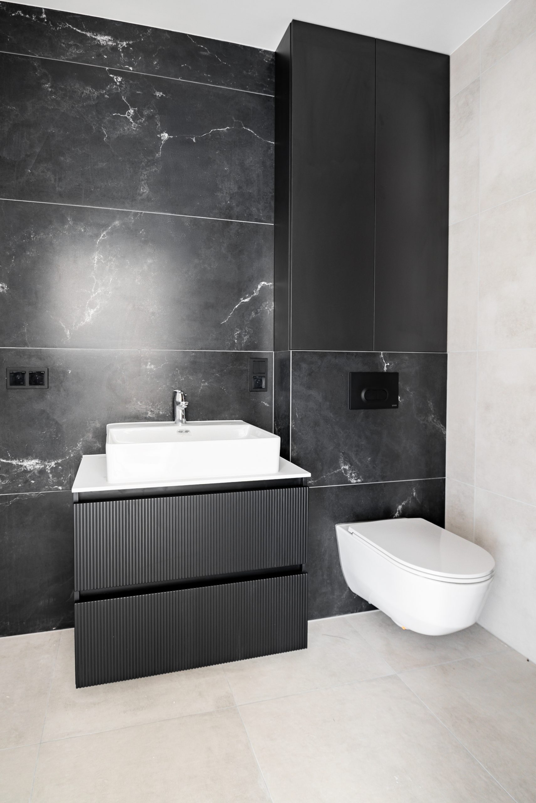 W tym mieszkaniu wykonaliśmy kompleksową zabudowę kuchni, łazienki oraz szafy w korytarzu– wszystko w spójnym, nowoczesnym stylu. Matowe fronty w odcieniu beżu i dębowe dekory w kuchni świetnie komponują się z ciemnym, imitującym kamień blatem i fartuchem kuchennym. W łazience postawiliśmy na elegancką czerń z ryflowanym wykończeniem, która podkreśla minimalistyczny charakter wnętrza. Pojemna szafa z wysokim lustrem w korytarzu maksymalnie wykorzystuje przestrzeń, jednocześnie wtapiając się w architekturę wnętrza.