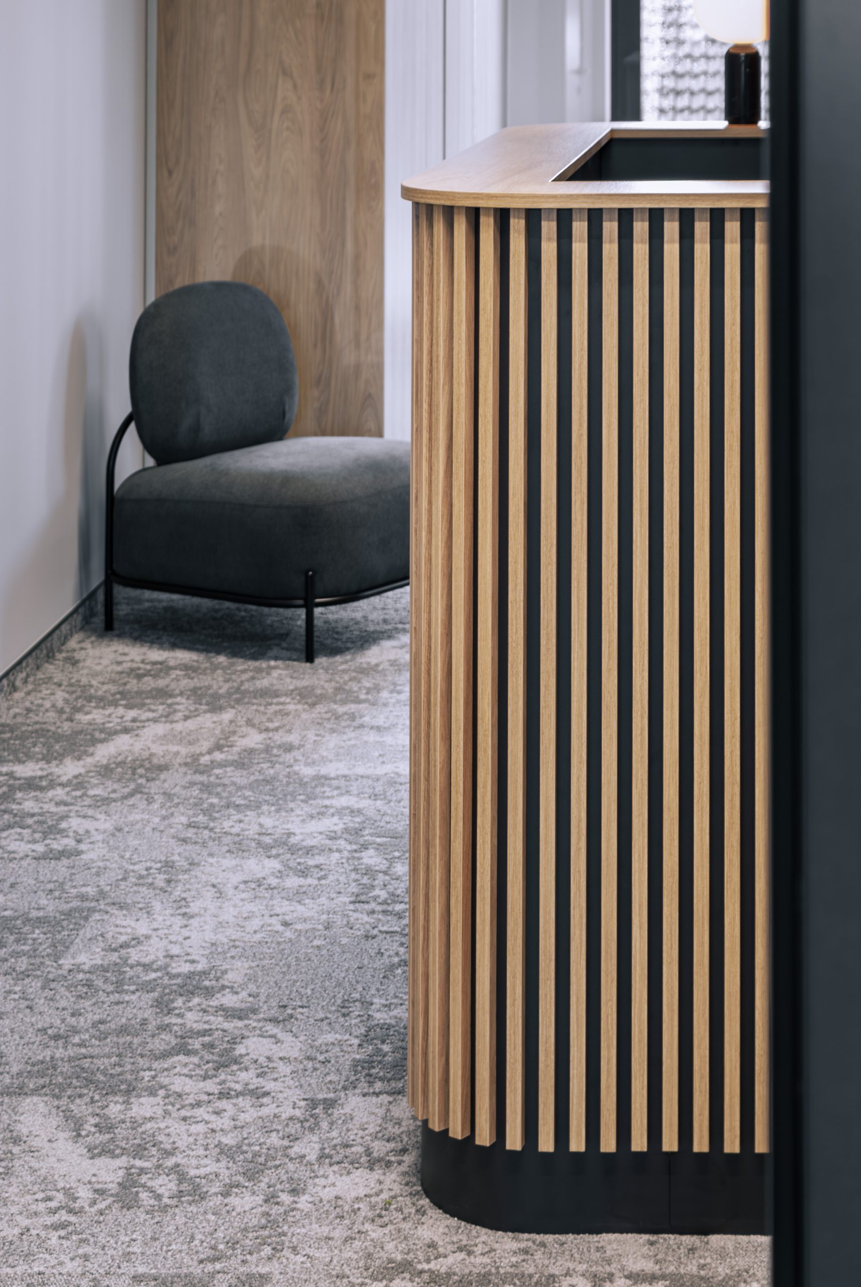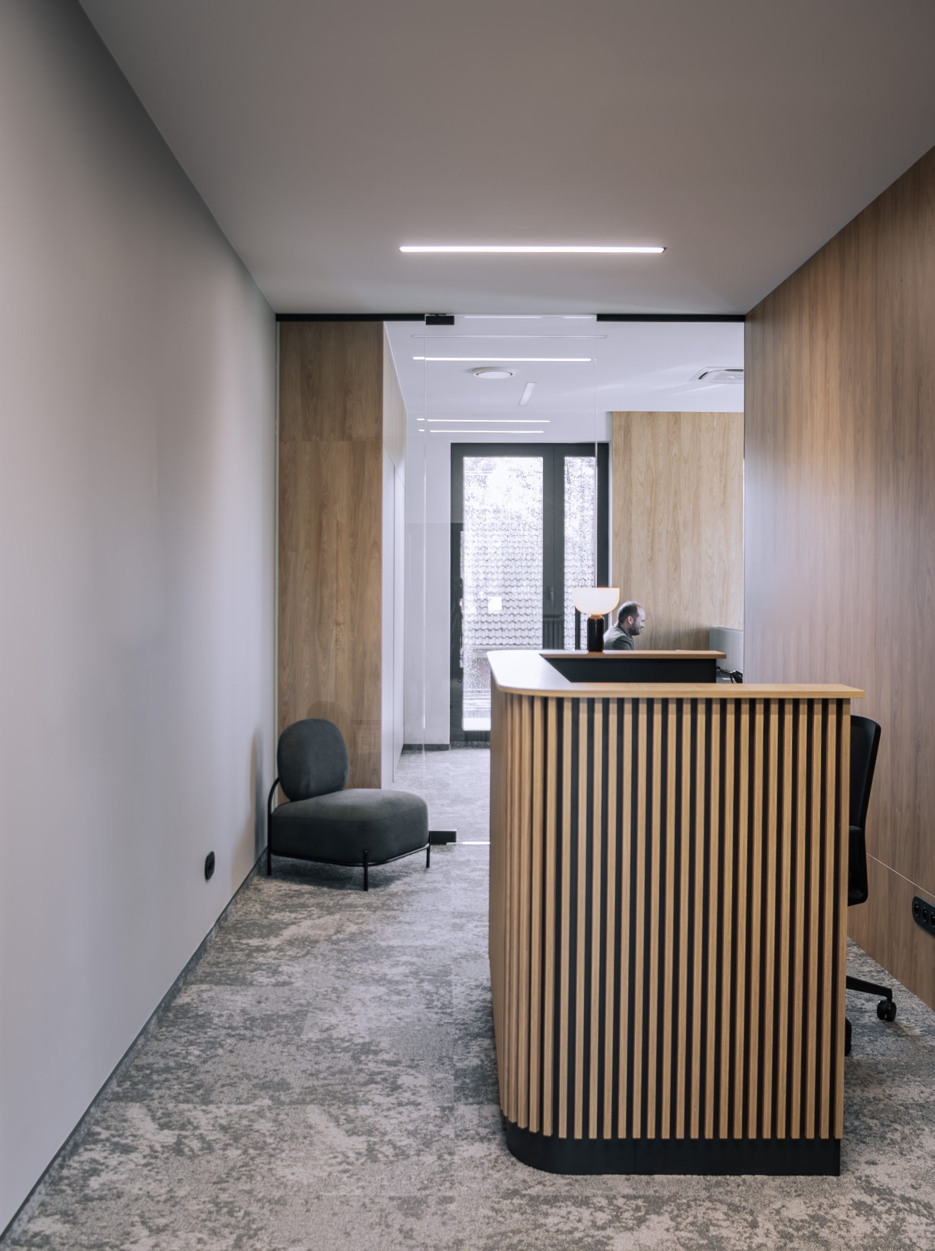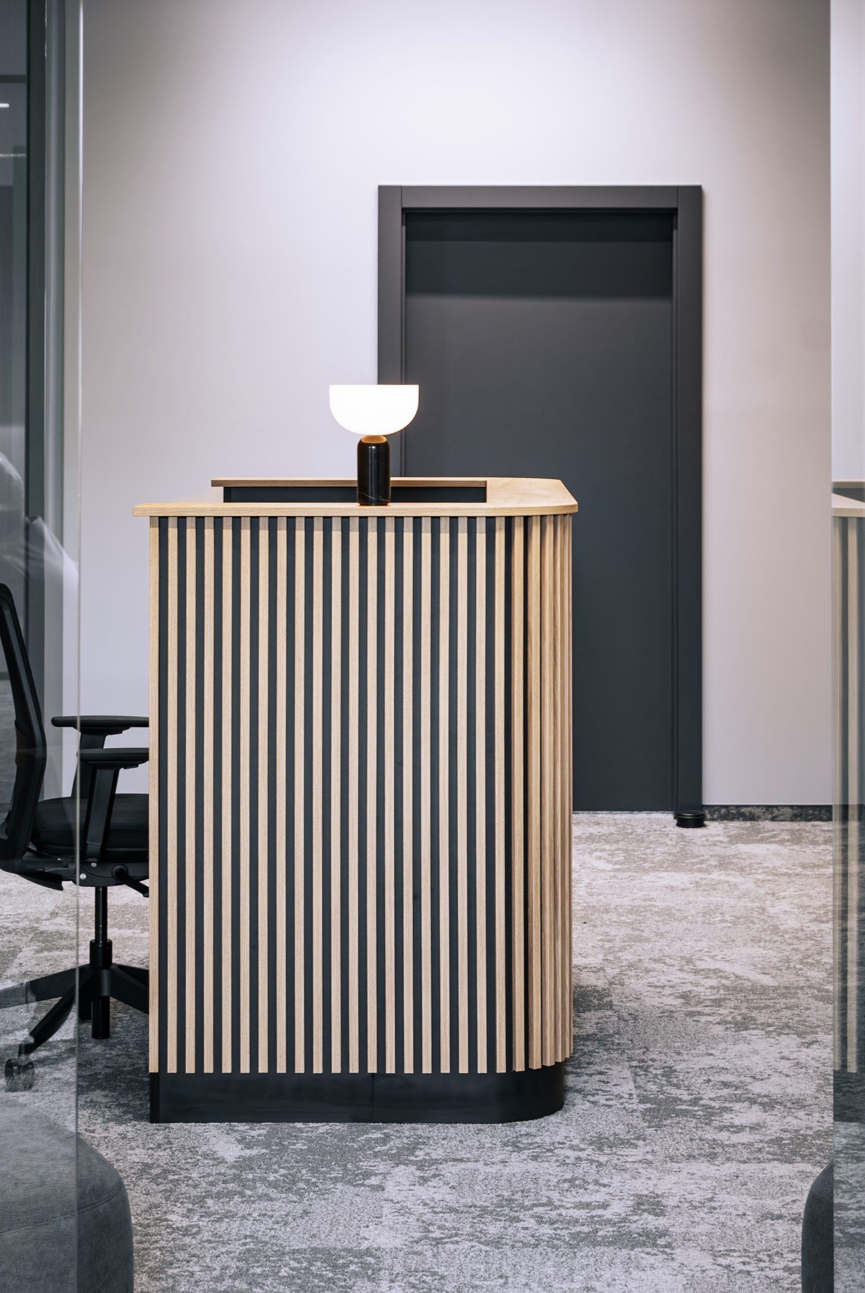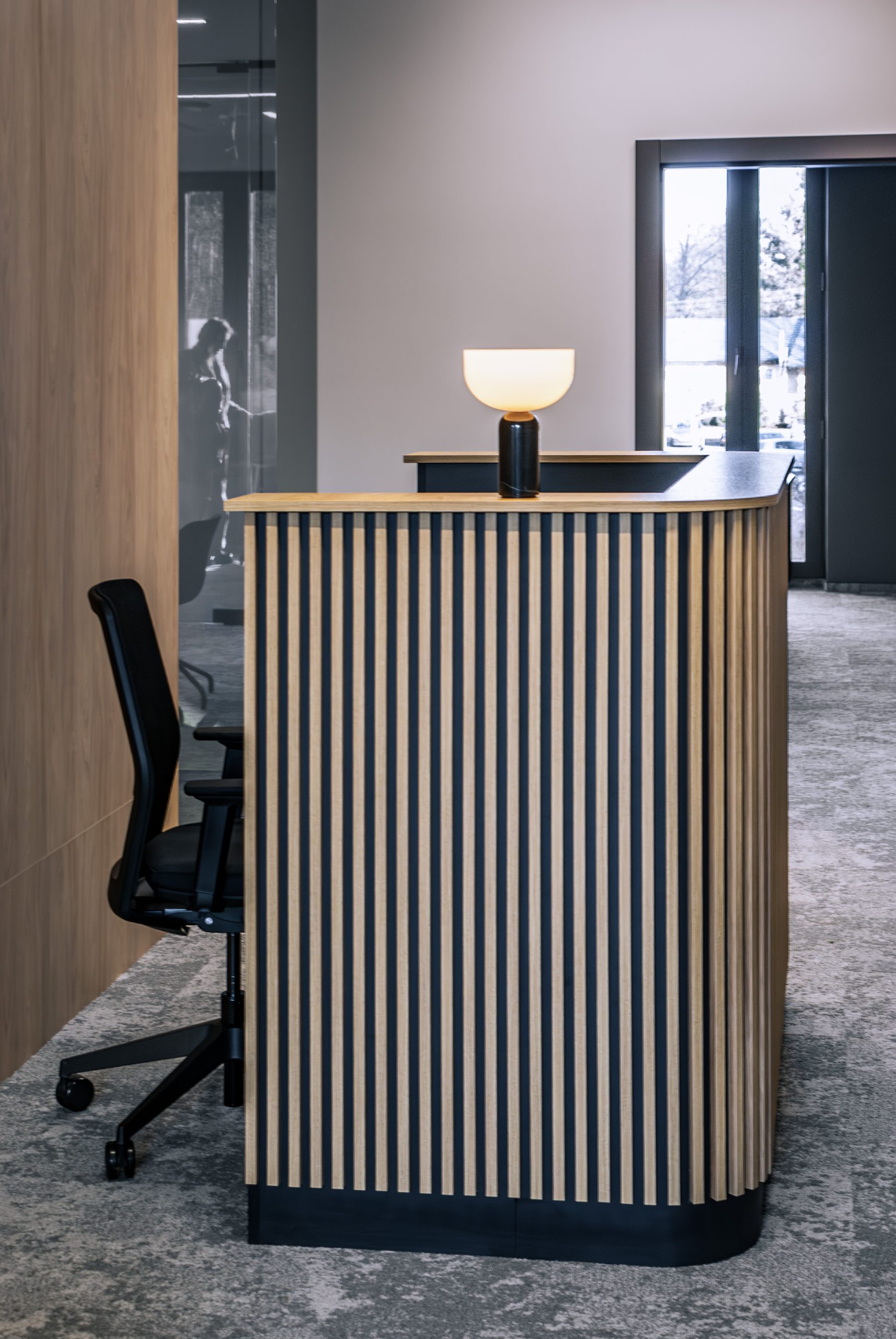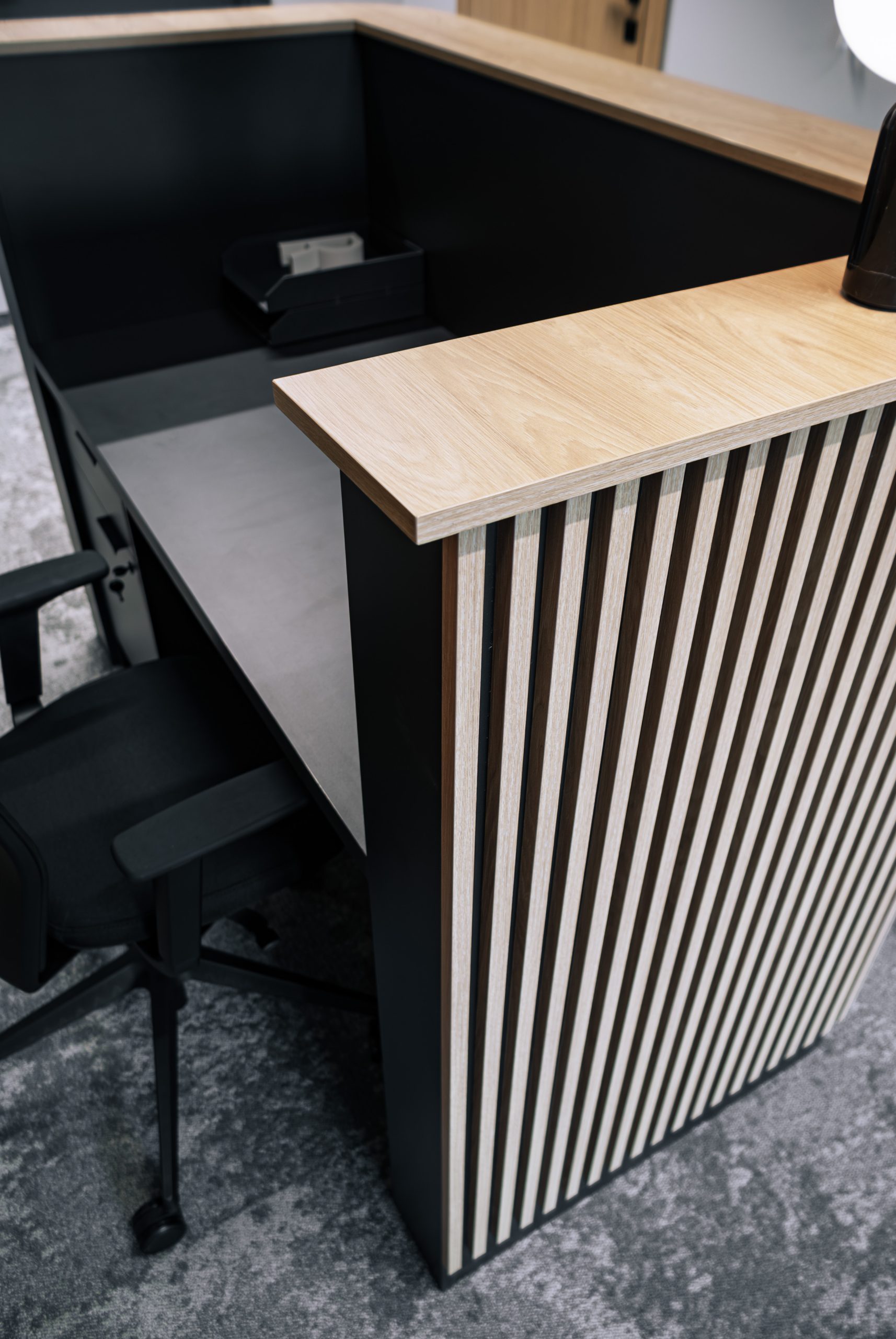 Aranżacja przestrzeni biurowej obejmowała ladę recepcyjną, salę konferencyjną, kuchnie pracowniczą oraz pomieszczenie do pracy. Połączenie czerni z drewnem tworzy nowoczesny i stylowy efekt, a subtelne szare dodatki w małej kuchni dodają całości harmonii. Zaokrąglona recepcja z dodatkiem lameli przyciąga wzrok już od wejścia. Zabudowa szaf pod sufit w biurze, zapewnia mnóstwo miejsca do przechowywania dokumentacji, a pojemne półki idealnie organizują przestrzeń. Szklana podświetlana gablota, otwarta półka oraz okładzina ścienna z płyty stały się elementem dekoracji, która wyróżnia tą przestrzeń.