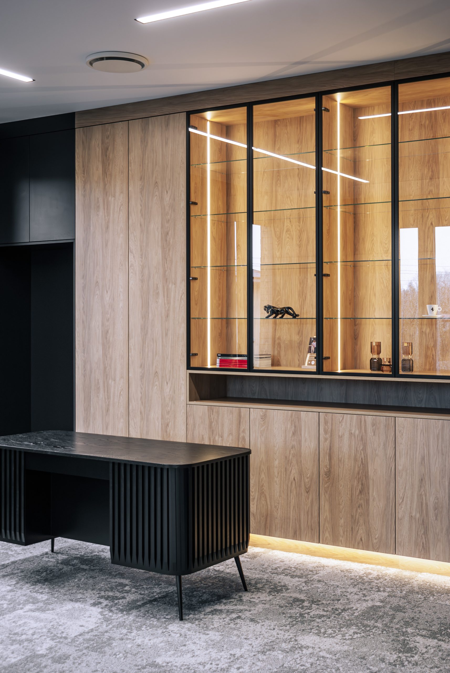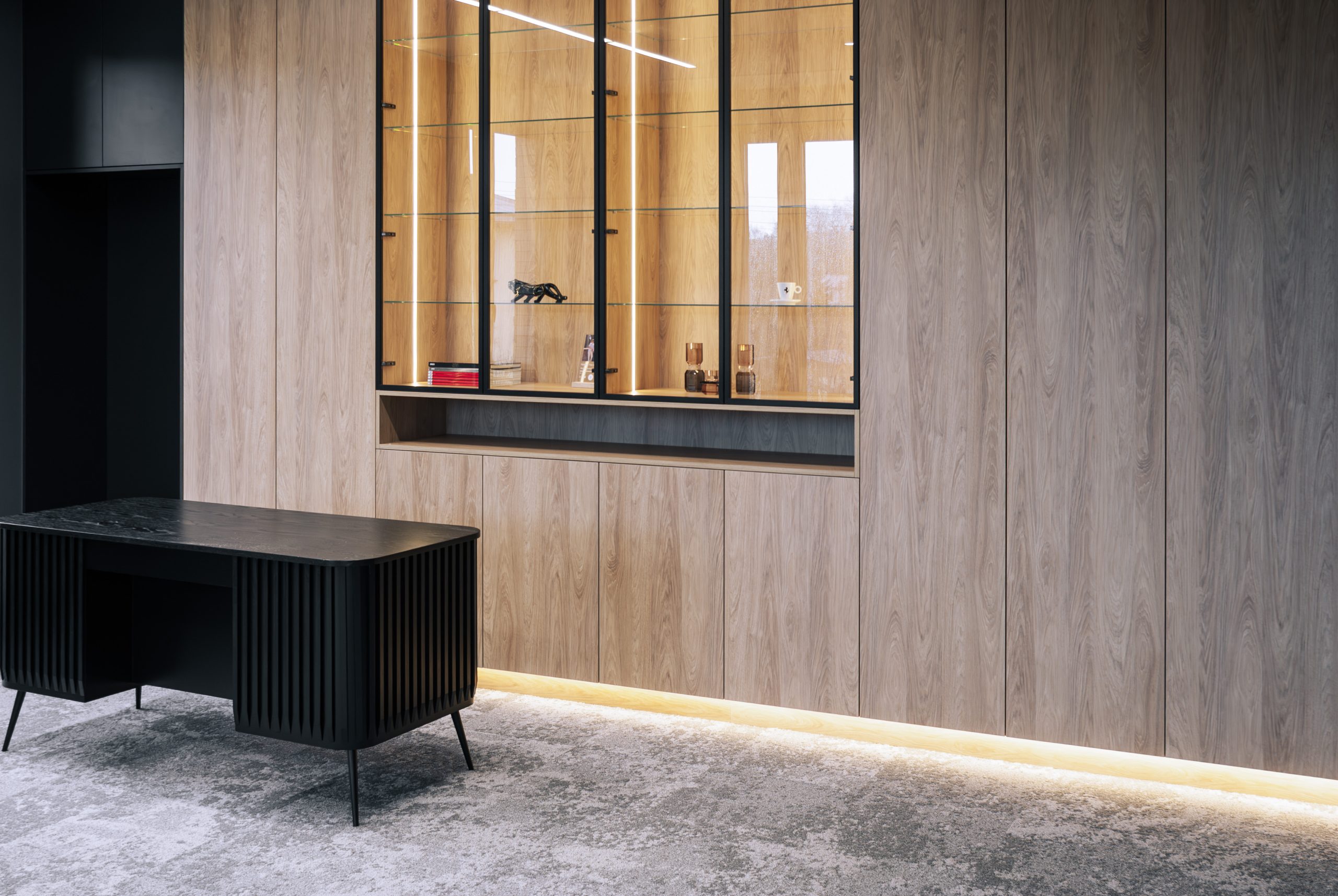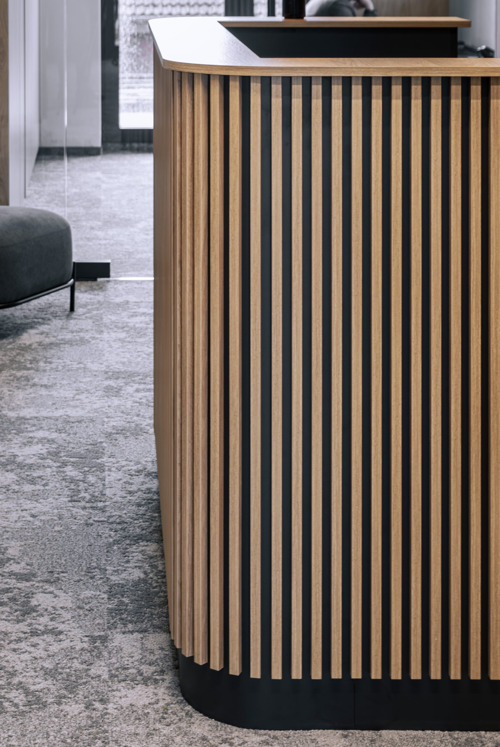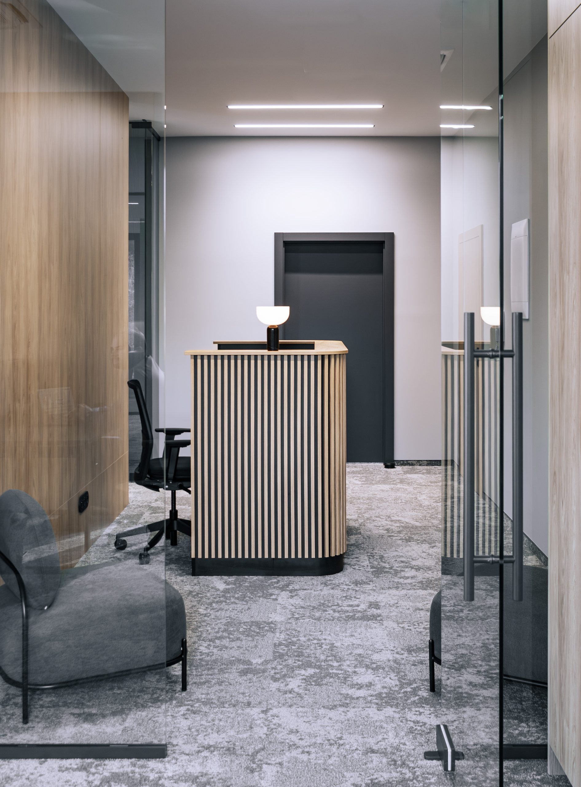 Aranżacja przestrzeni biurowej obejmowała ladę recepcyjną, salę konferencyjną, kuchnie pracowniczą oraz pomieszczenie do pracy. Połączenie czerni z drewnem tworzy nowoczesny i stylowy efekt, a subtelne szare dodatki w małej kuchni dodają całości harmonii. Zaokrąglona recepcja z dodatkiem lameli przyciąga wzrok już od wejścia. Zabudowa szaf pod sufit w biurze, zapewnia mnóstwo miejsca do przechowywania dokumentacji, a pojemne półki idealnie organizują przestrzeń. Szklana podświetlana gablota, otwarta półka oraz okładzina ścienna z płyty stały się elementem dekoracji, która wyróżnia tą przestrzeń.