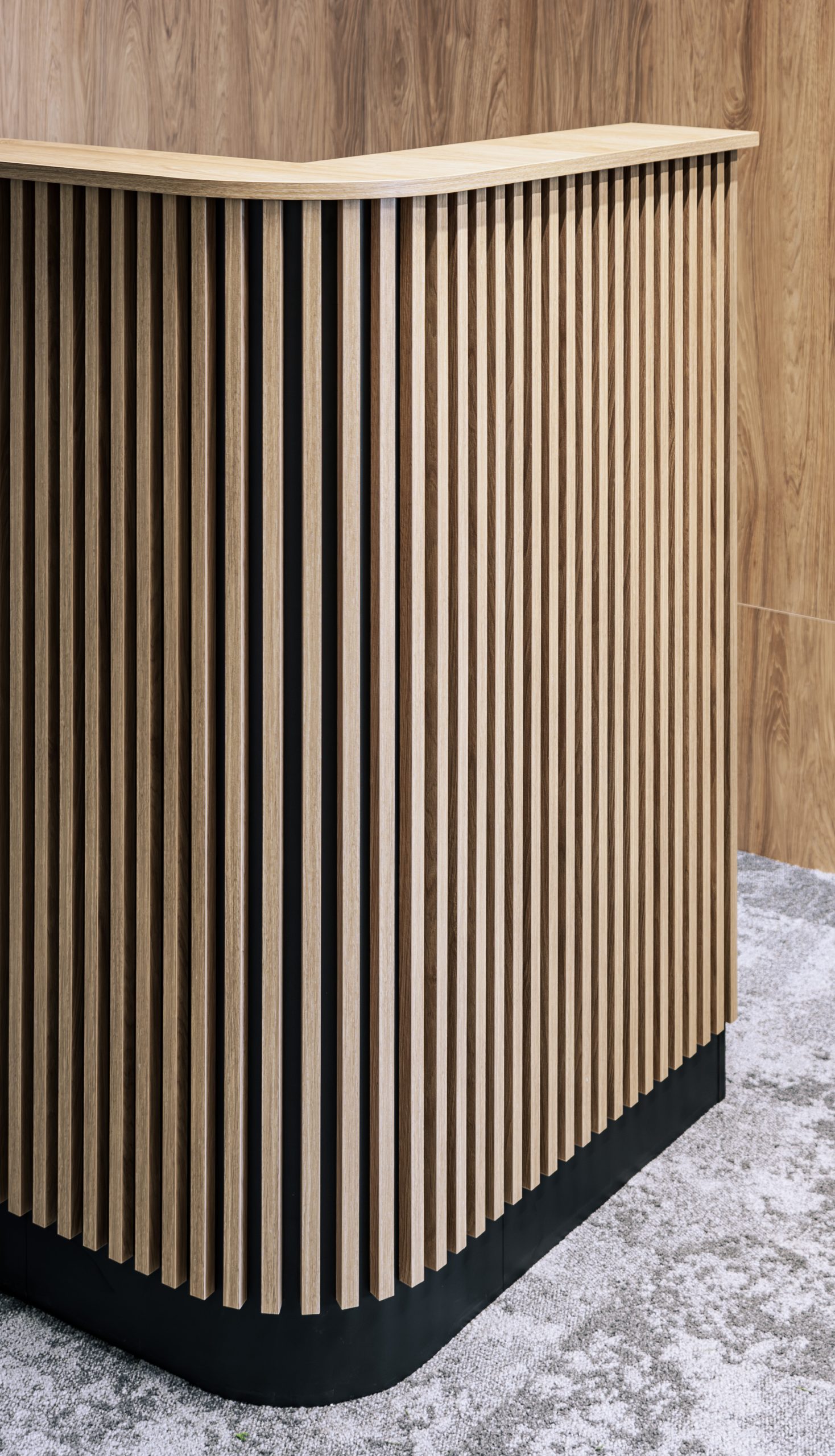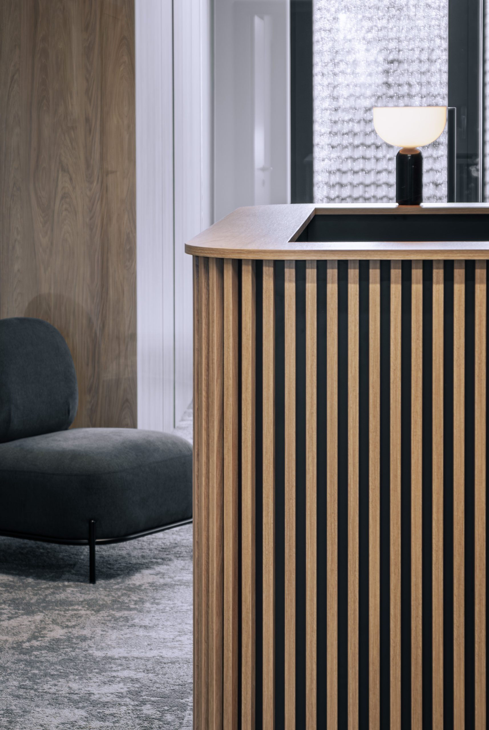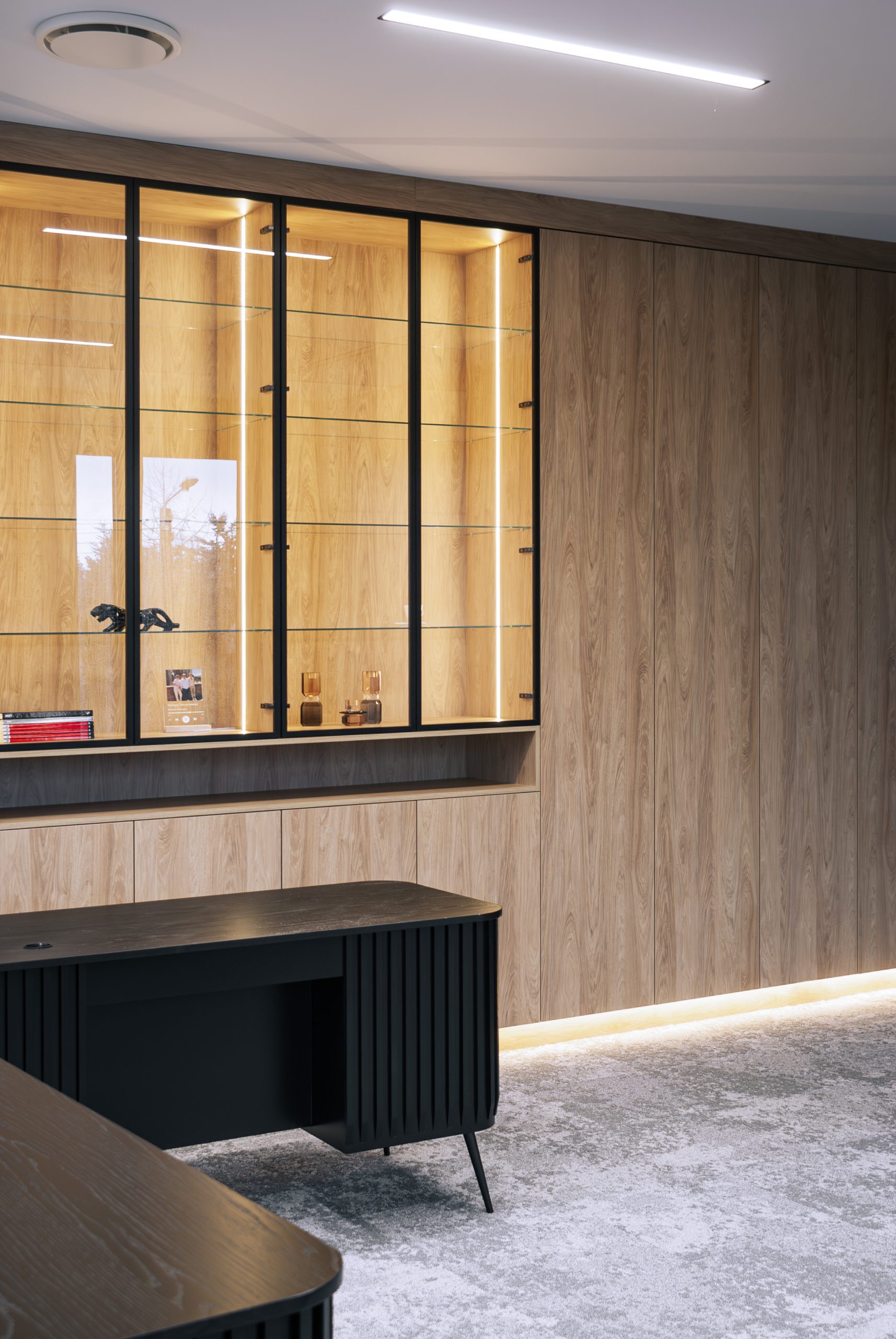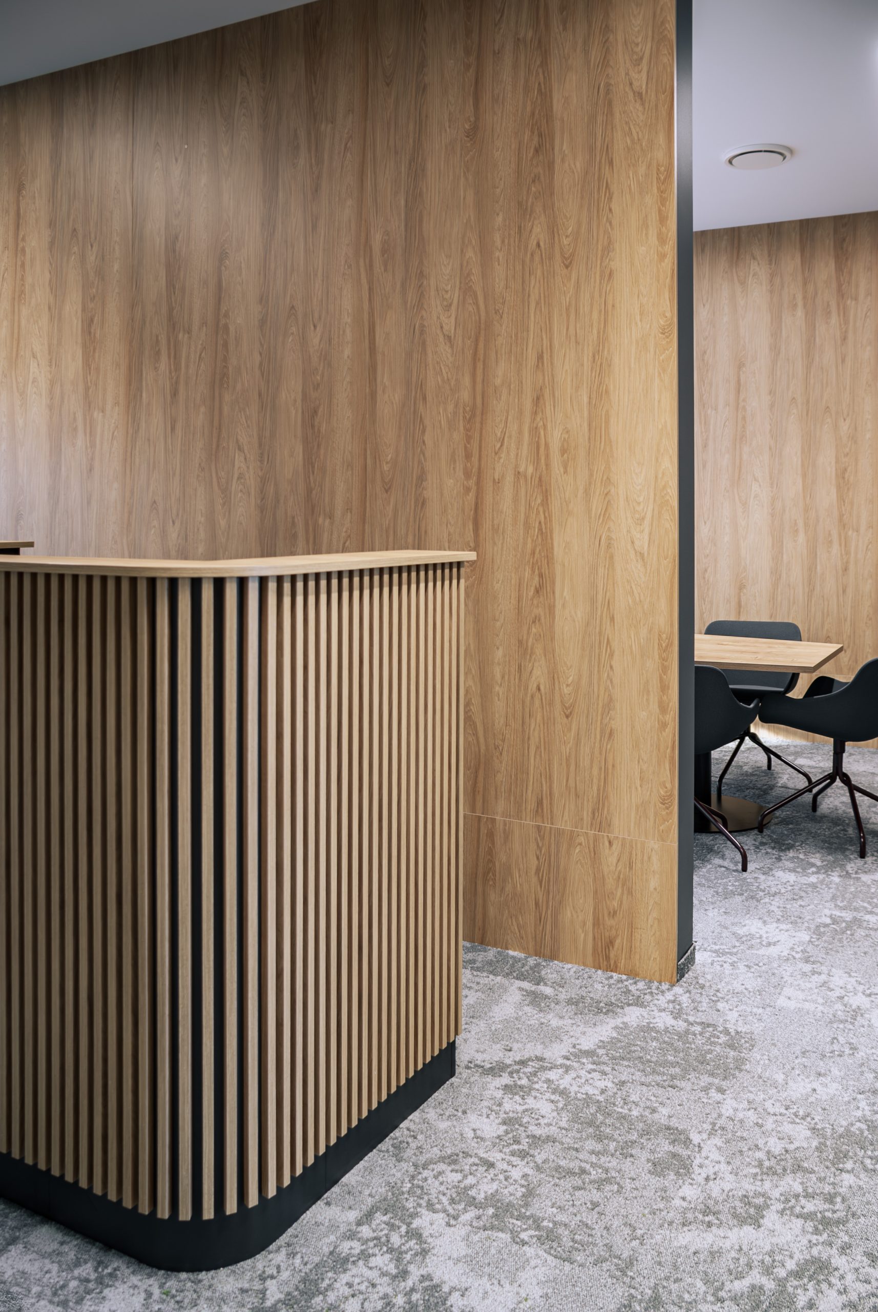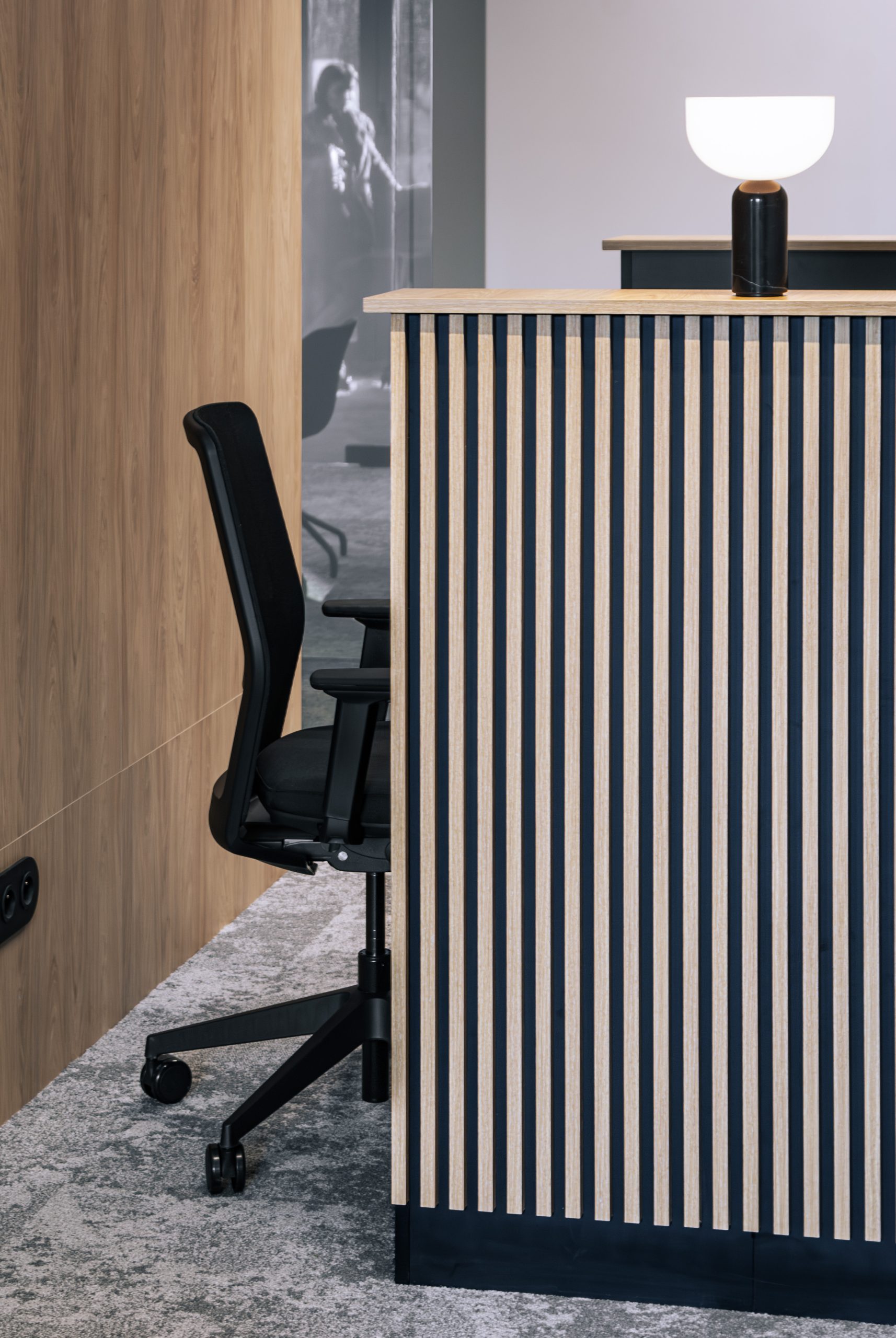 Aranżacja przestrzeni biurowej obejmowała ladę recepcyjną, salę konferencyjną, kuchnie pracowniczą oraz pomieszczenie do pracy. Połączenie czerni z drewnem tworzy nowoczesny i stylowy efekt, a subtelne szare dodatki w małej kuchni dodają całości harmonii. Zaokrąglona recepcja z dodatkiem lameli przyciąga wzrok już od wejścia. Zabudowa szaf pod sufit w biurze, zapewnia mnóstwo miejsca do przechowywania dokumentacji, a pojemne półki idealnie organizują przestrzeń. Szklana podświetlana gablota, otwarta półka oraz okładzina ścienna z płyty stały się elementem dekoracji, która wyróżnia tą przestrzeń.