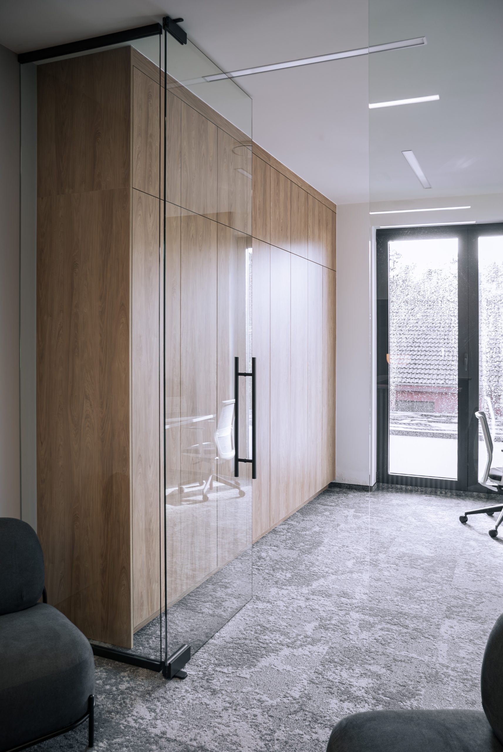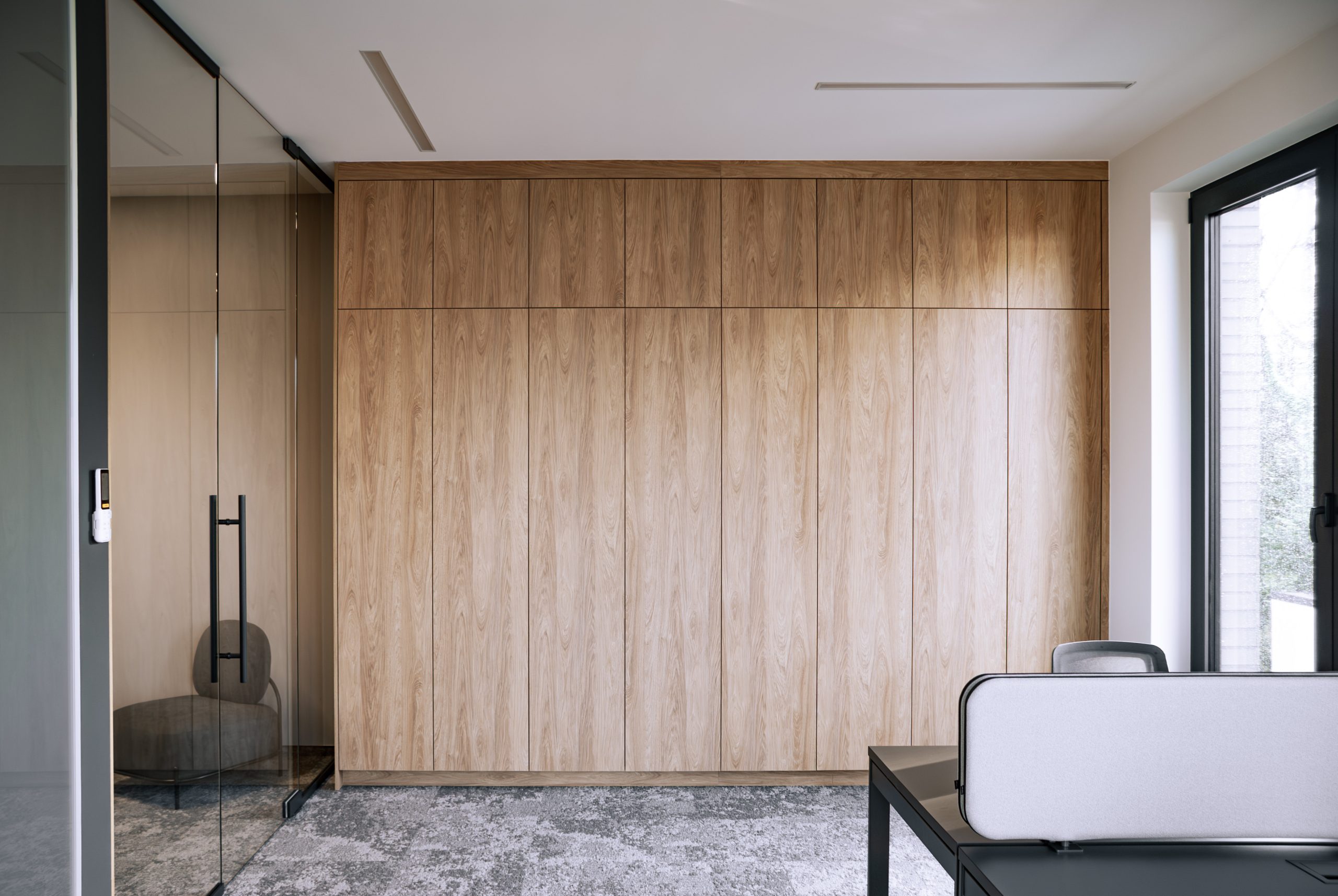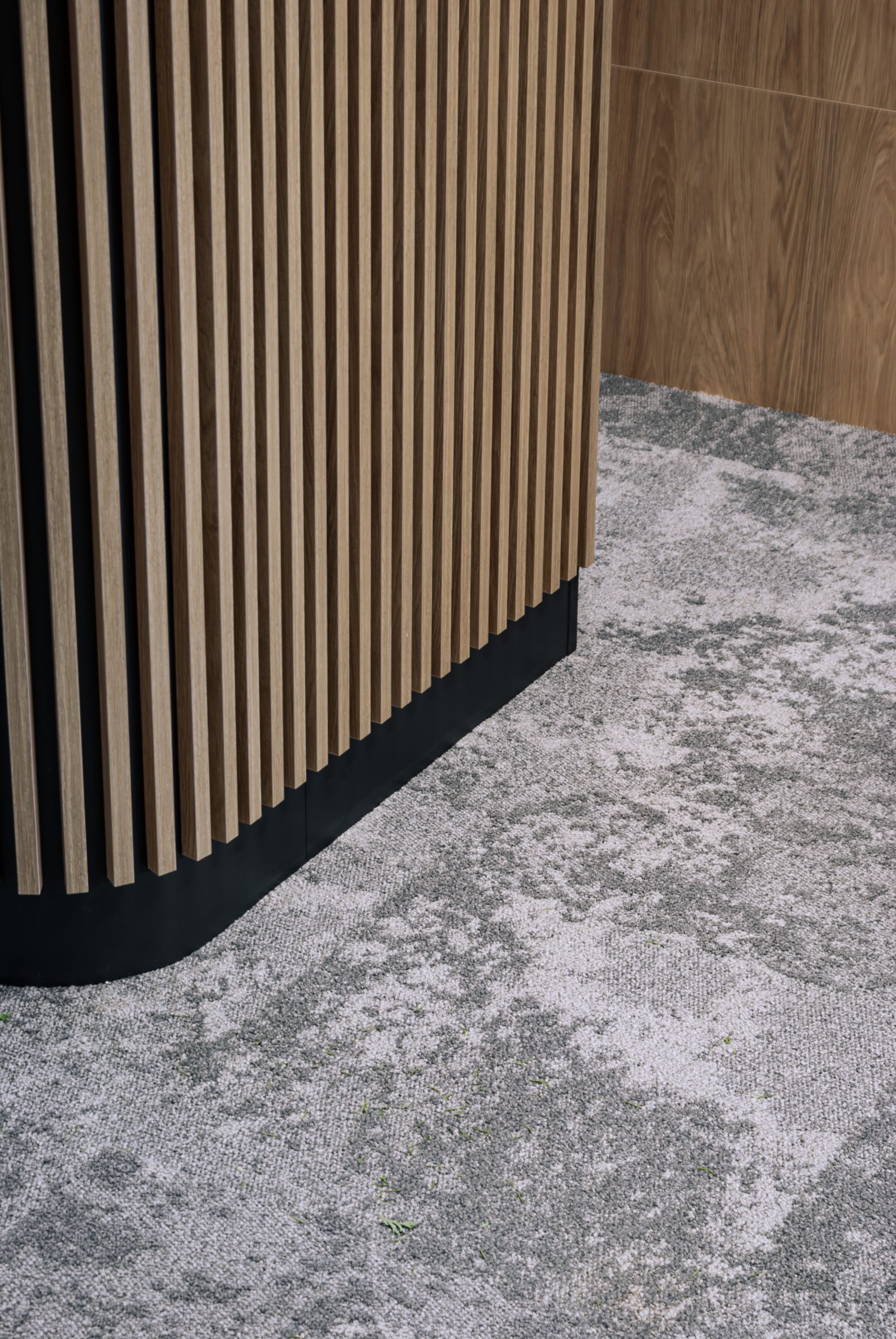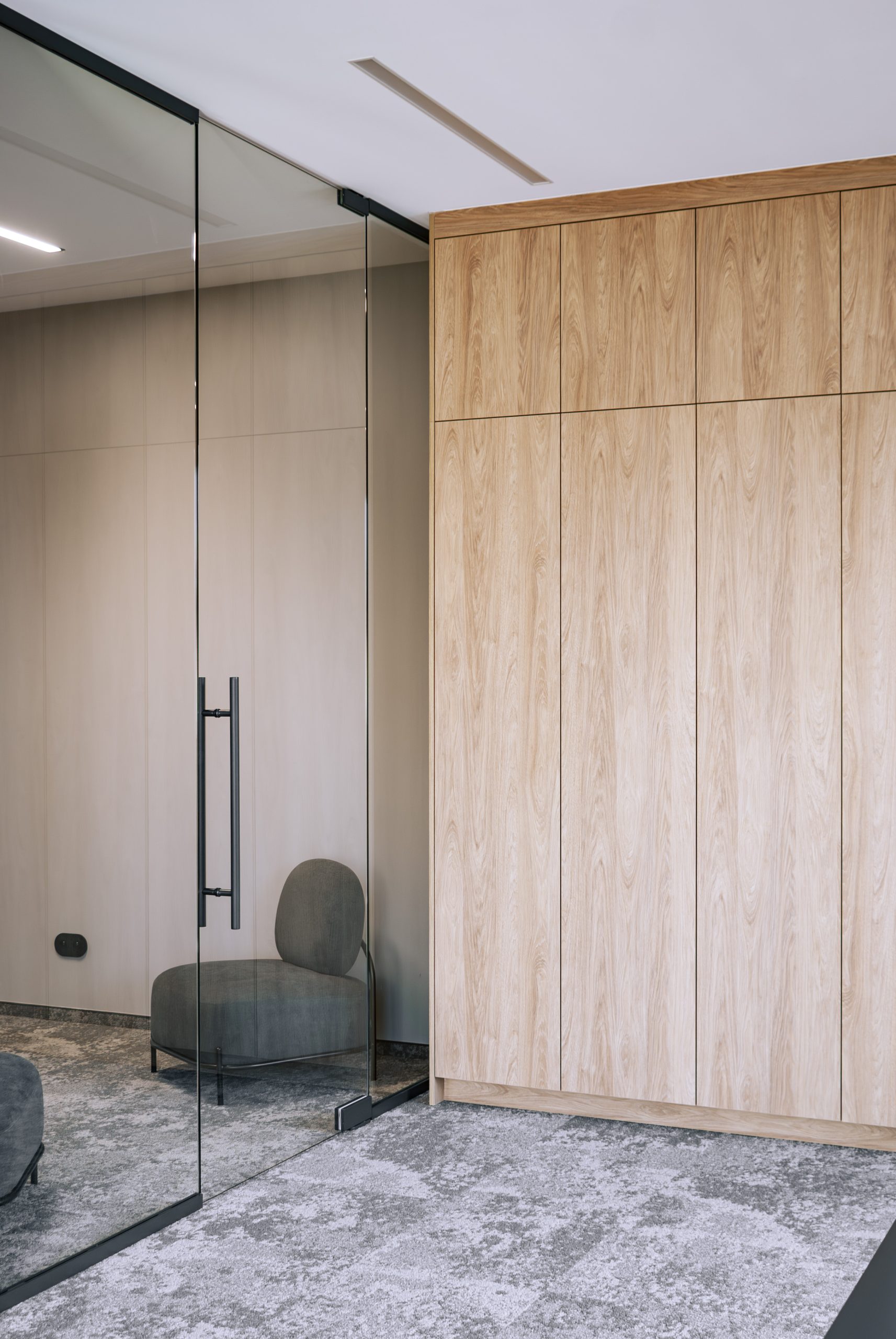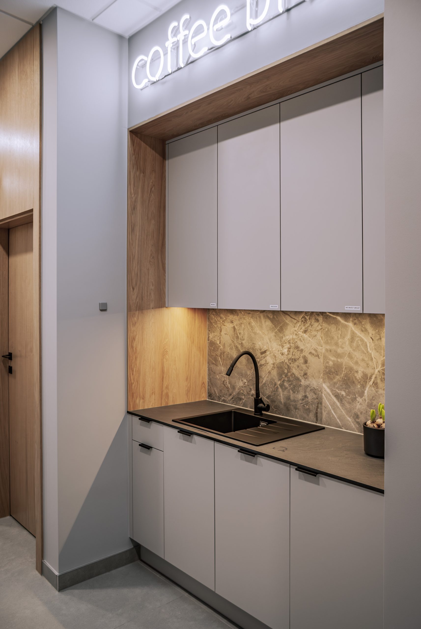 Aranżacja przestrzeni biurowej obejmowała ladę recepcyjną, salę konferencyjną, kuchnie pracowniczą oraz pomieszczenie do pracy. Połączenie czerni z drewnem tworzy nowoczesny i stylowy efekt, a subtelne szare dodatki w małej kuchni dodają całości harmonii. Zaokrąglona recepcja z dodatkiem lameli przyciąga wzrok już od wejścia. Zabudowa szaf pod sufit w biurze, zapewnia mnóstwo miejsca do przechowywania dokumentacji, a pojemne półki idealnie organizują przestrzeń. Szklana podświetlana gablota, otwarta półka oraz okładzina ścienna z płyty stały się elementem dekoracji, która wyróżnia tą przestrzeń.