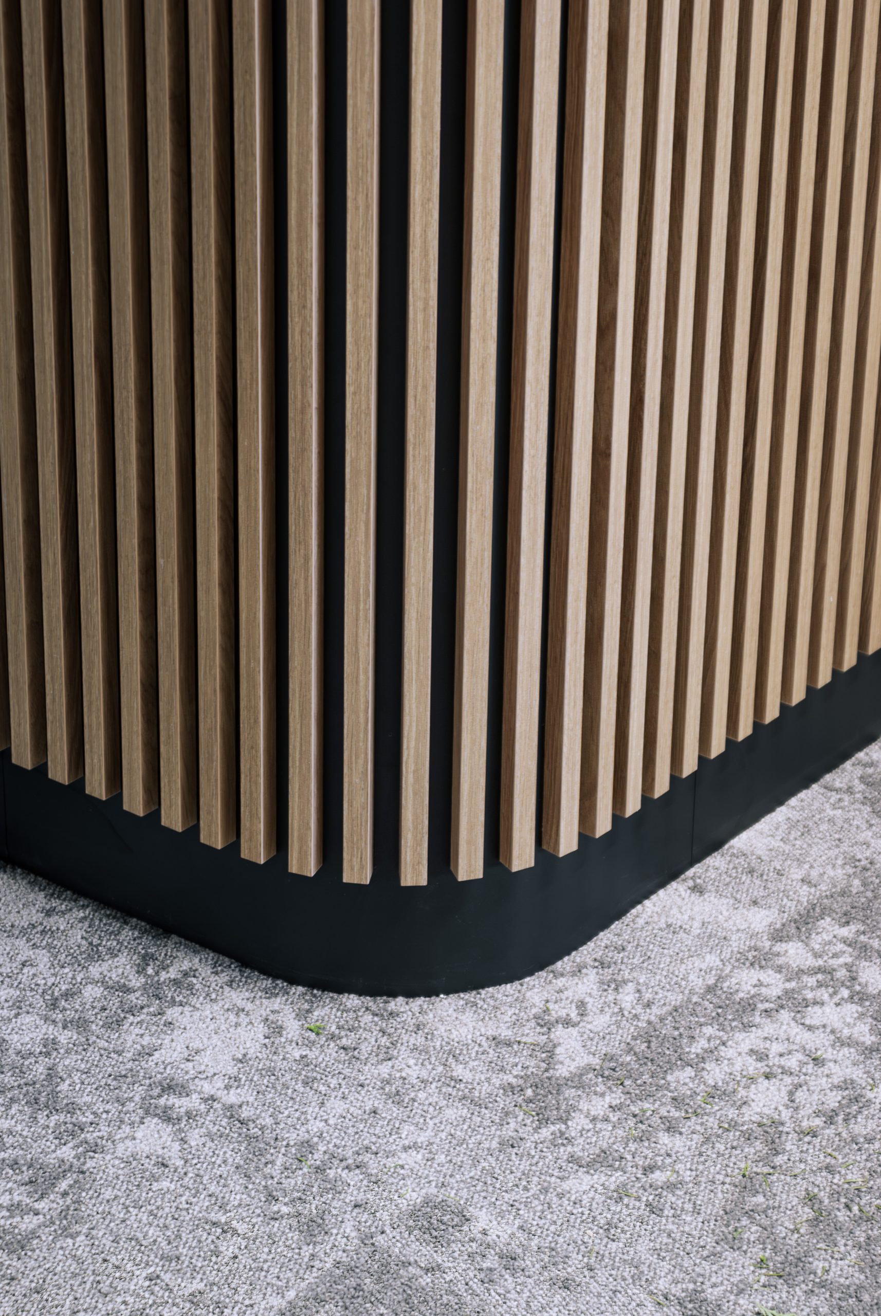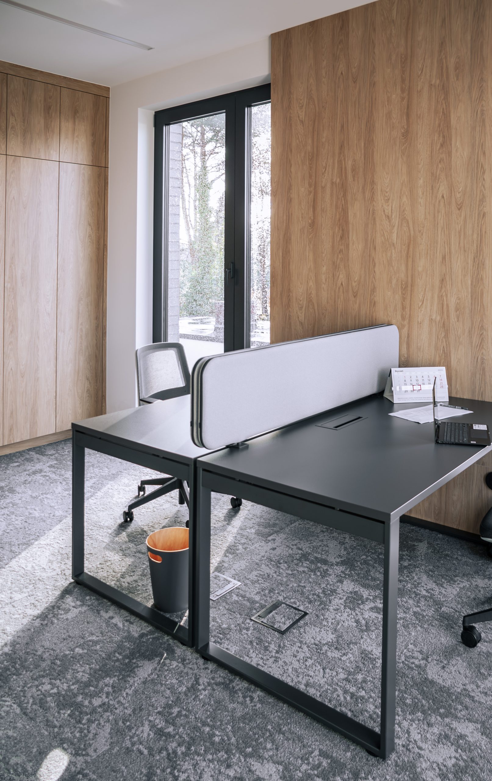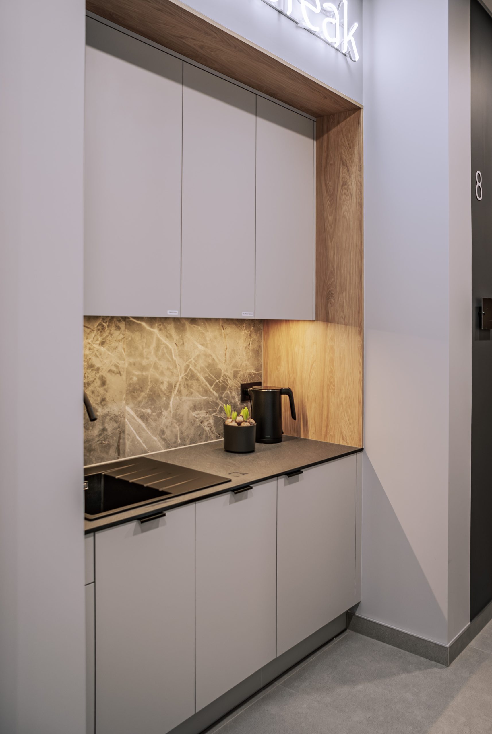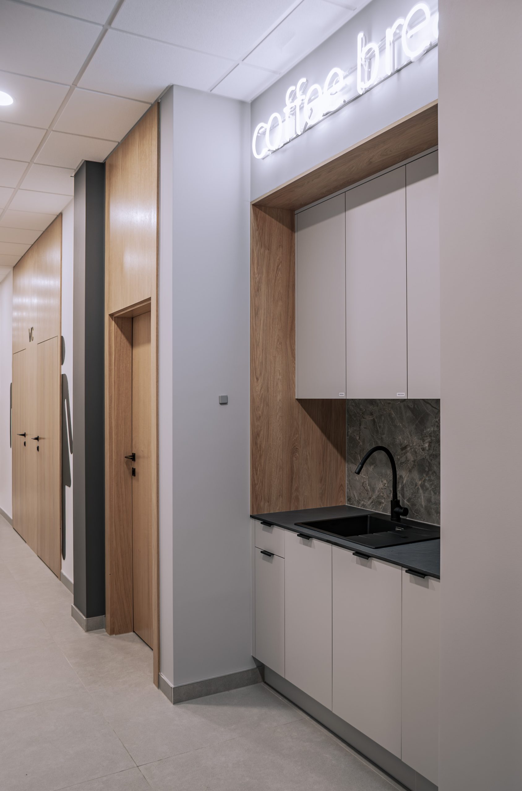 Aranżacja przestrzeni biurowej obejmowała ladę recepcyjną, salę konferencyjną, kuchnie pracowniczą oraz pomieszczenie do pracy. Połączenie czerni z drewnem tworzy nowoczesny i stylowy efekt, a subtelne szare dodatki w małej kuchni dodają całości harmonii. Zaokrąglona recepcja z dodatkiem lameli przyciąga wzrok już od wejścia. Zabudowa szaf pod sufit w biurze, zapewnia mnóstwo miejsca do przechowywania dokumentacji, a pojemne półki idealnie organizują przestrzeń. Szklana podświetlana gablota, otwarta półka oraz okładzina ścienna z płyty stały się elementem dekoracji, która wyróżnia tą przestrzeń.