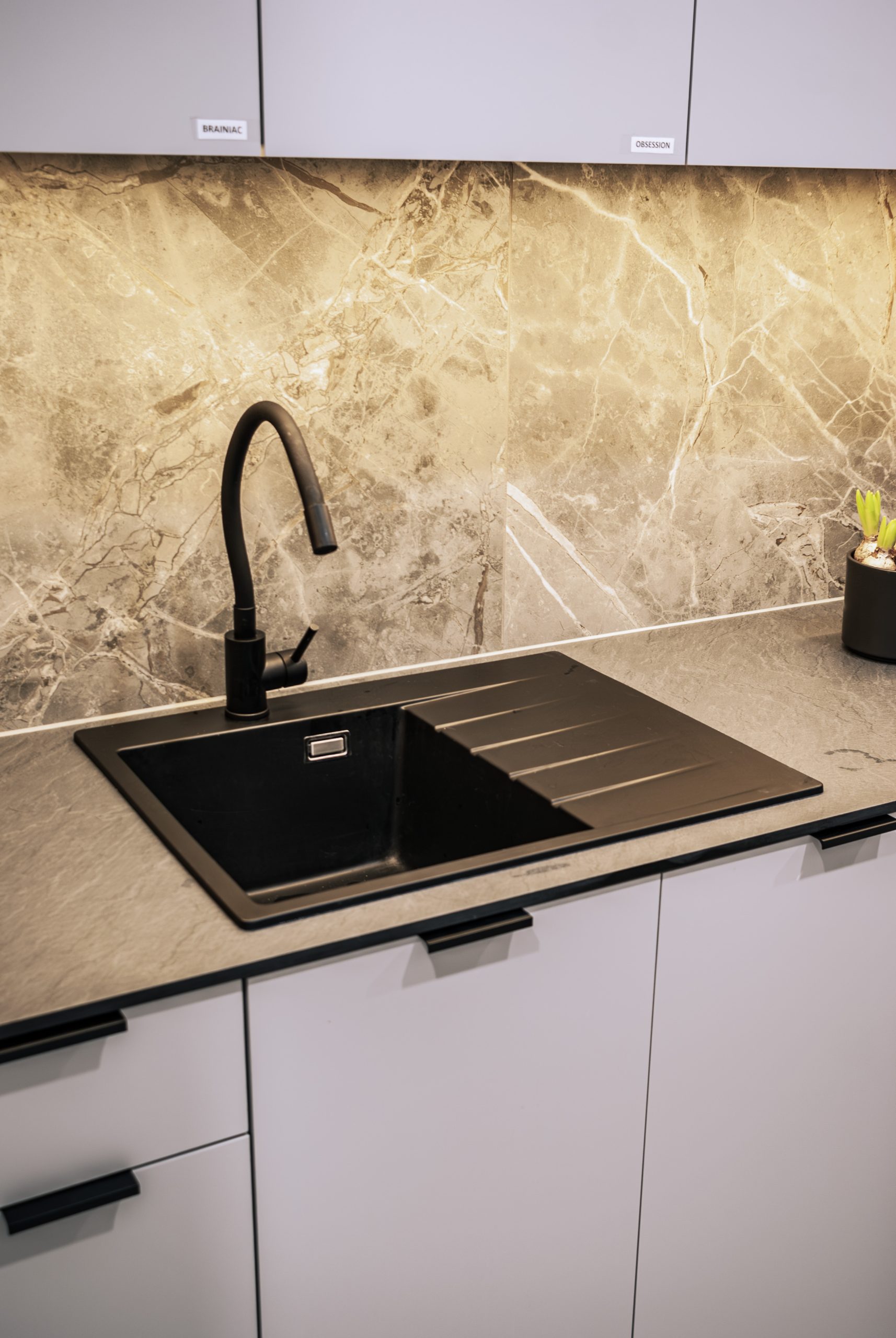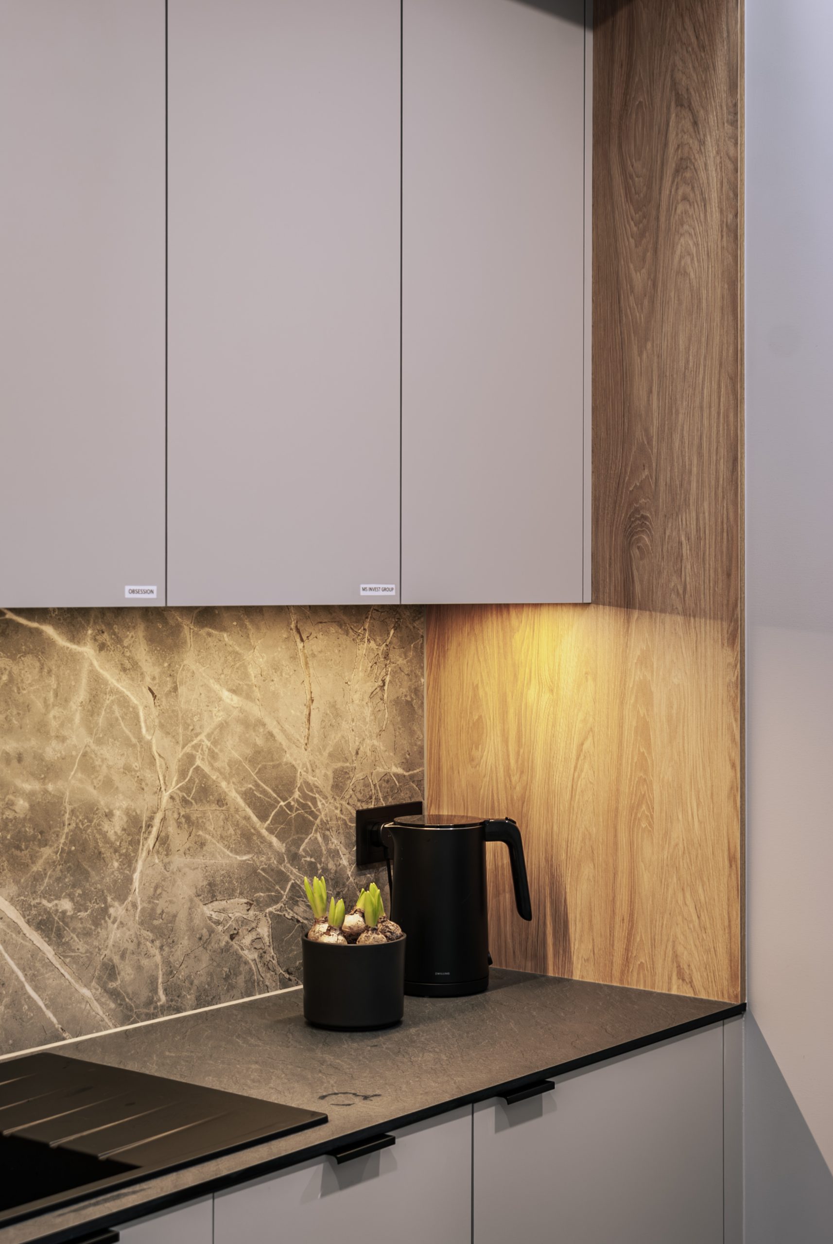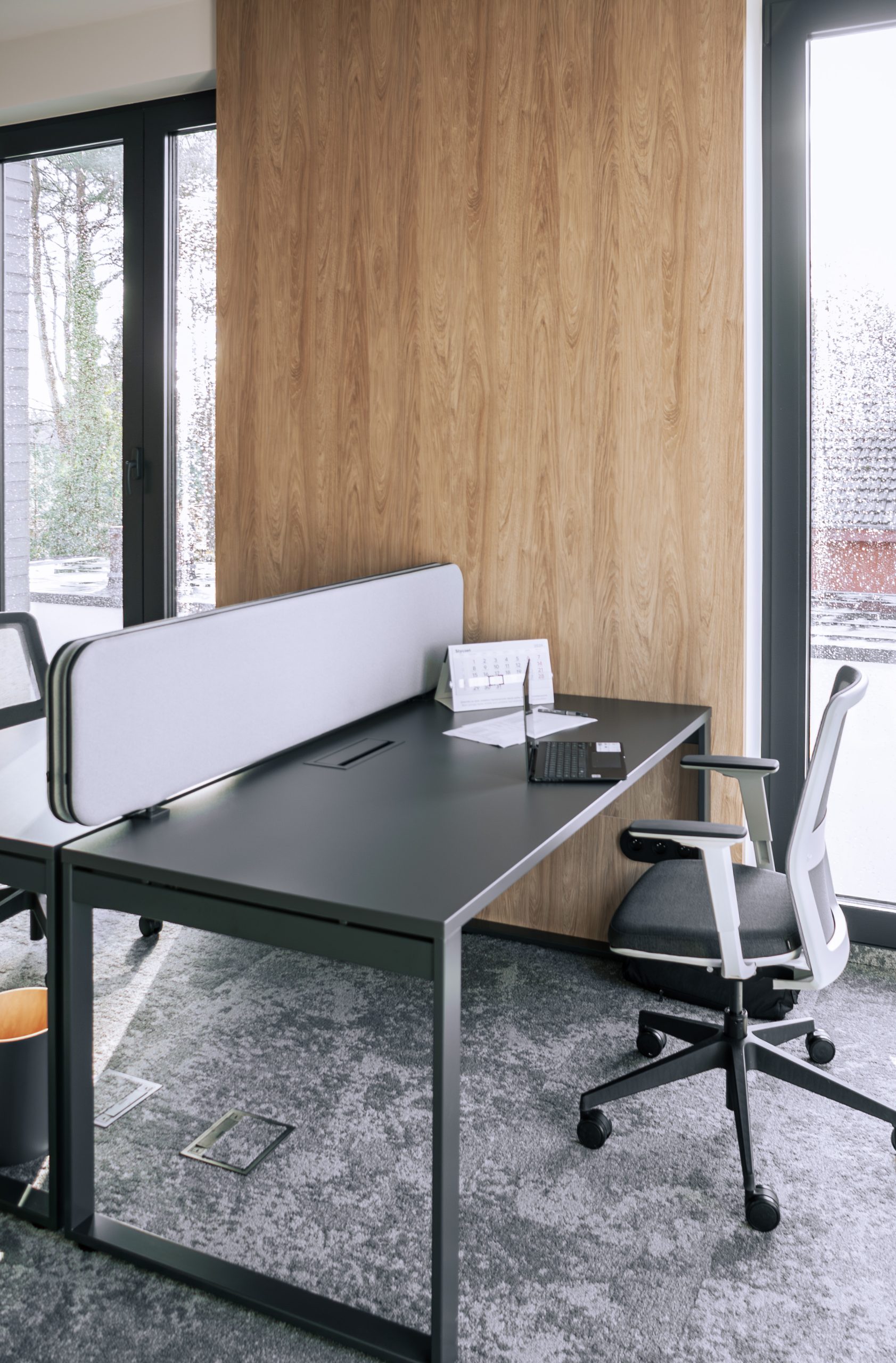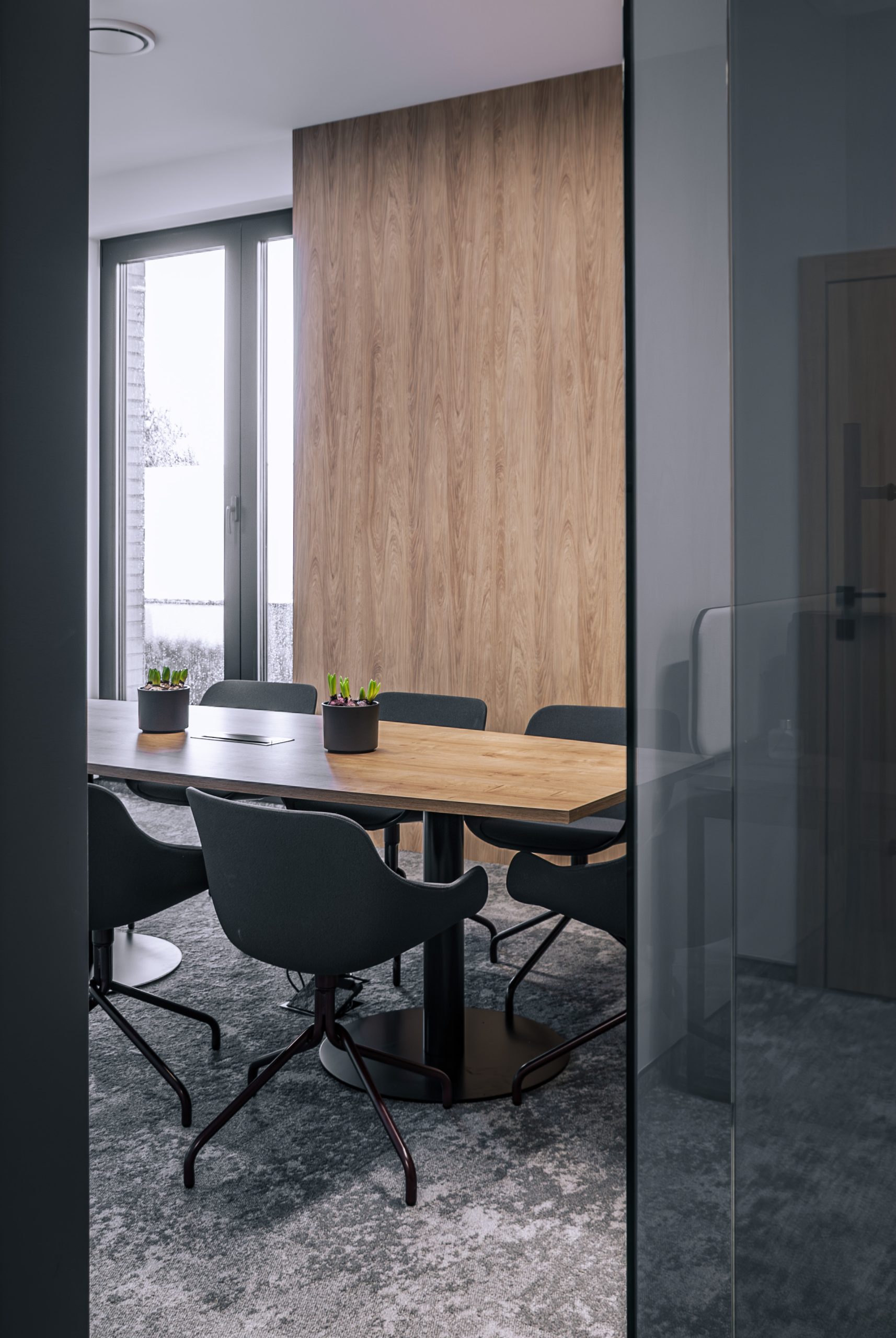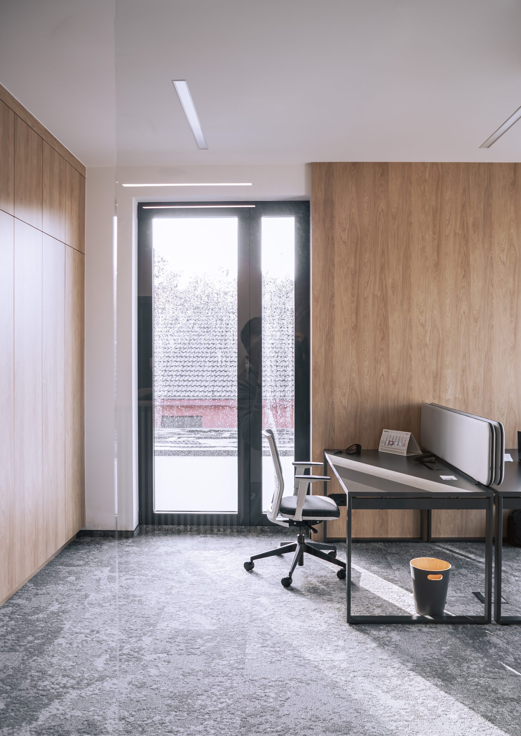 Aranżacja przestrzeni biurowej obejmowała ladę recepcyjną, salę konferencyjną, kuchnie pracowniczą oraz pomieszczenie do pracy. Połączenie czerni z drewnem tworzy nowoczesny i stylowy efekt, a subtelne szare dodatki w małej kuchni dodają całości harmonii. Zaokrąglona recepcja z dodatkiem lameli przyciąga wzrok już od wejścia. Zabudowa szaf pod sufit w biurze, zapewnia mnóstwo miejsca do przechowywania dokumentacji, a pojemne półki idealnie organizują przestrzeń. Szklana podświetlana gablota, otwarta półka oraz okładzina ścienna z płyty stały się elementem dekoracji, która wyróżnia tą przestrzeń.